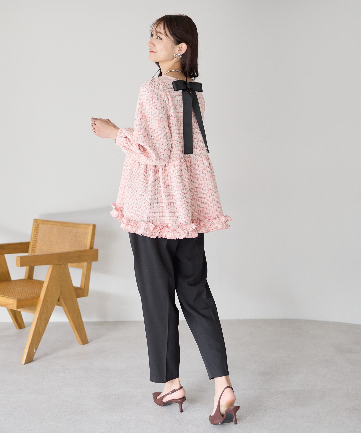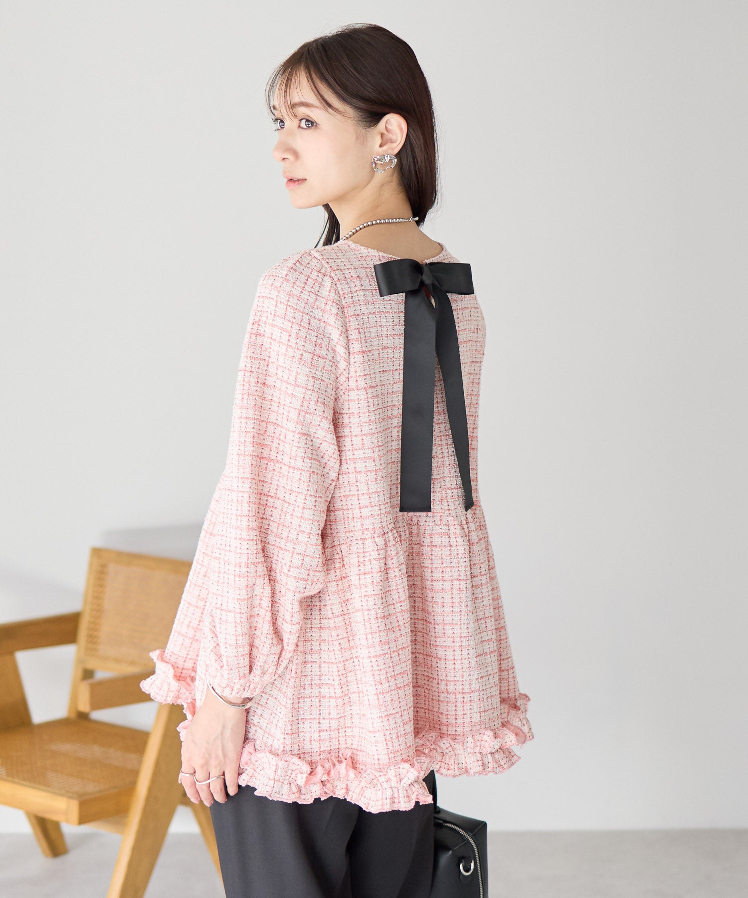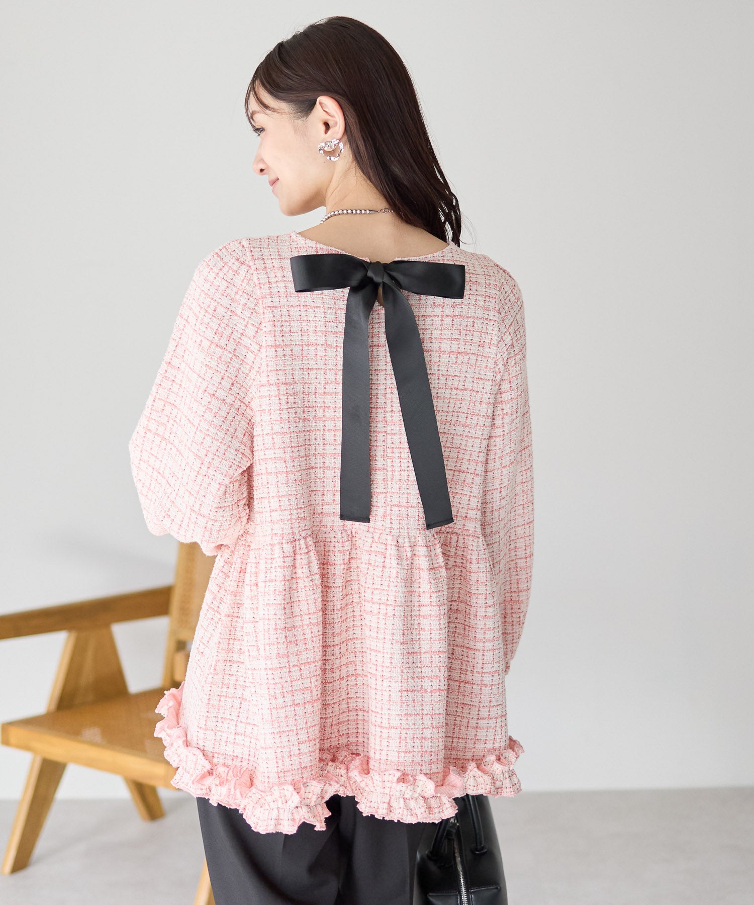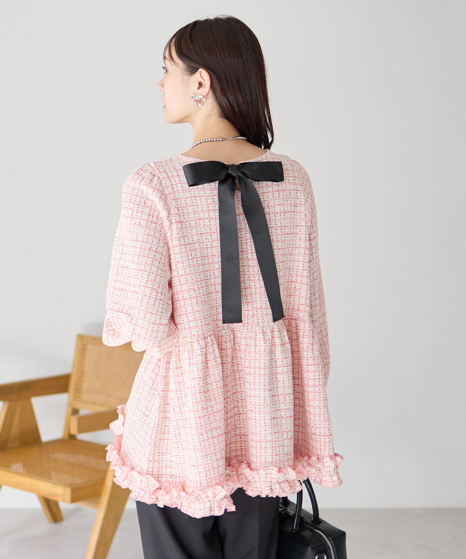 上品なツイードにバックリボンを添えた、大人フェミニンな一枚。