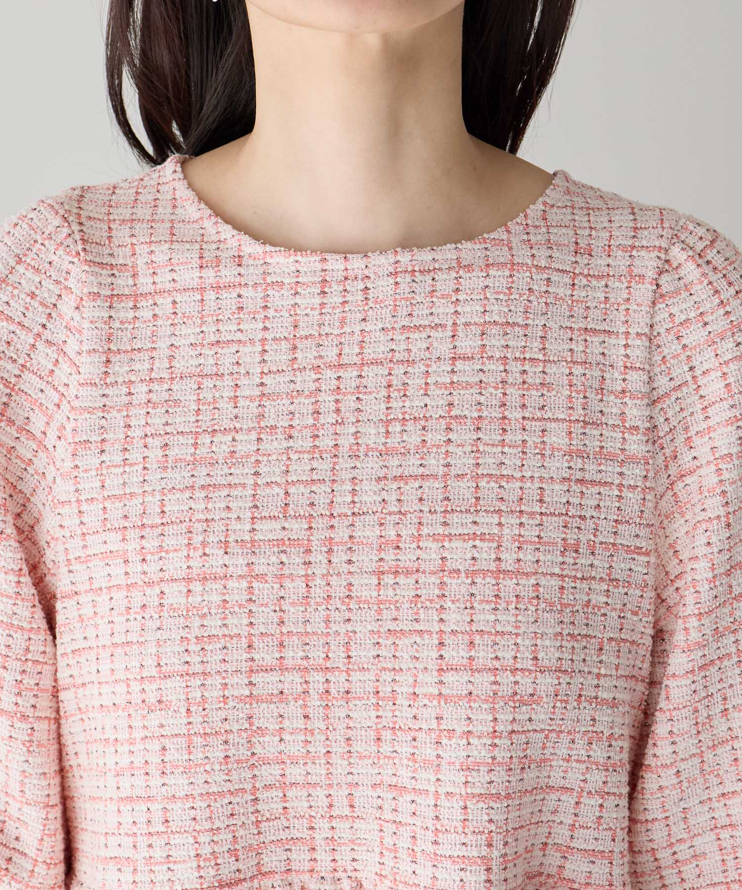 ほんのりラメ糸を織り交ぜたツイード生地が、動くたびに上品な輝きを添え、装いにさりげない華やぎをプラス。