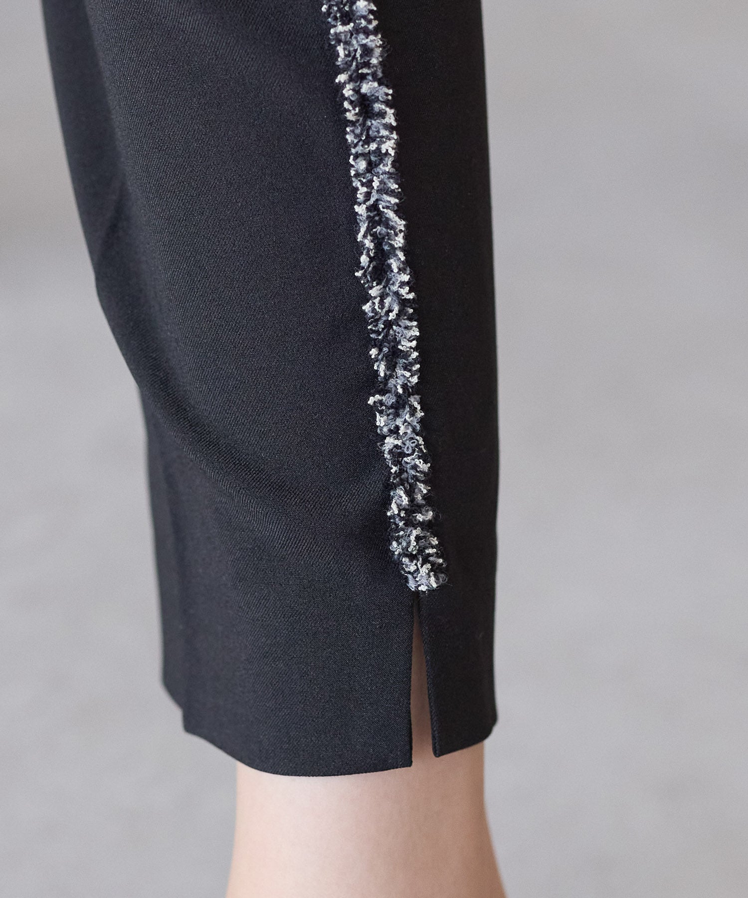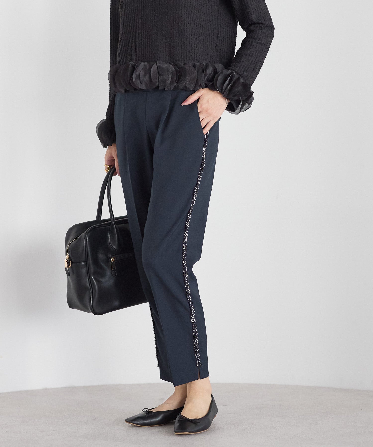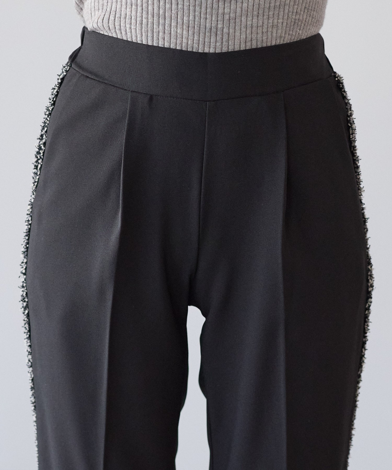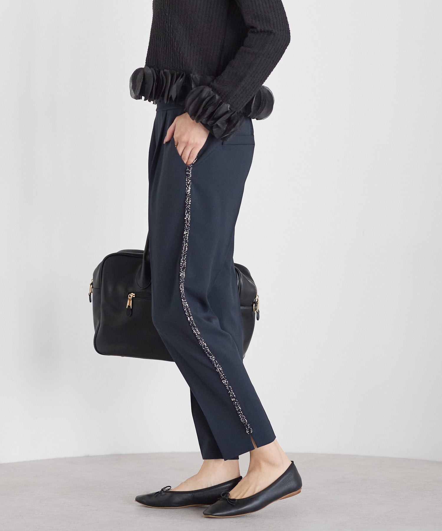 サイドにあしらったツイードラインが、上品で洗練された印象を添えるテーパードパンツ。