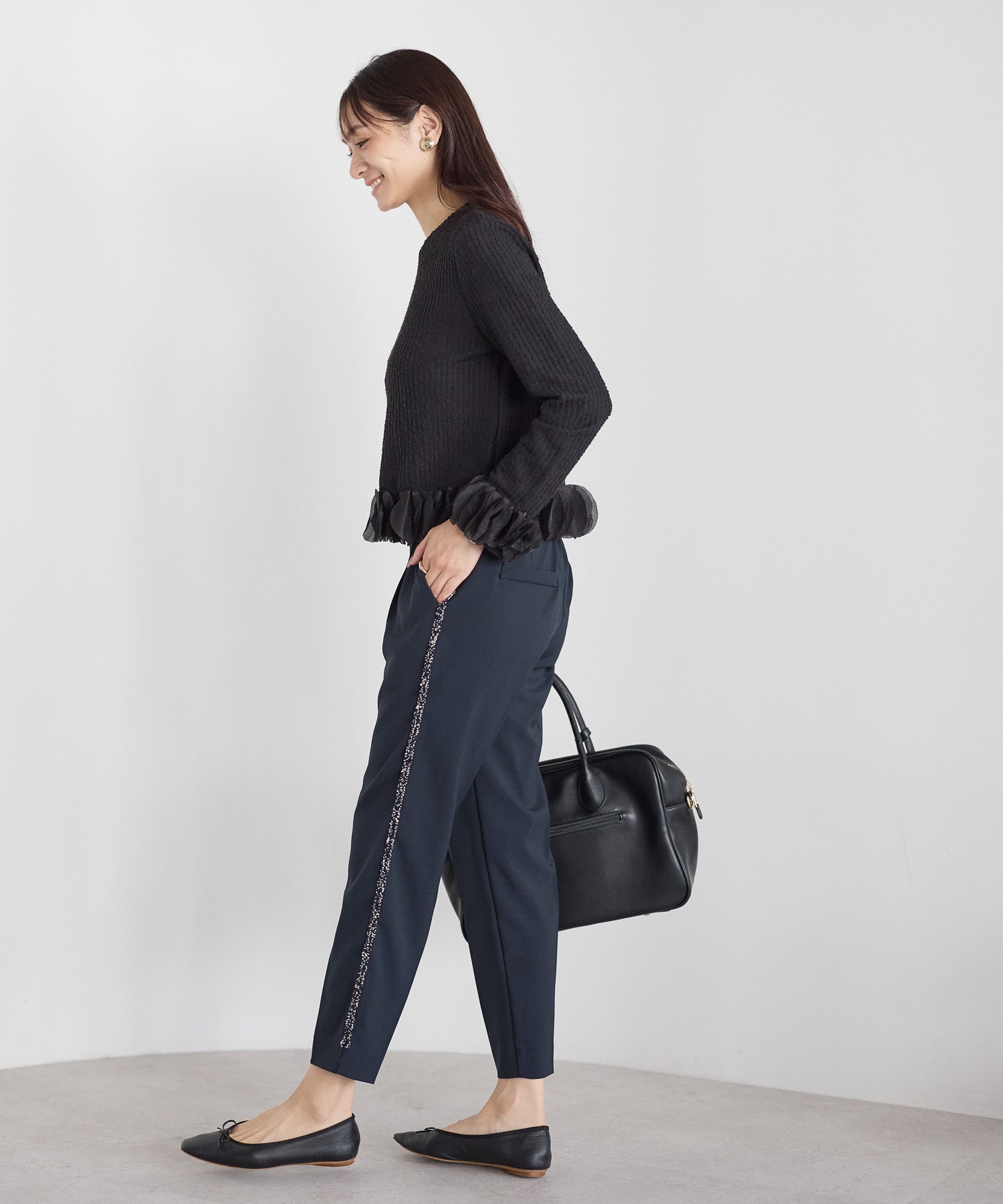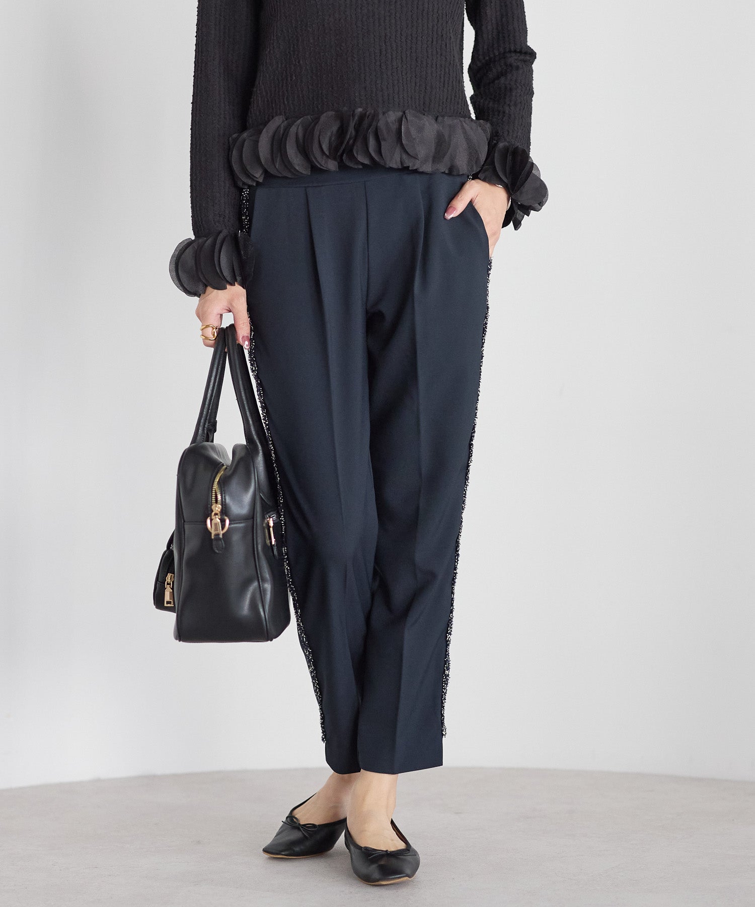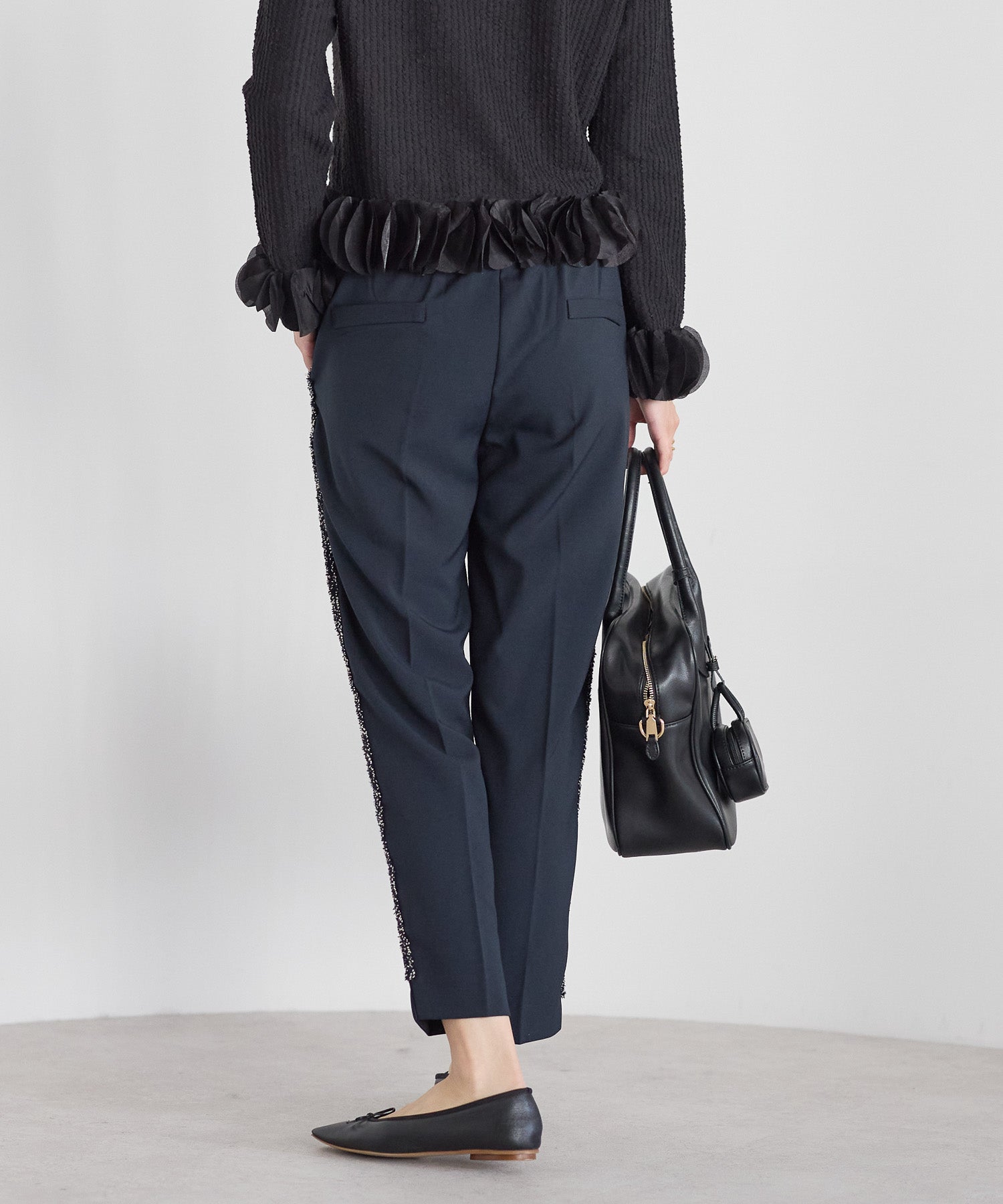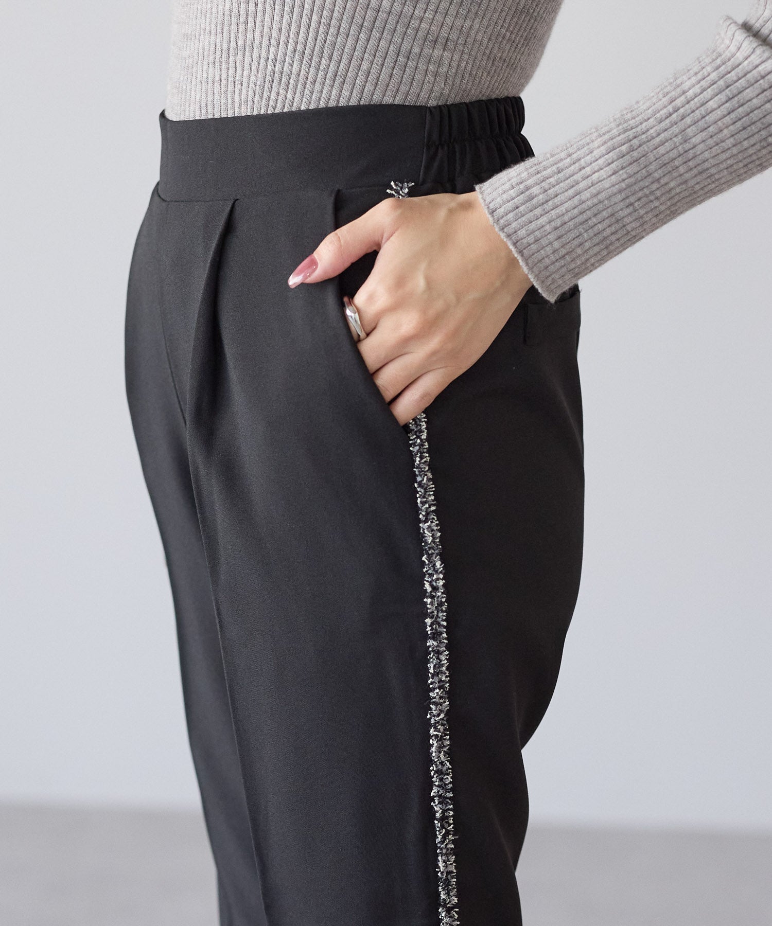 サイドにあしらったツイードラインが、上品で洗練された印象を添えるテーパードパンツ。
