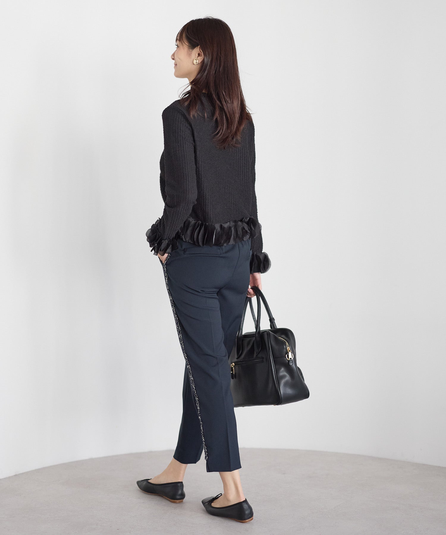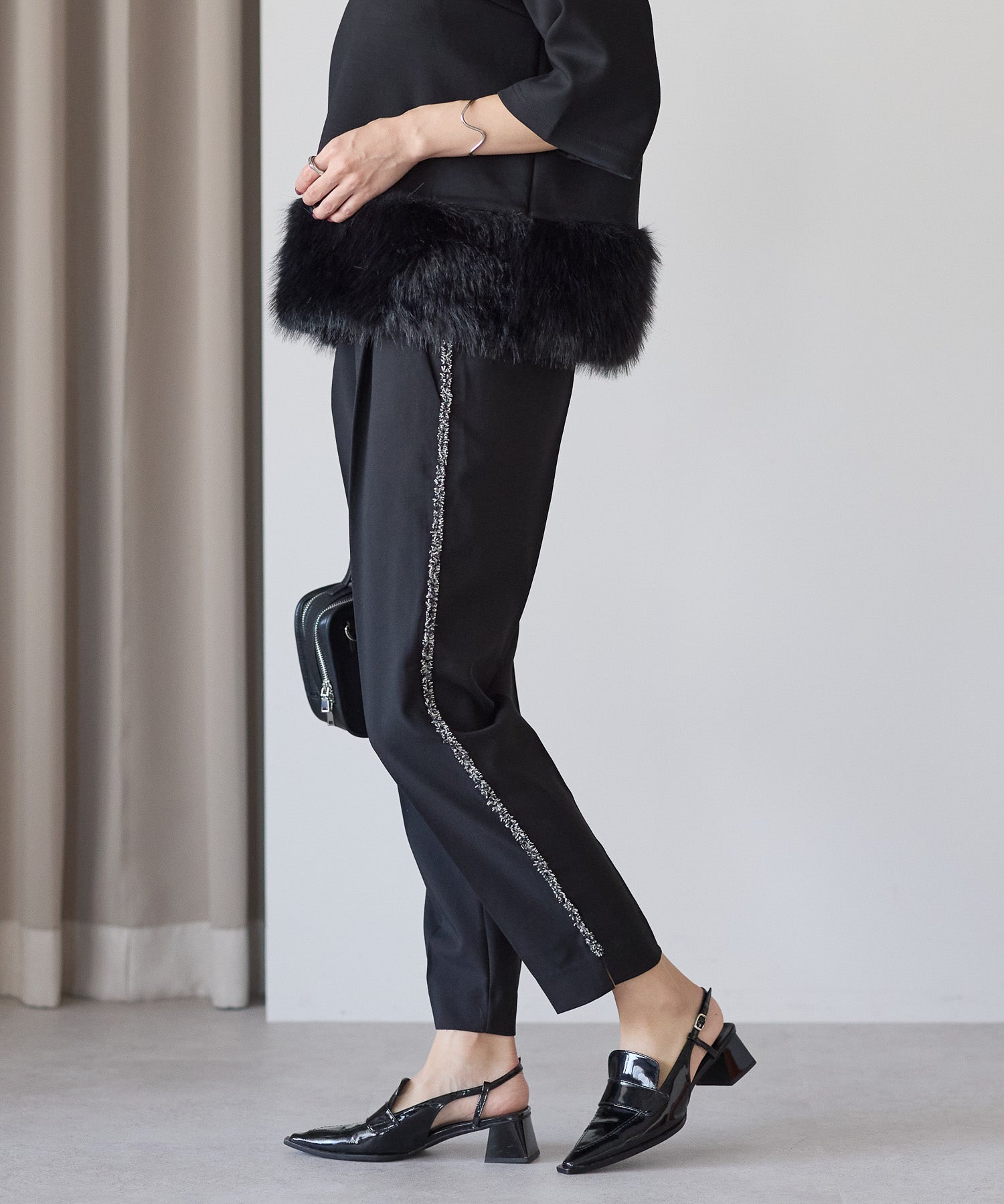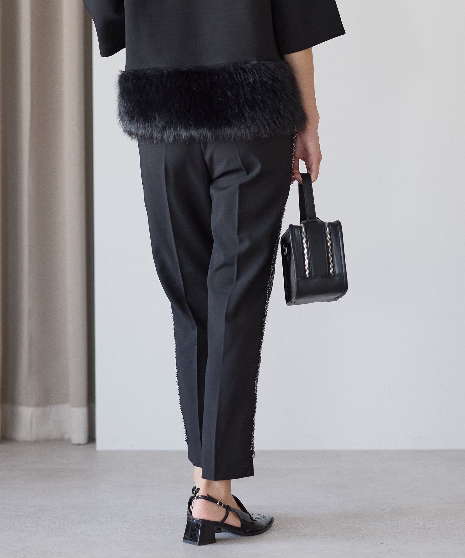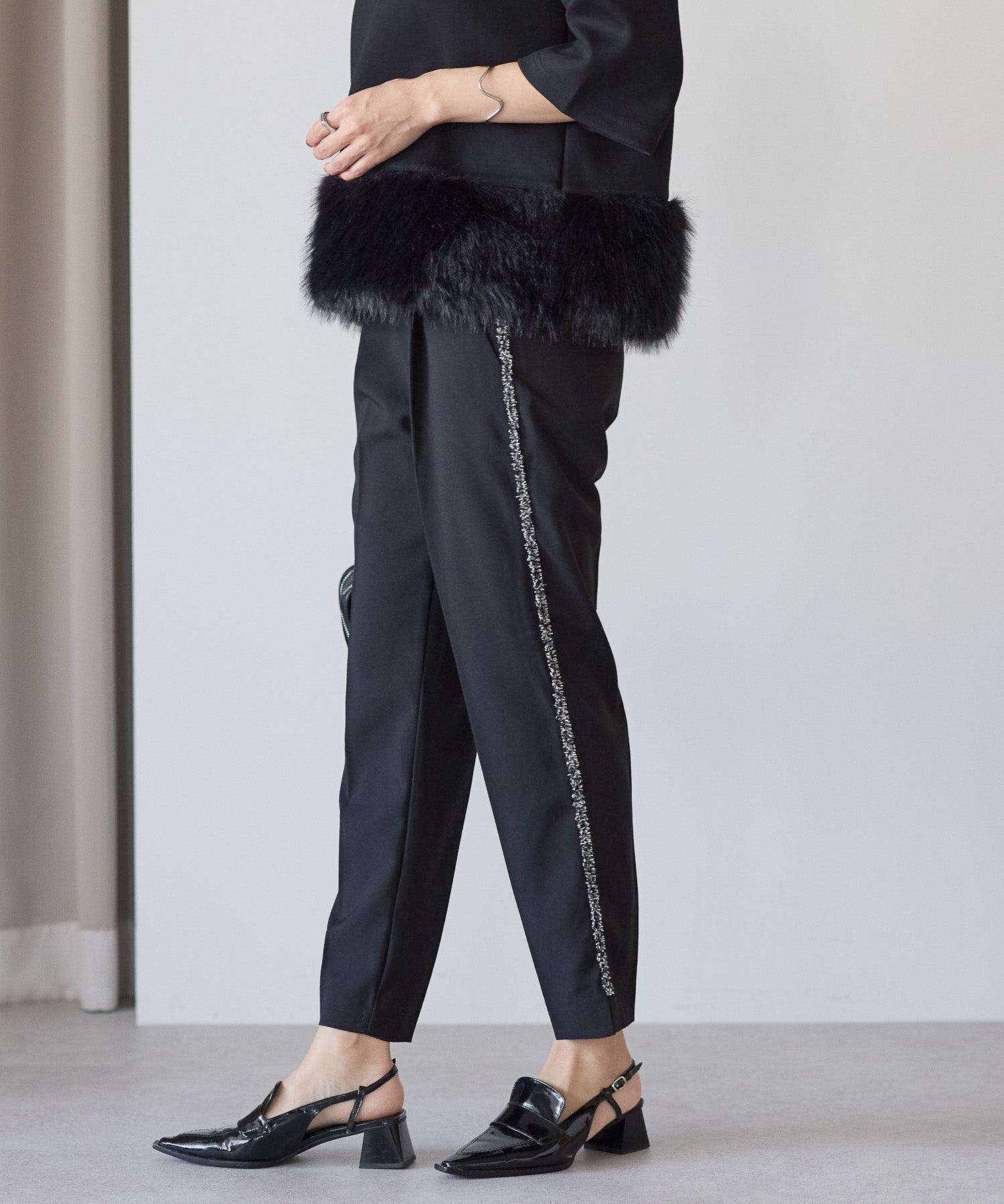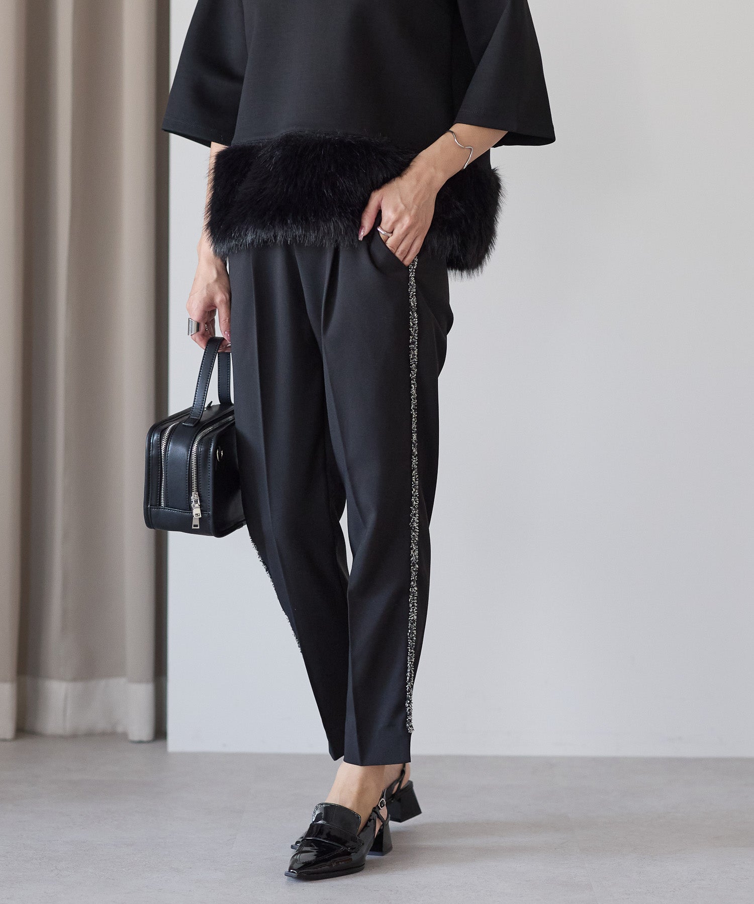 サイドにあしらったツイードラインが、上品で洗練された印象を添えるテーパードパンツ。