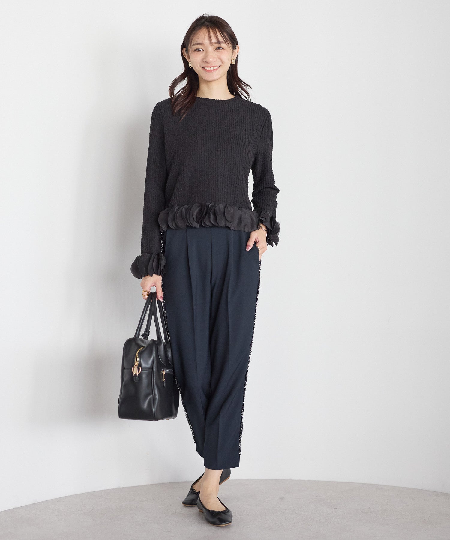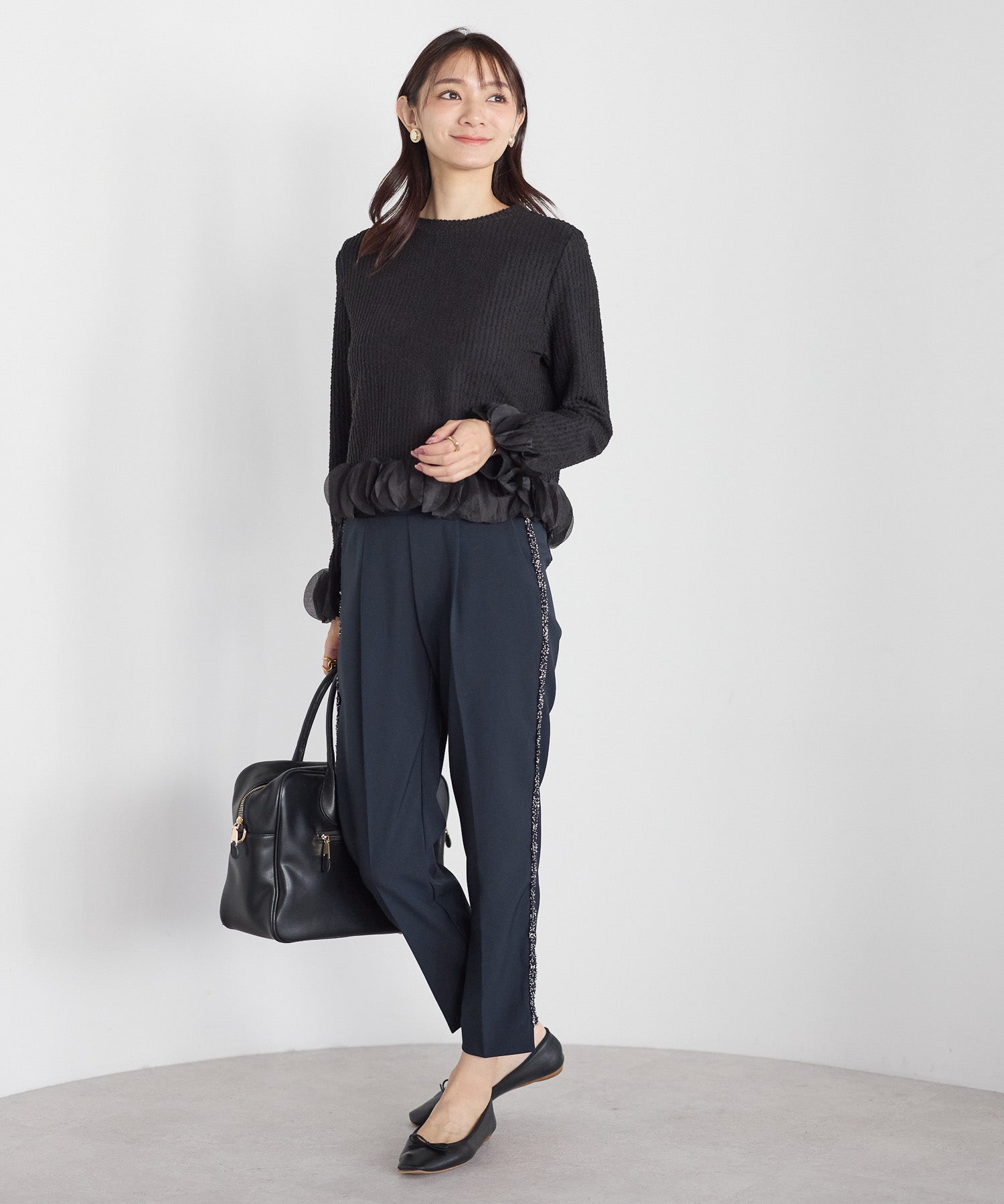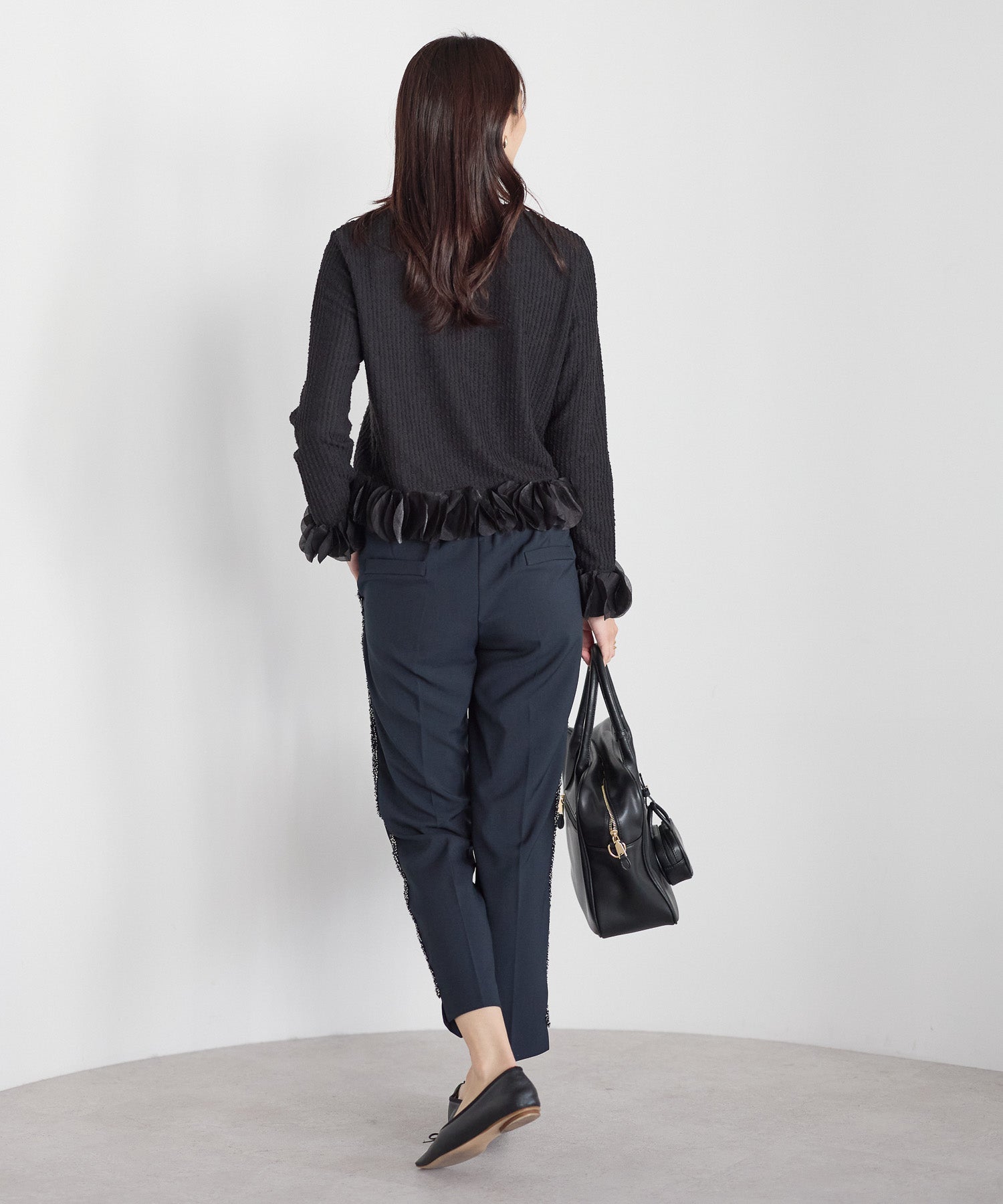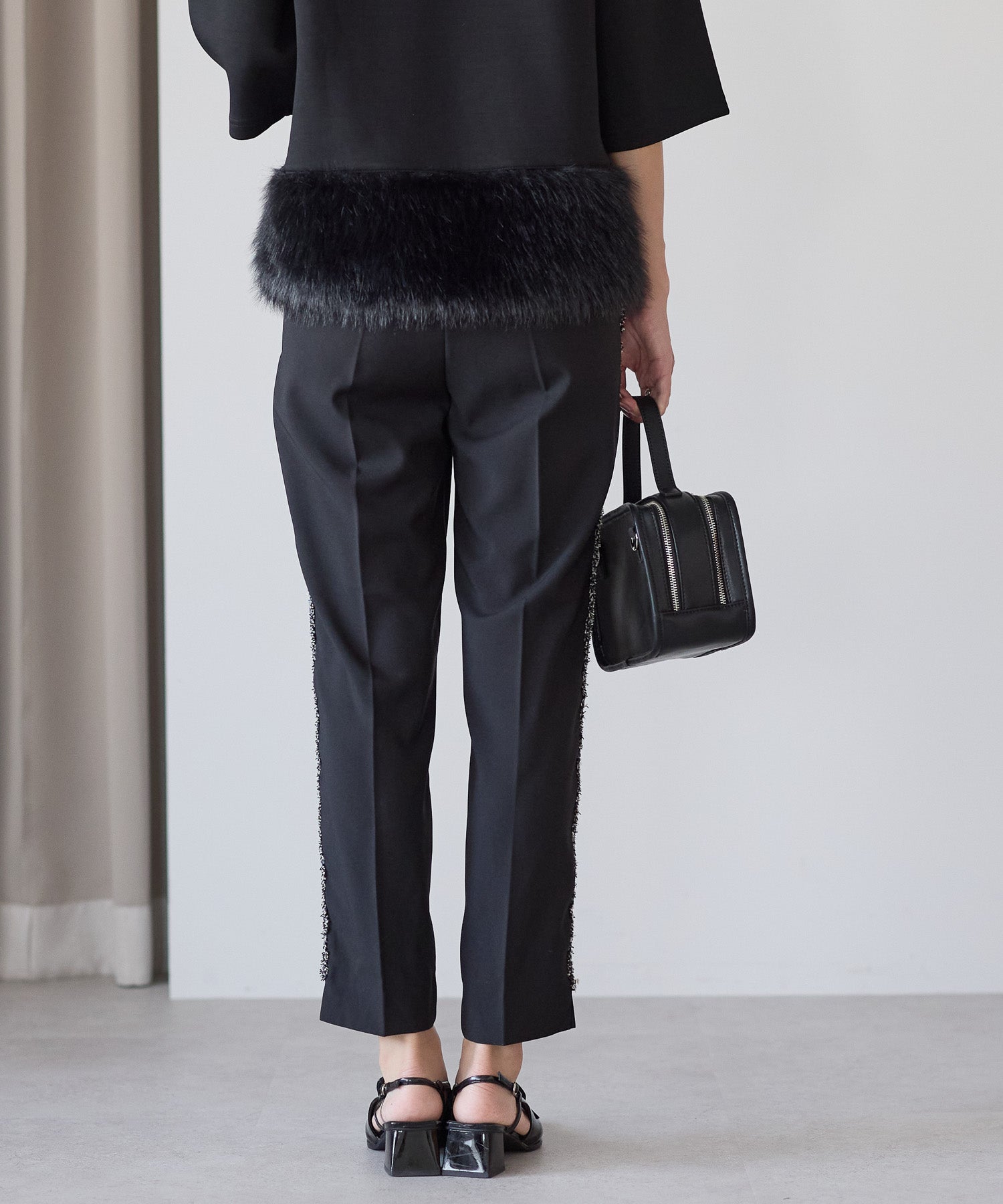 サイドにあしらったツイードラインが、上品で洗練された印象を添えるテーパードパンツ。