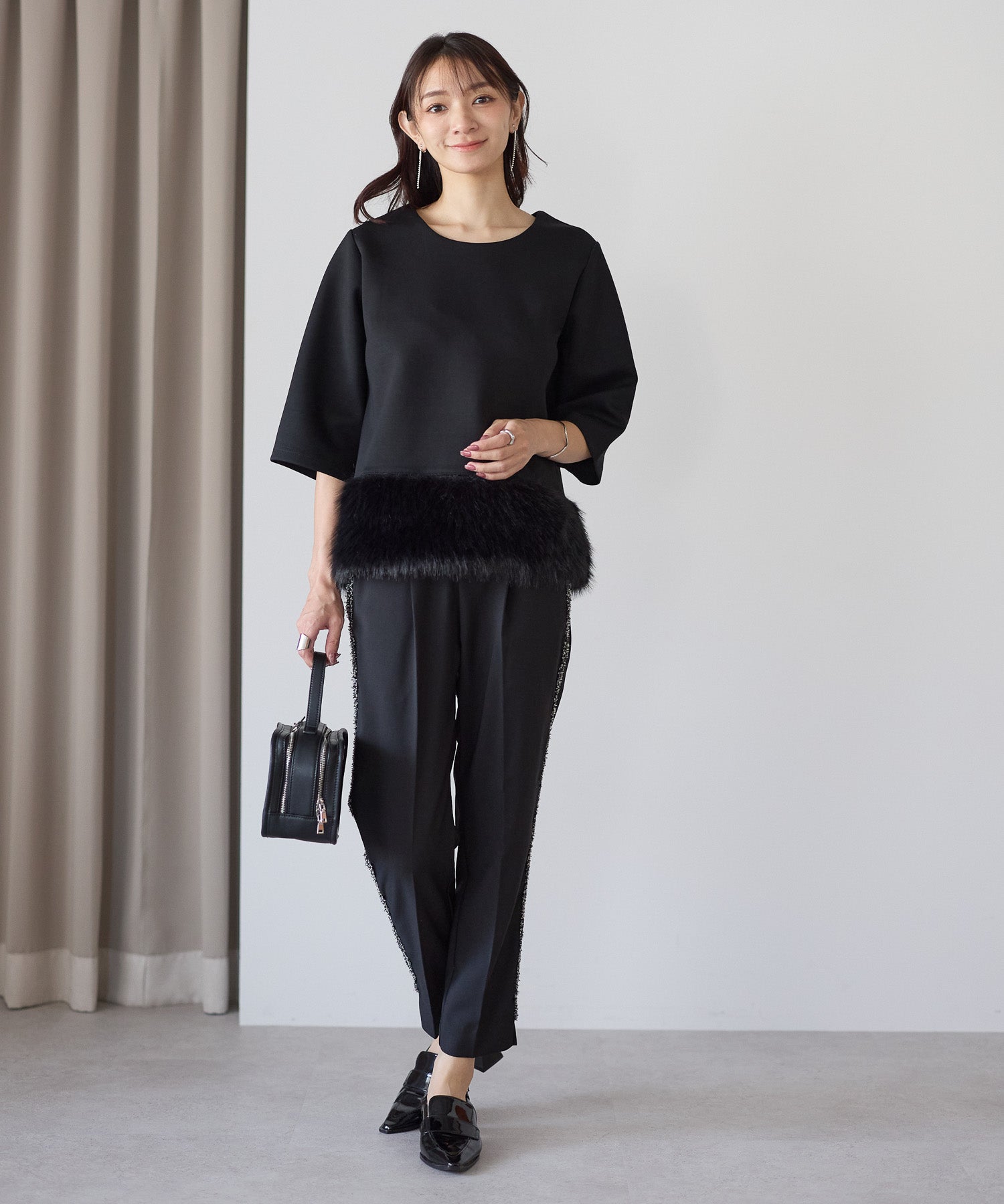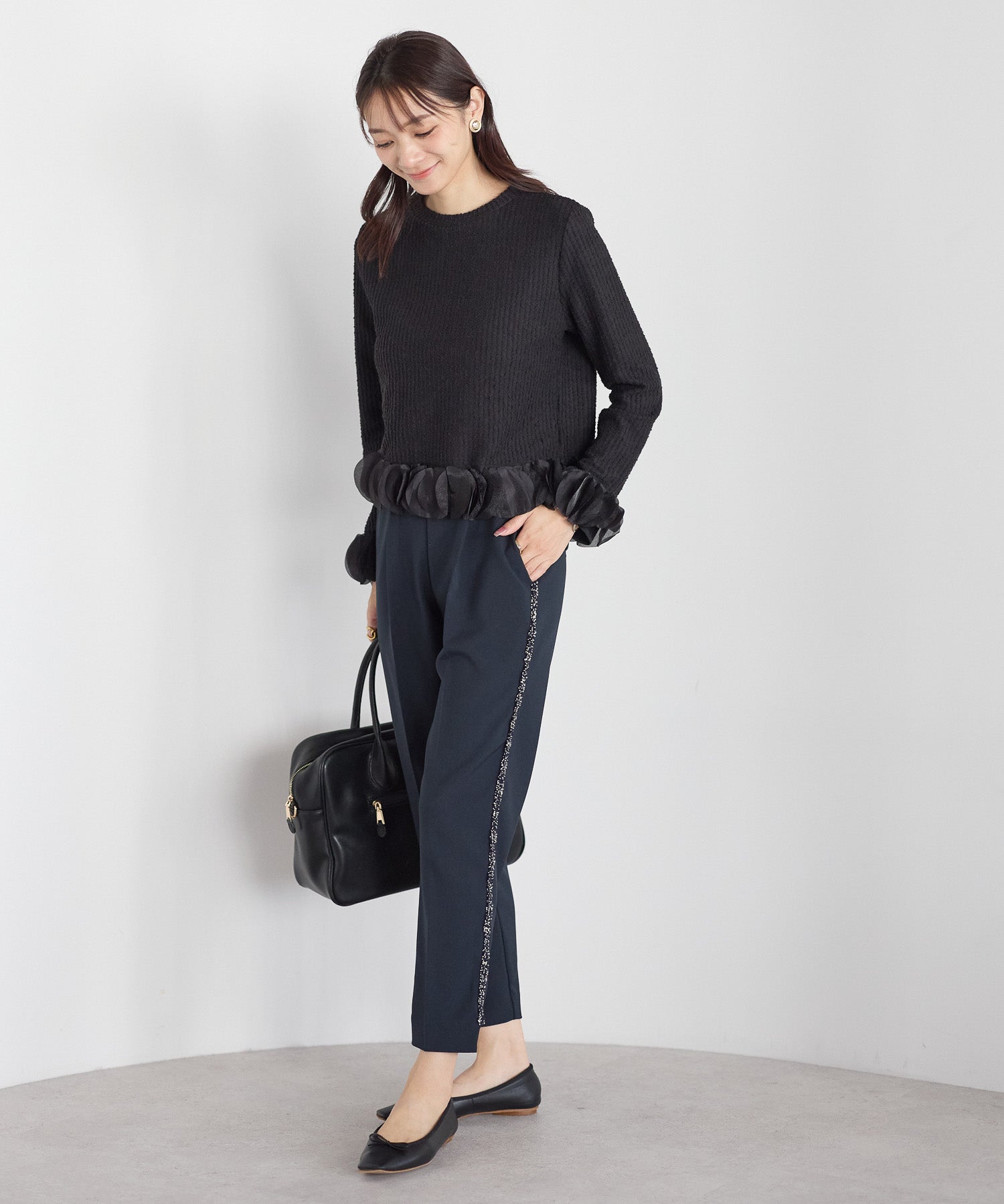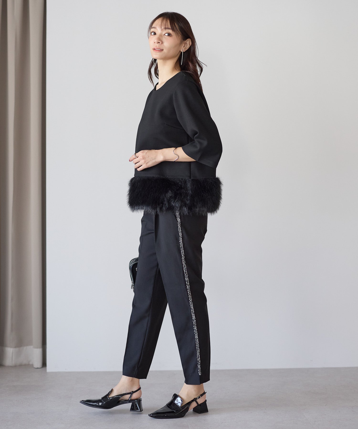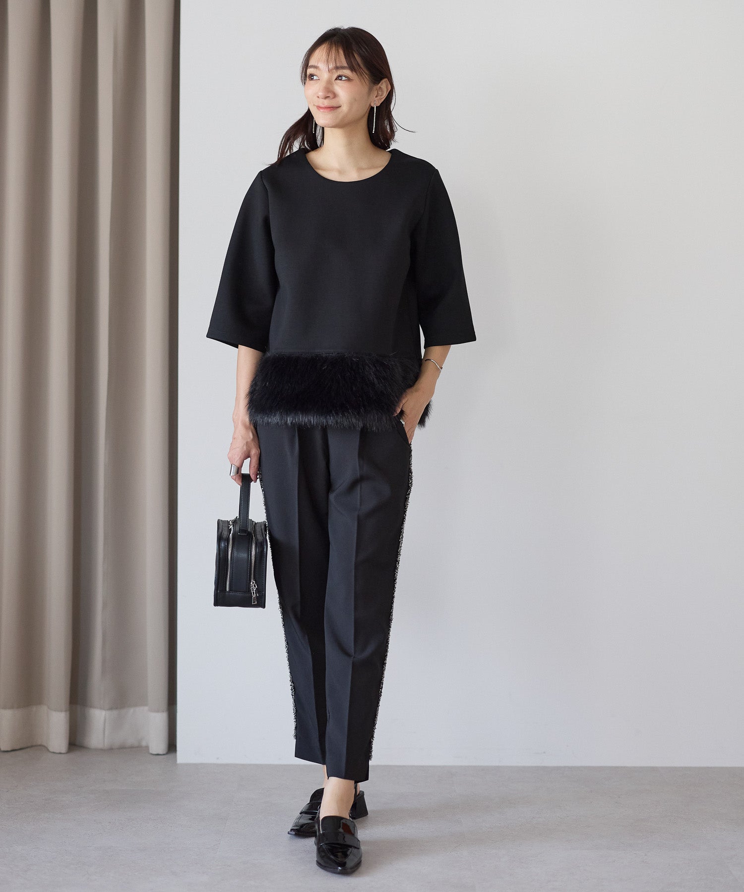 サイドにあしらったツイードラインが、上品で洗練された印象を添えるテーパードパンツ。