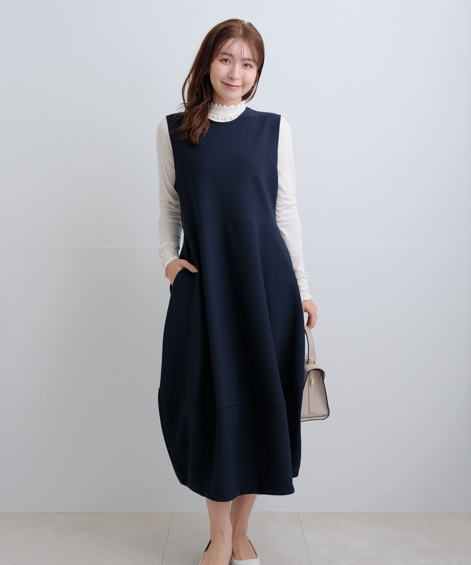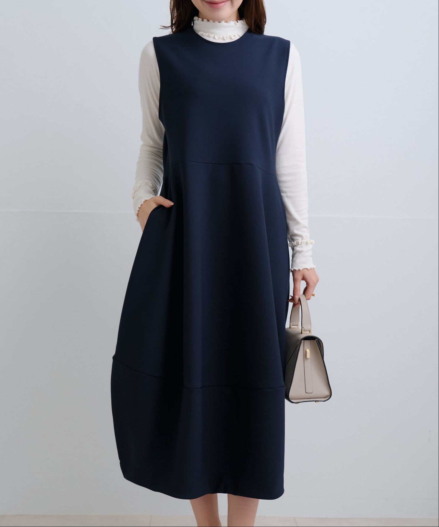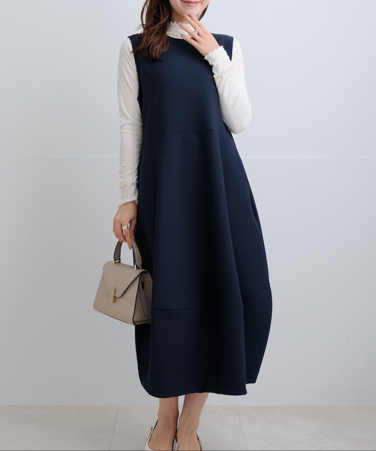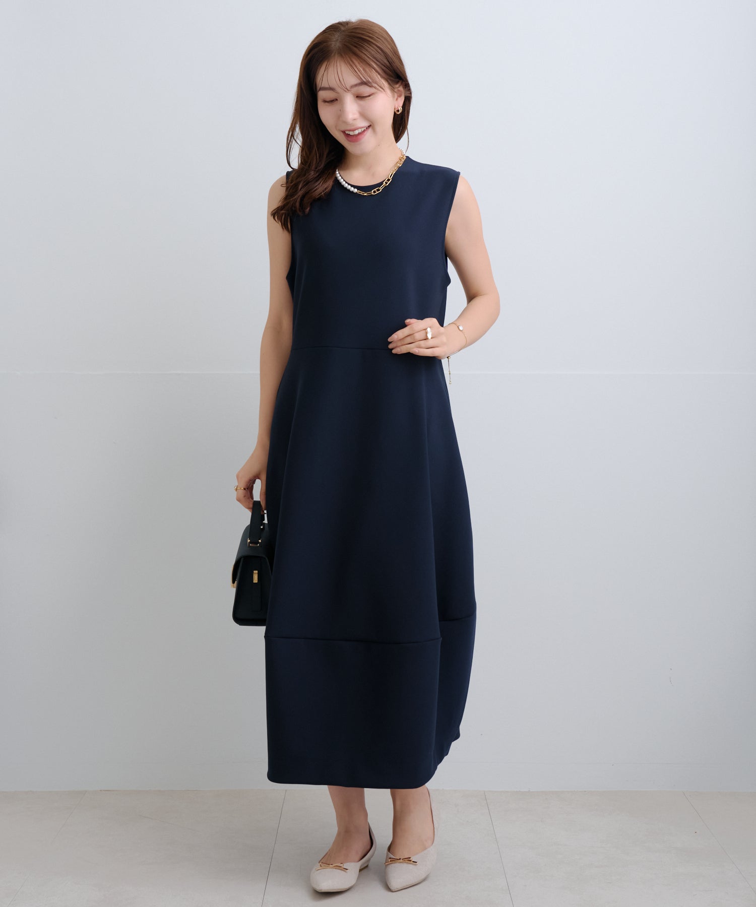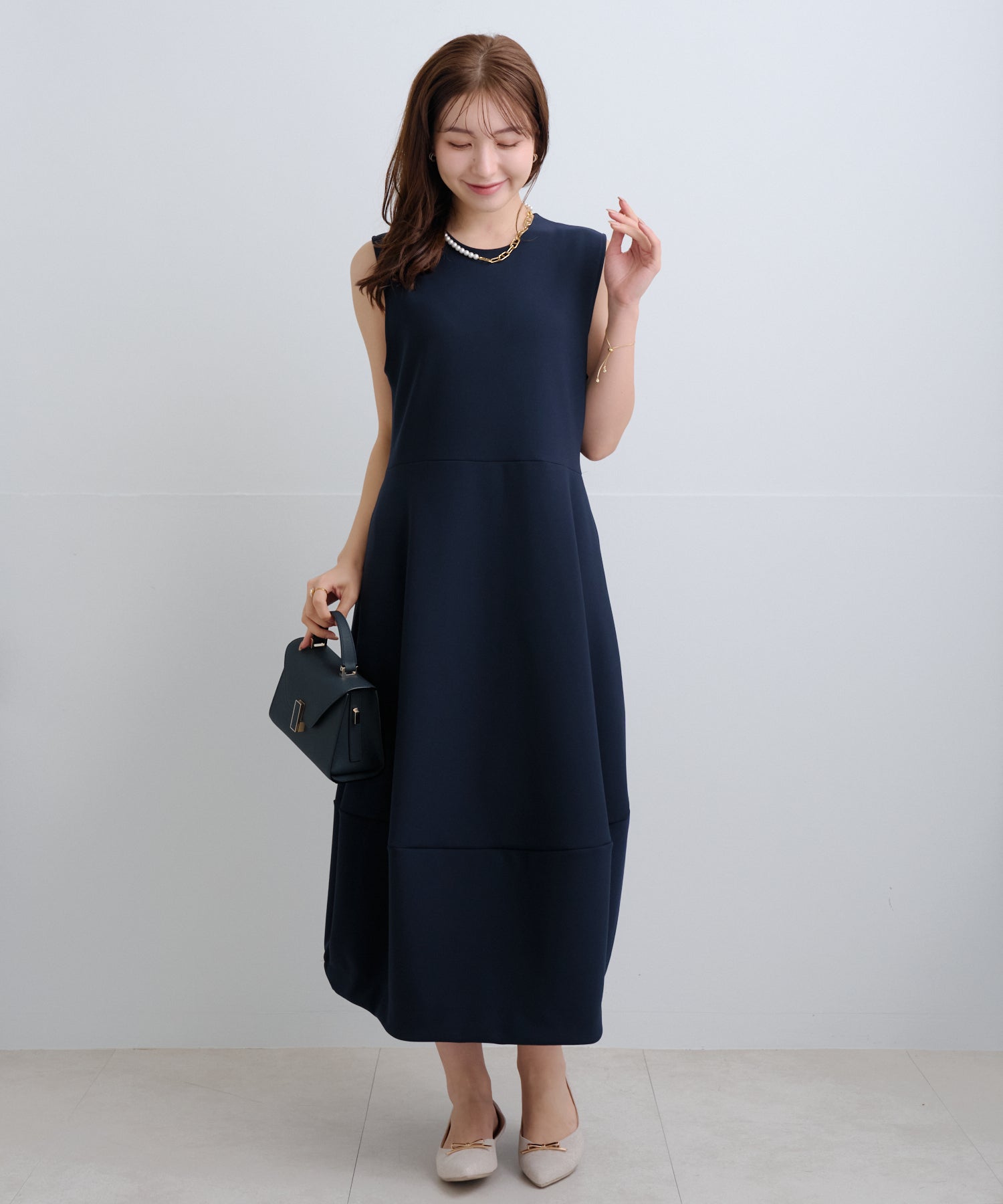 上身頃はすっきりとしたノースリーブデザインで、顔まわりをシャープに。ウエスト切替から裾にかけて、緩やかに内側へカーブする立体的なコクーンラインが、身体のラインを拾いすぎず自然にスタイルアップを叶えます。