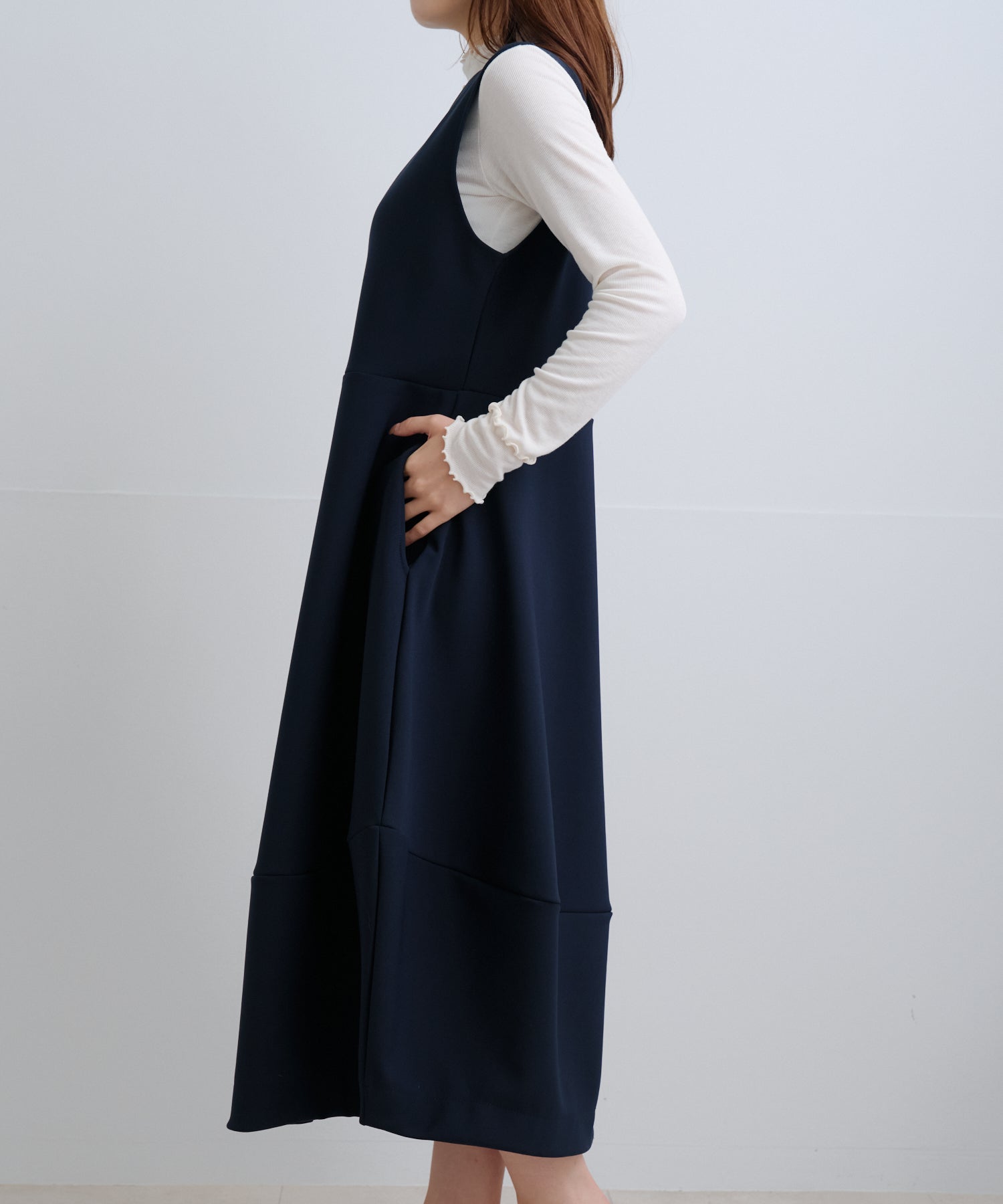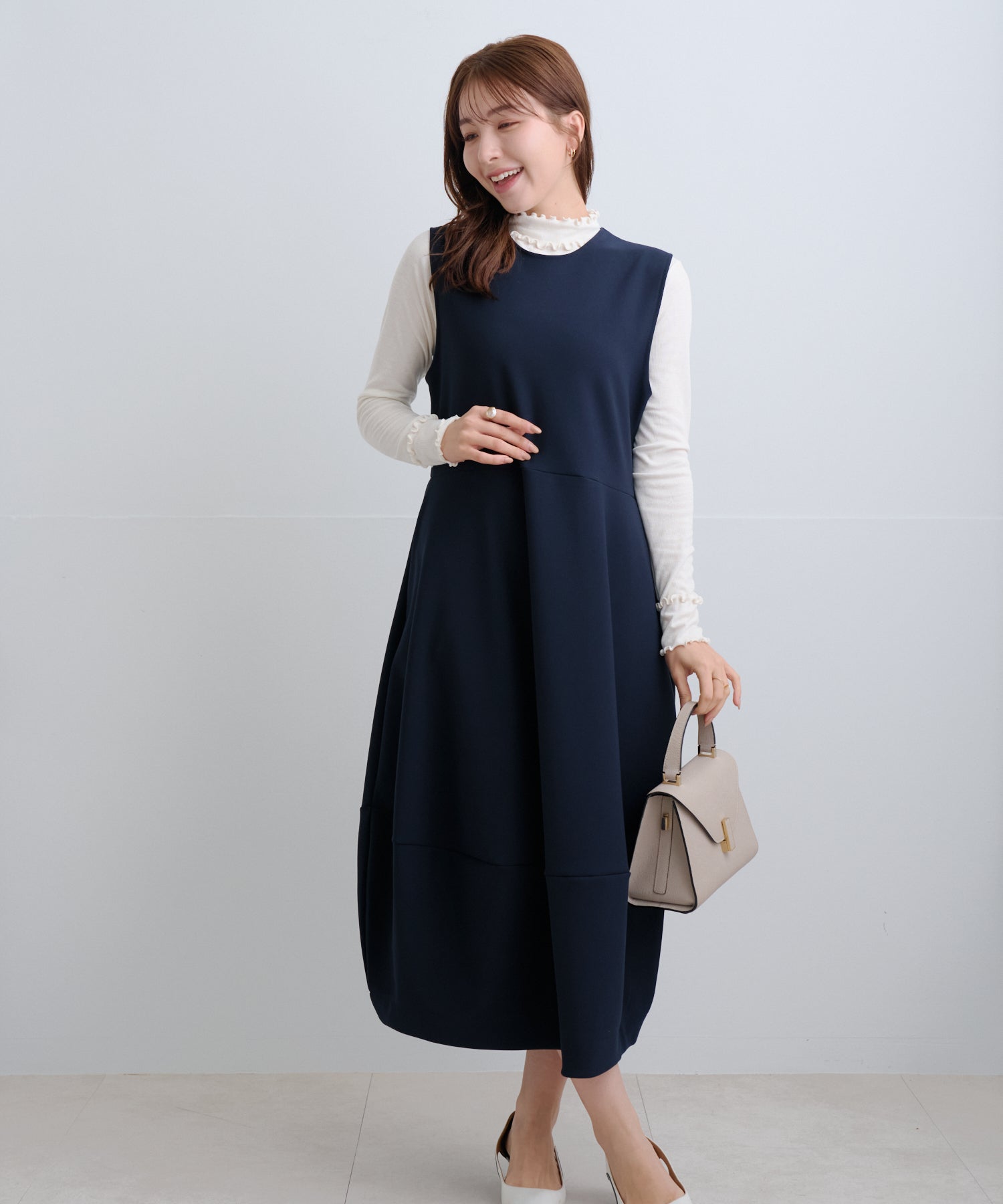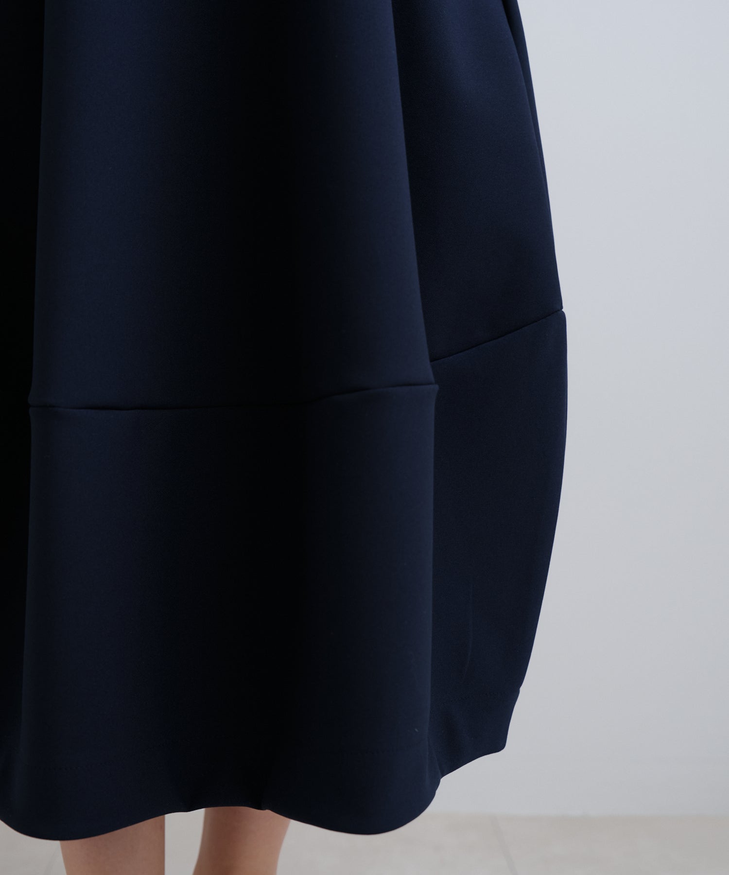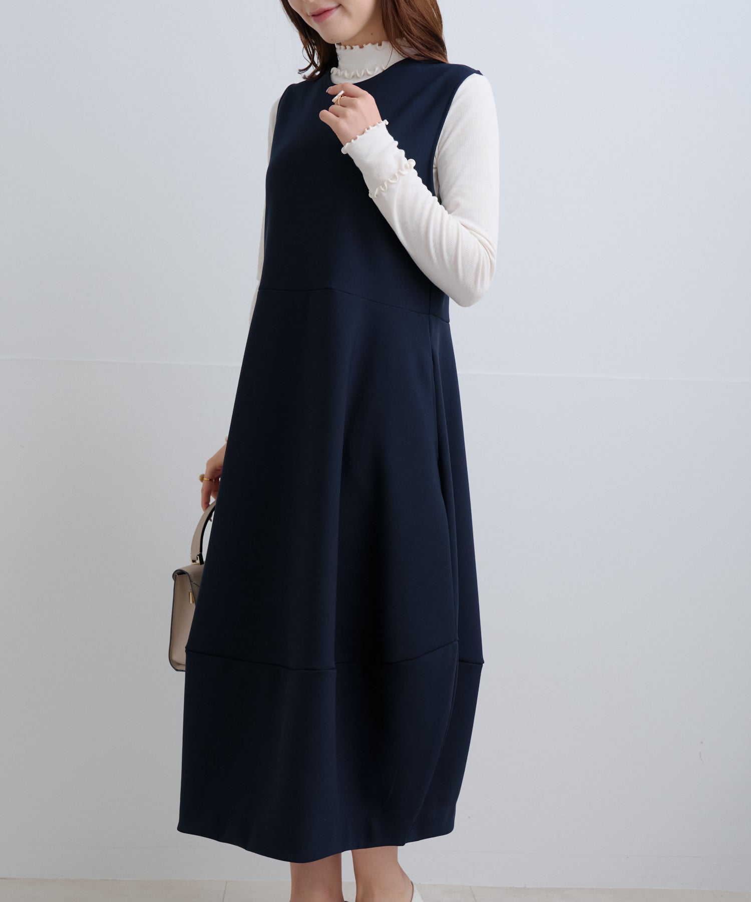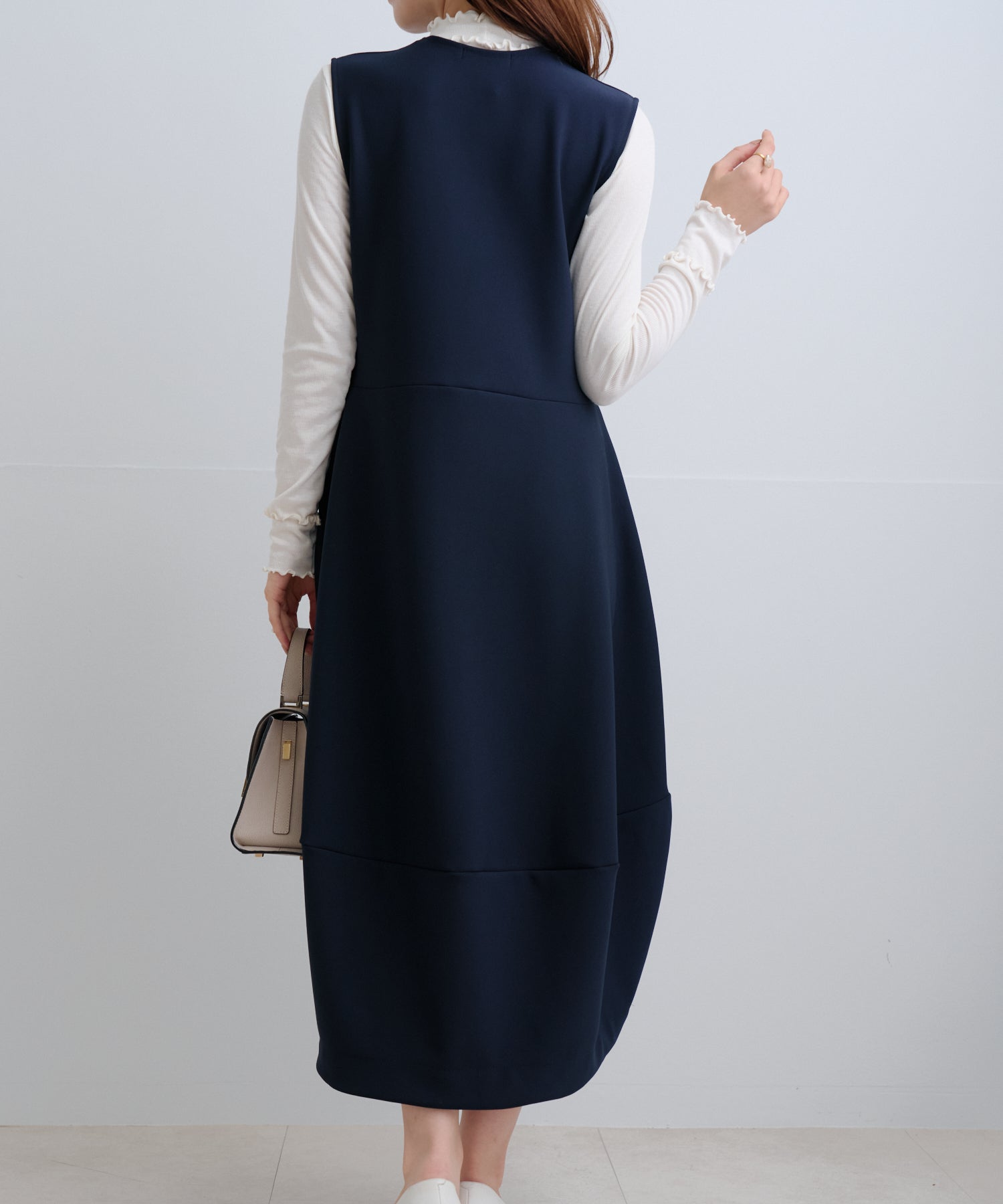 上身頃はすっきりとしたノースリーブデザインで、顔まわりをシャープに。ウエスト切替から裾にかけて、緩やかに内側へカーブする立体的なコクーンラインが、身体のラインを拾いすぎず自然にスタイルアップを叶えます。