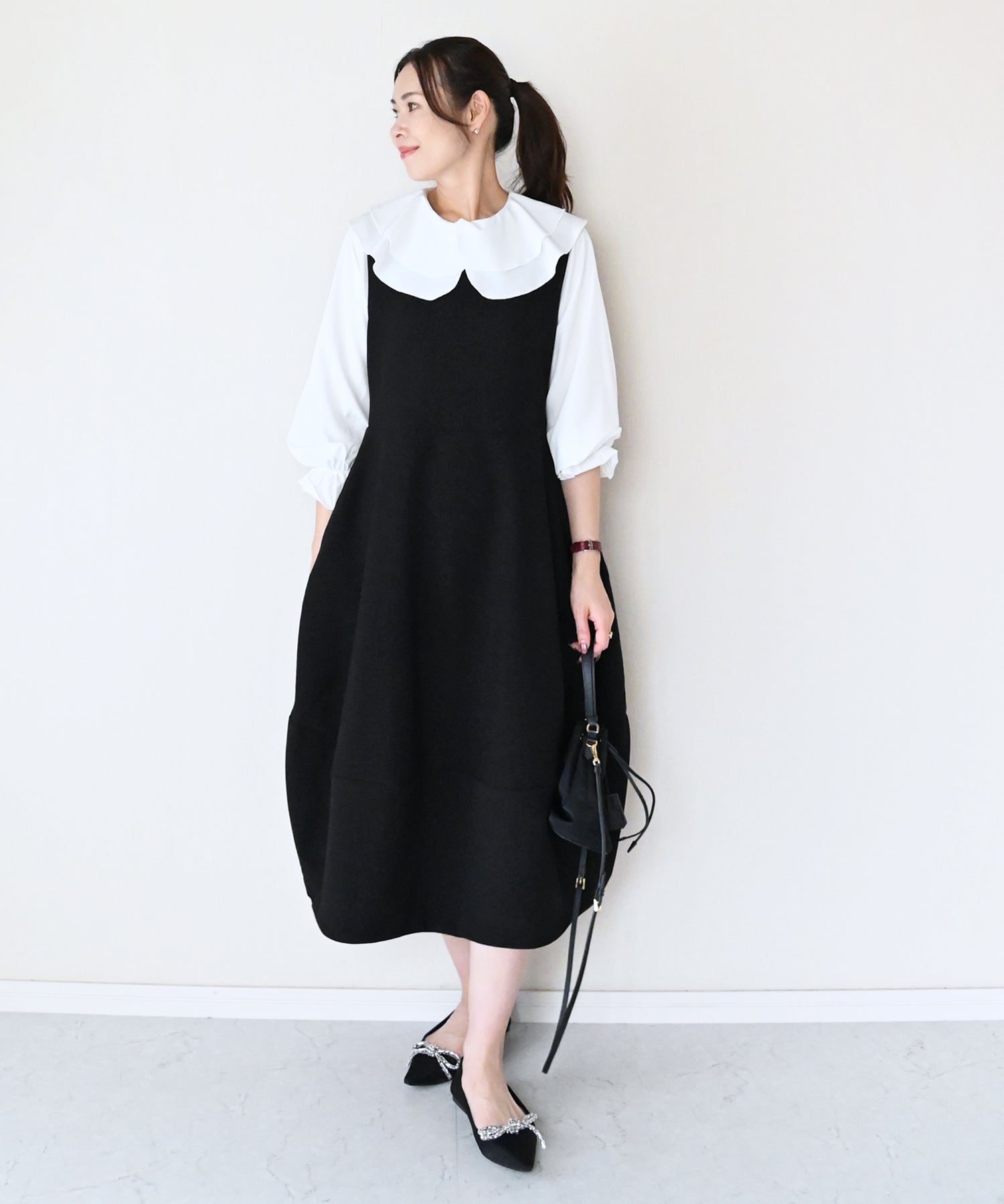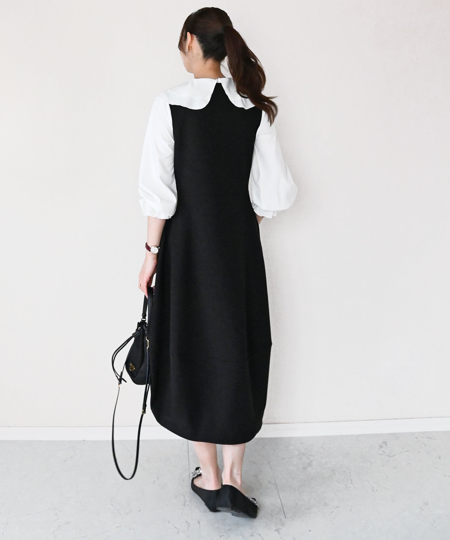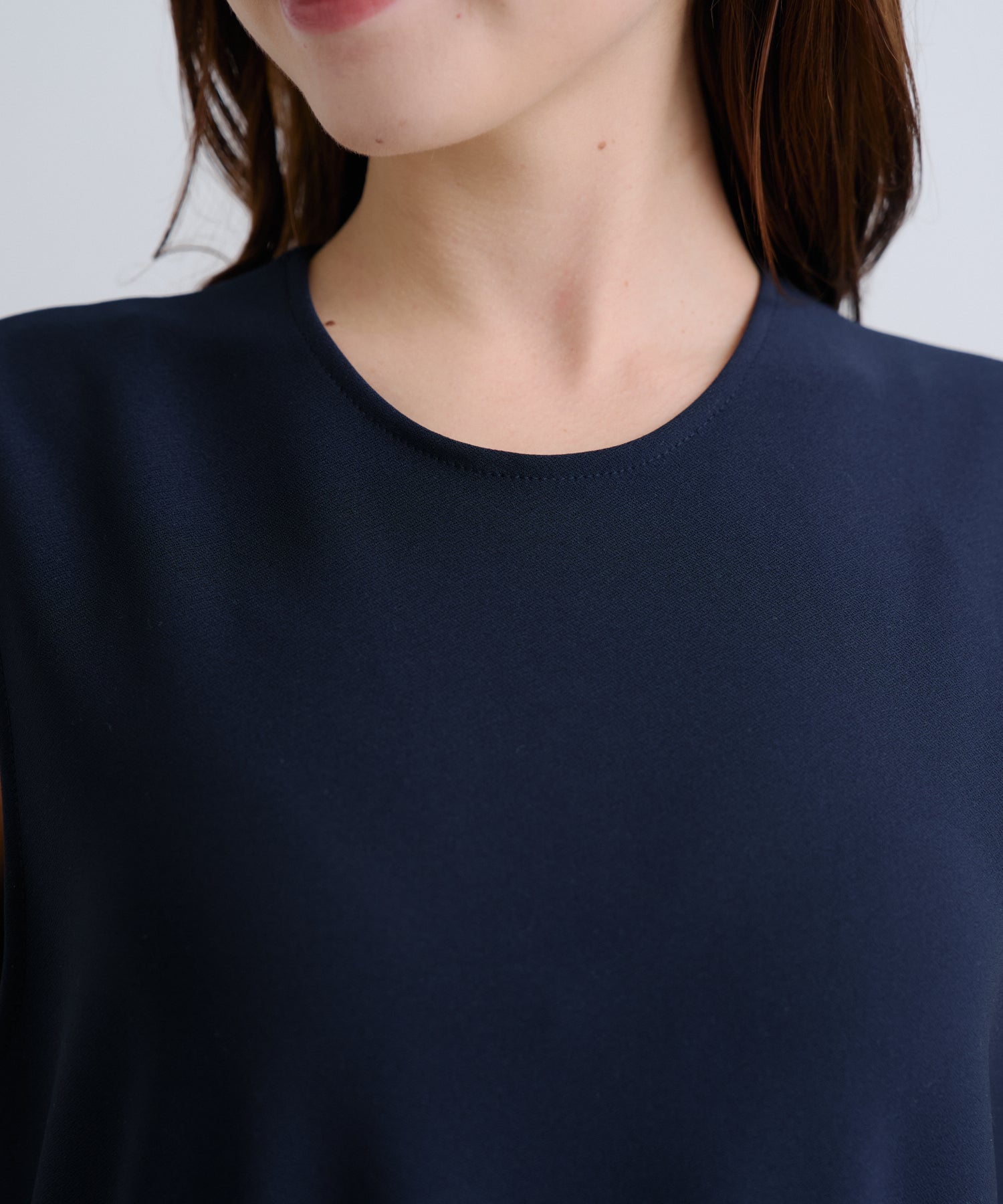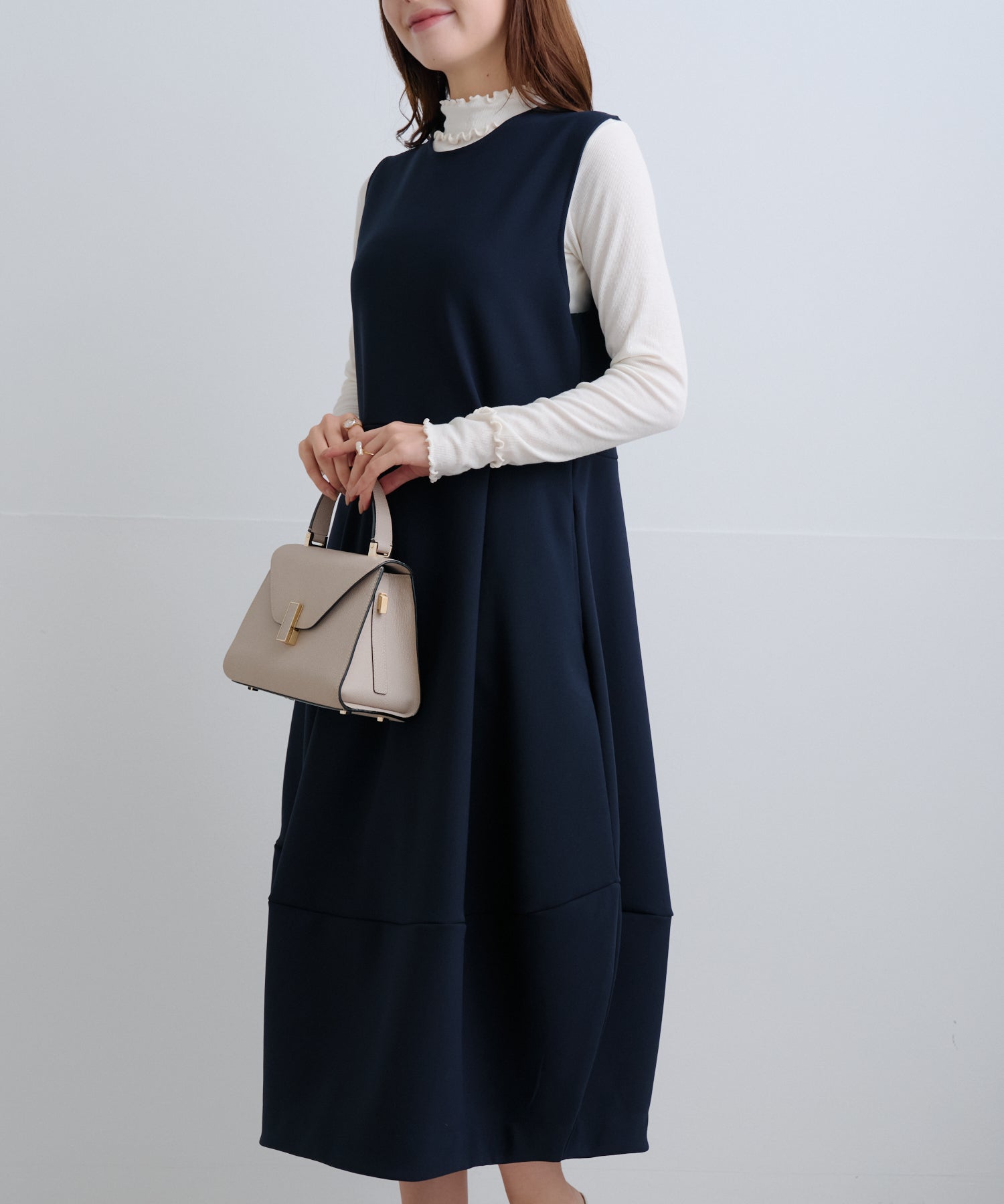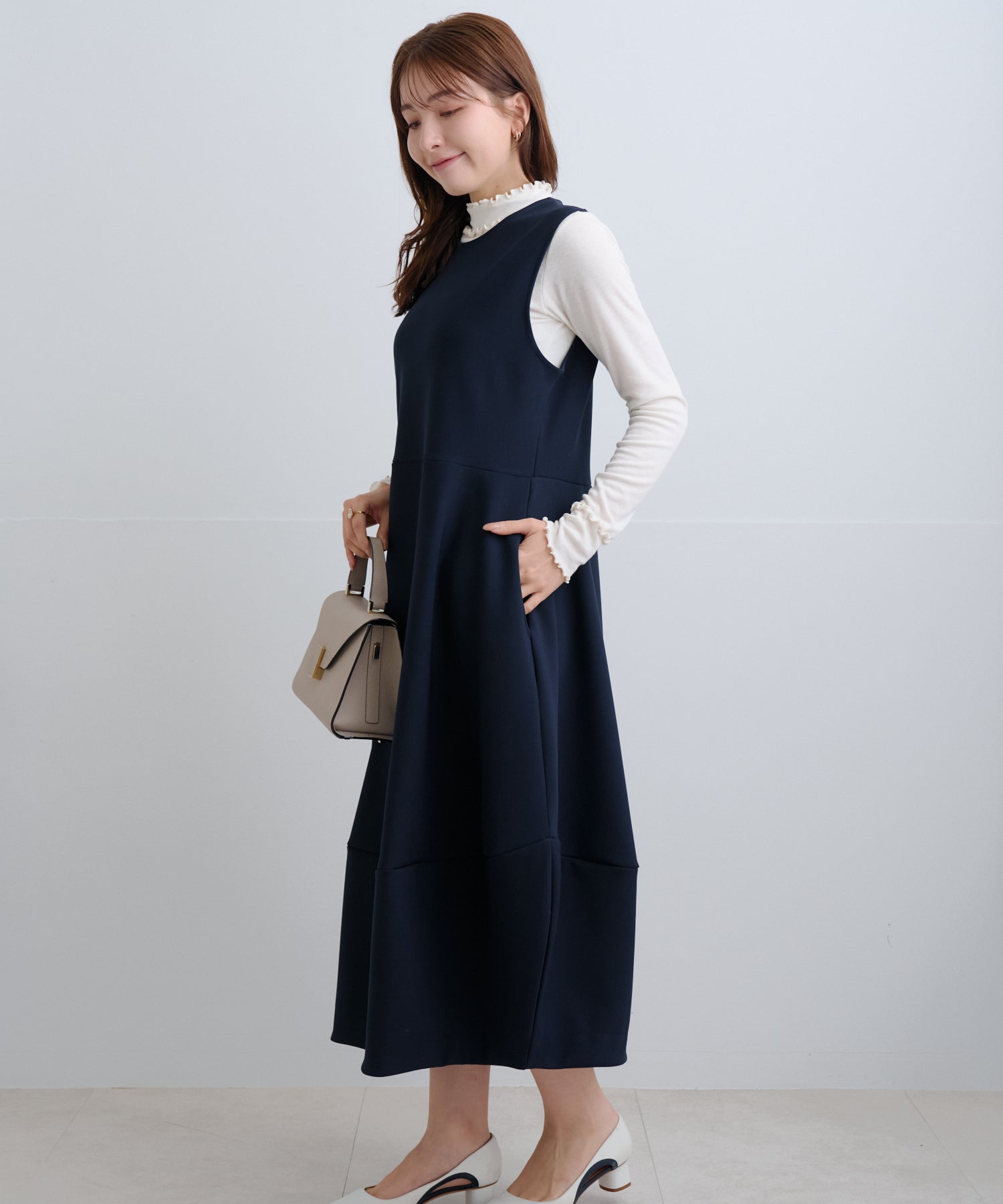 上身頃はすっきりとしたノースリーブデザインで、顔まわりをシャープに。ウエスト切替から裾にかけて、緩やかに内側へカーブする立体的なコクーンラインが、身体のラインを拾いすぎず自然にスタイルアップを叶えます。
