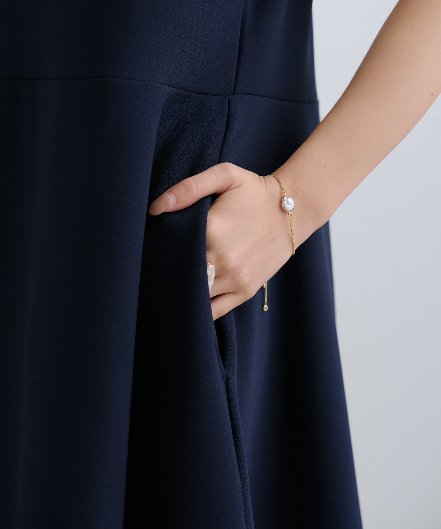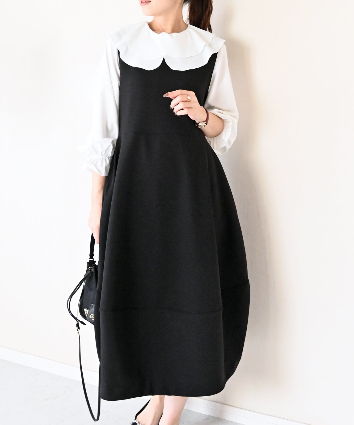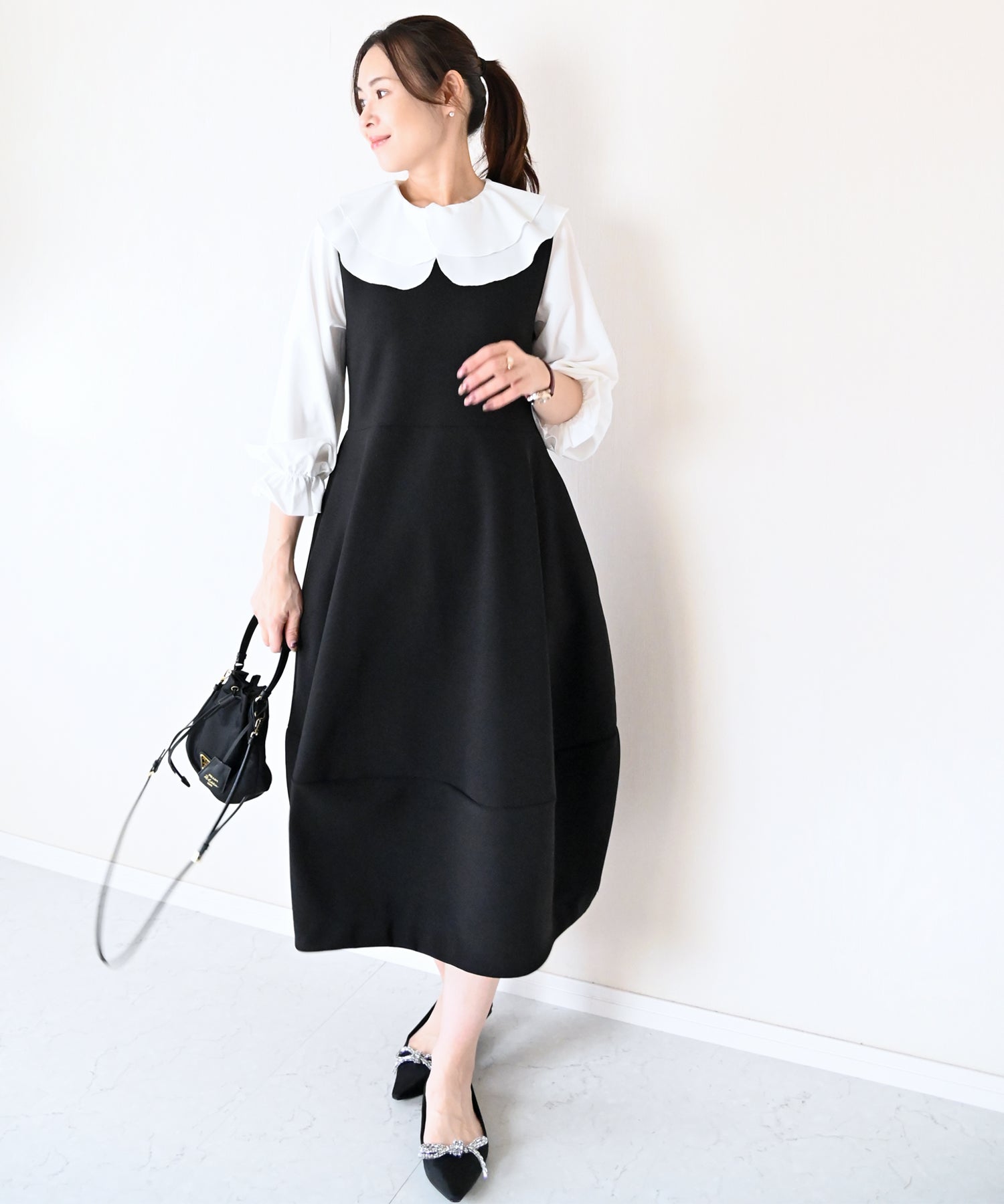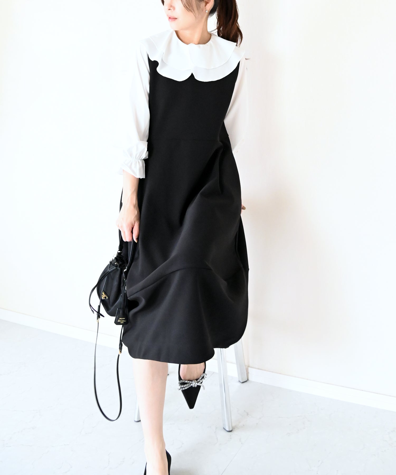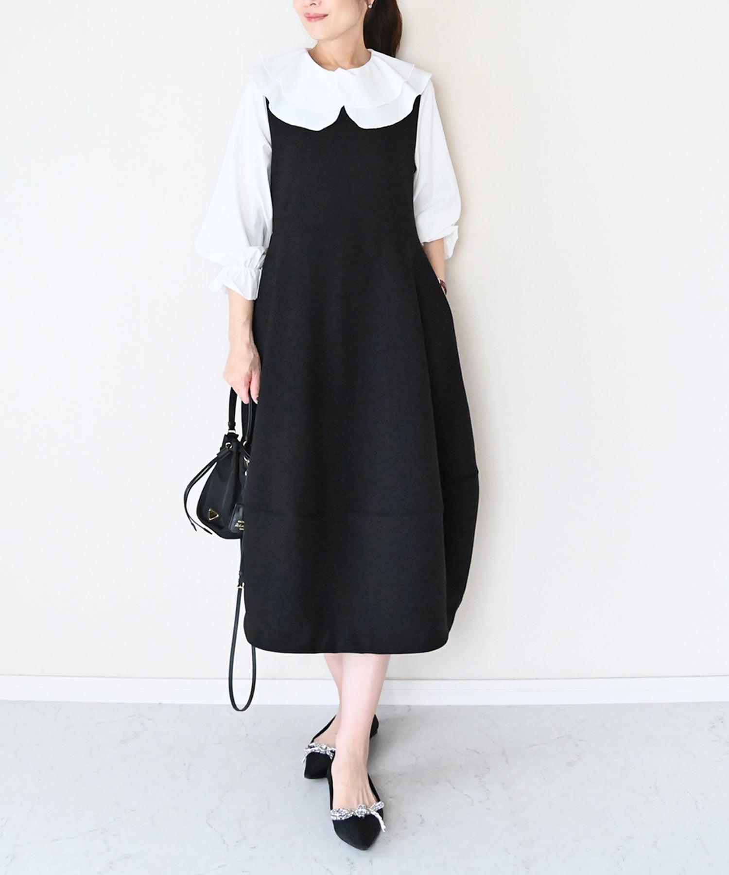 上身頃はすっきりとしたノースリーブデザインで、顔まわりをシャープに。ウエスト切替から裾にかけて、緩やかに内側へカーブする立体的なコクーンラインが、身体のラインを拾いすぎず自然にスタイルアップを叶えます。