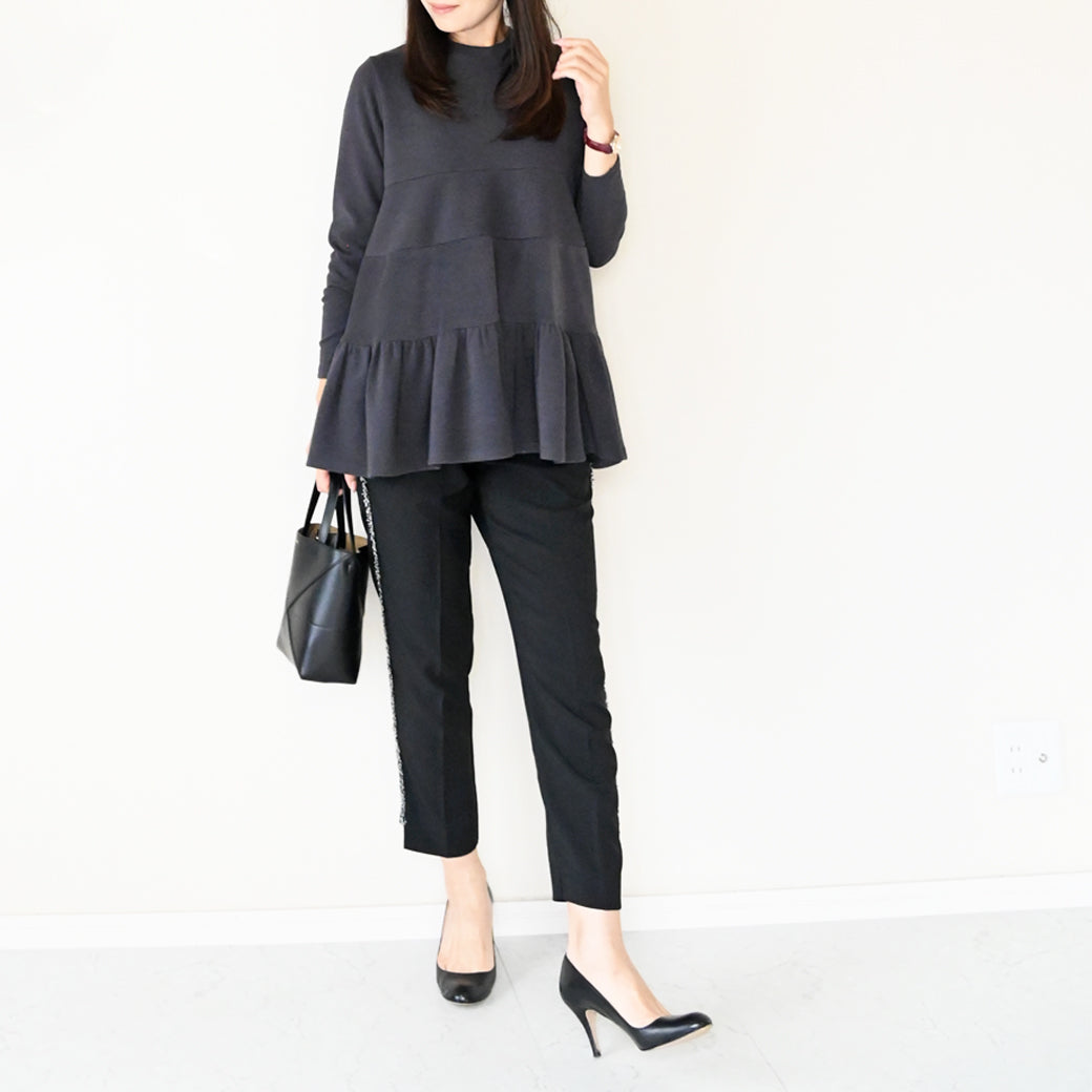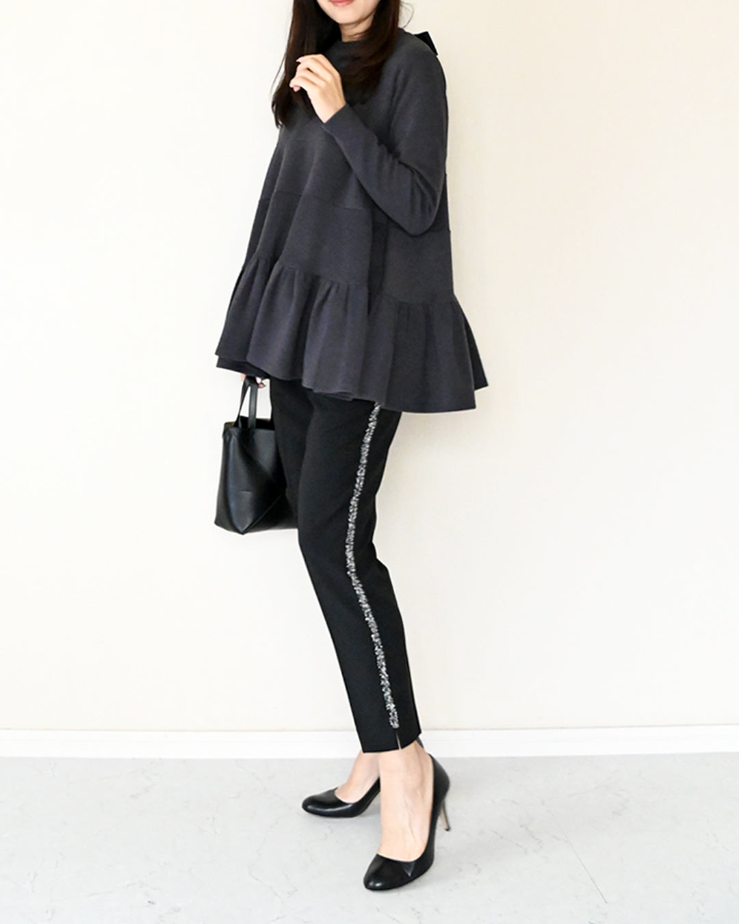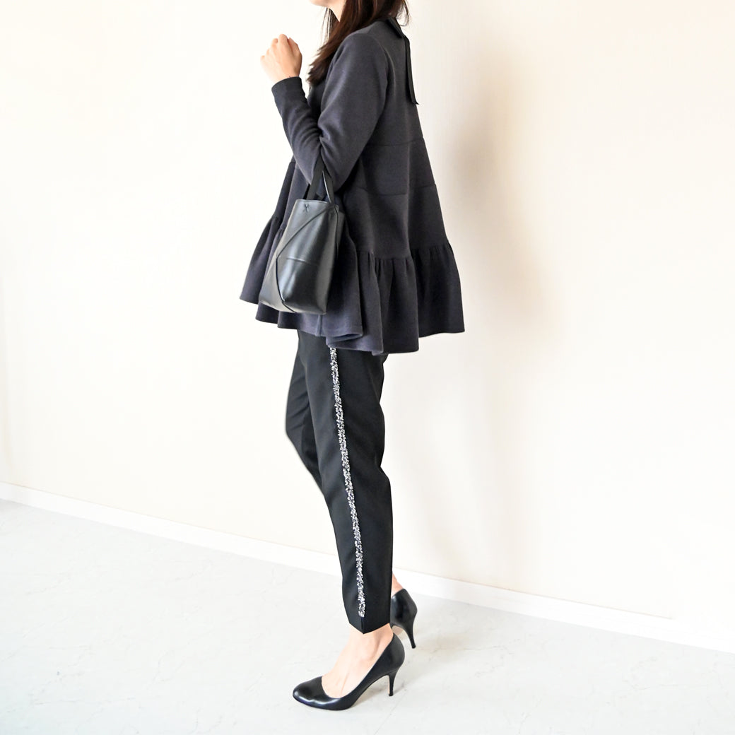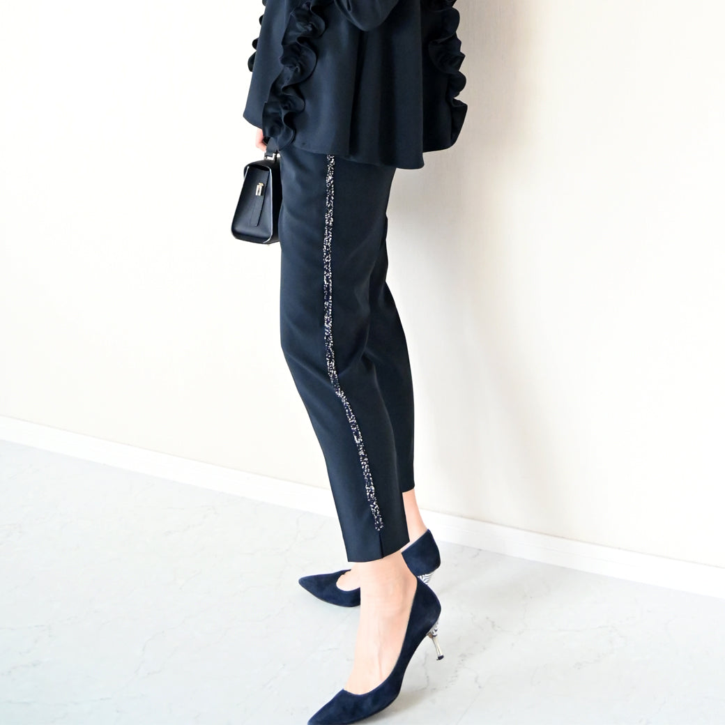 サイドにあしらったツイードラインが、上品で洗練された印象を添えるテーパードパンツ。