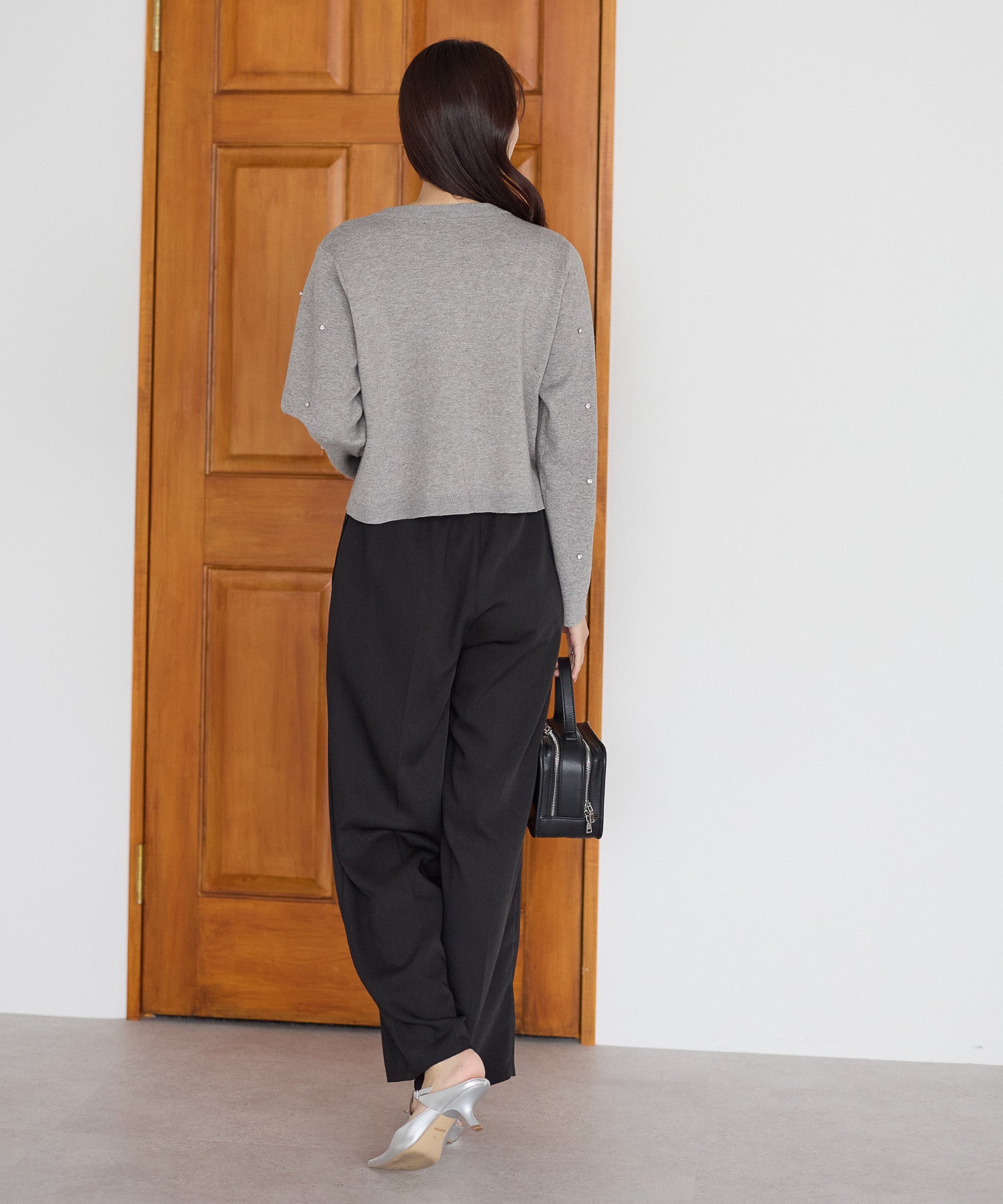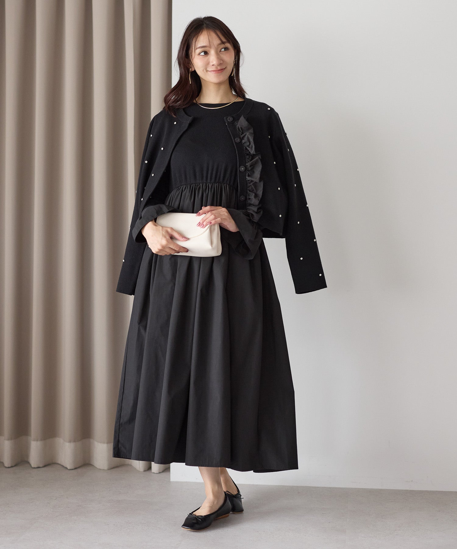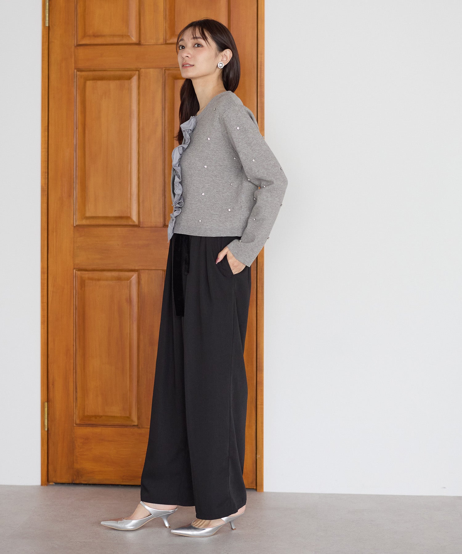 フロントにあしらったサテンフリルと、散りばめられたジュエルの輝きが印象的なカーディガン。
