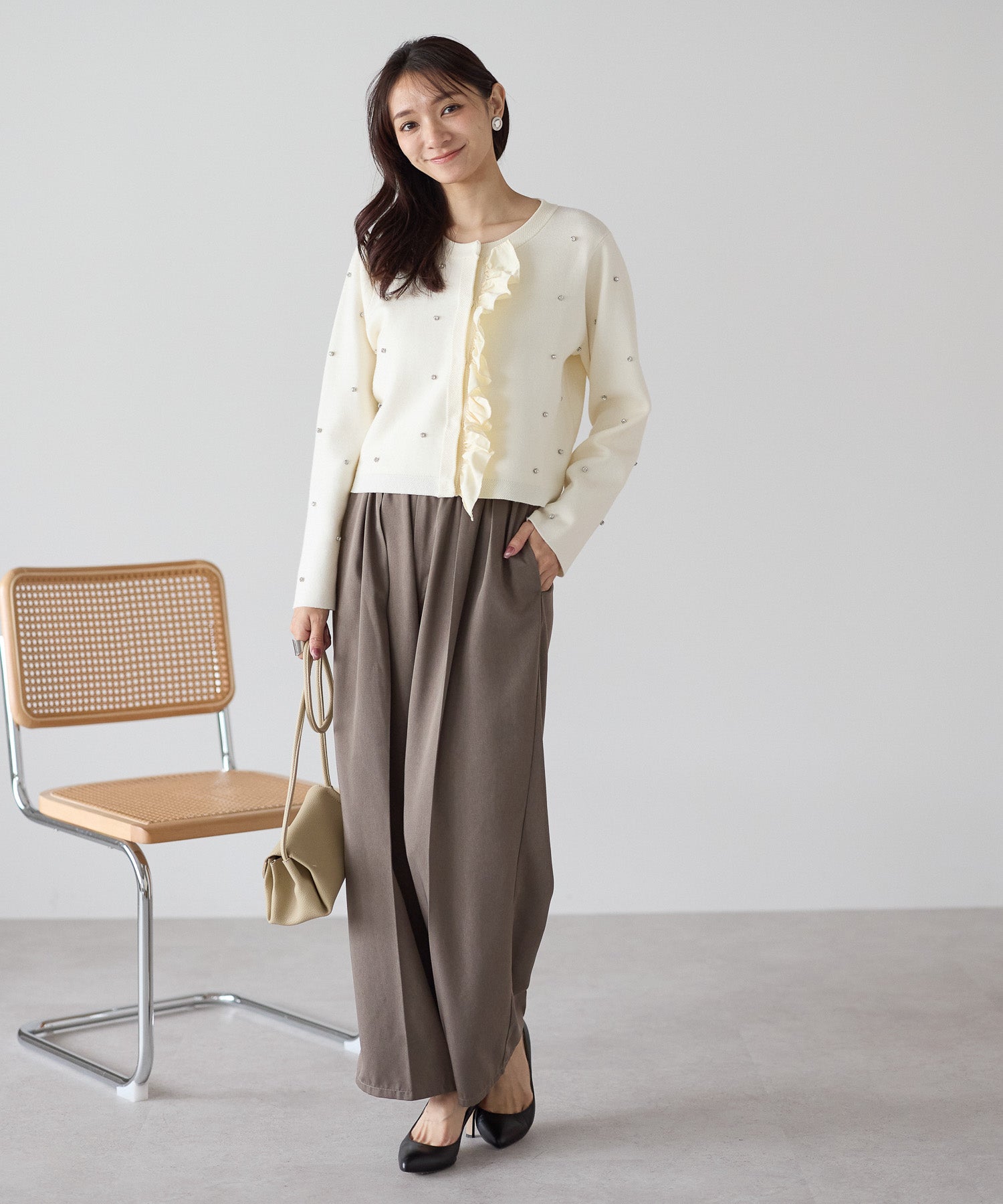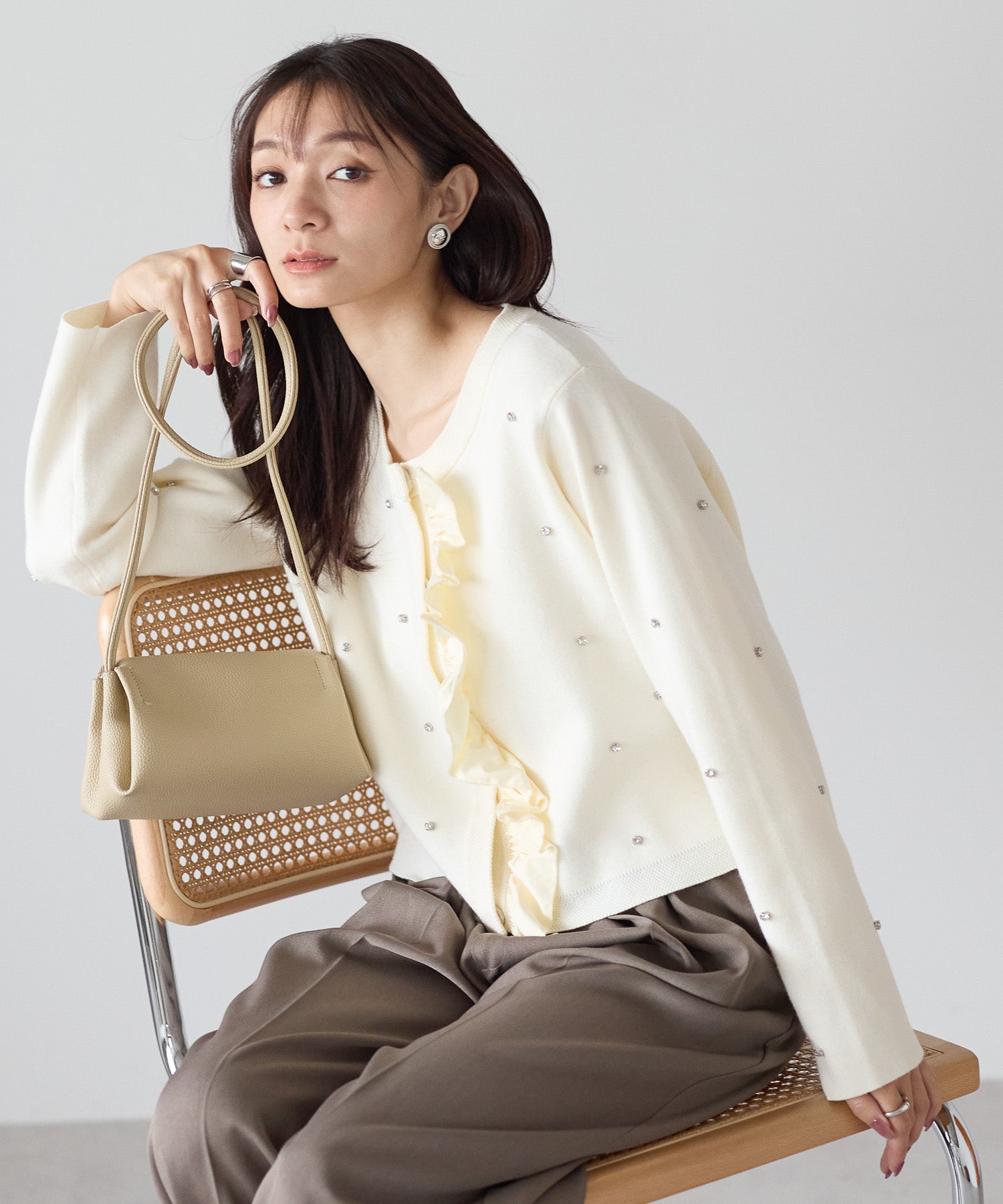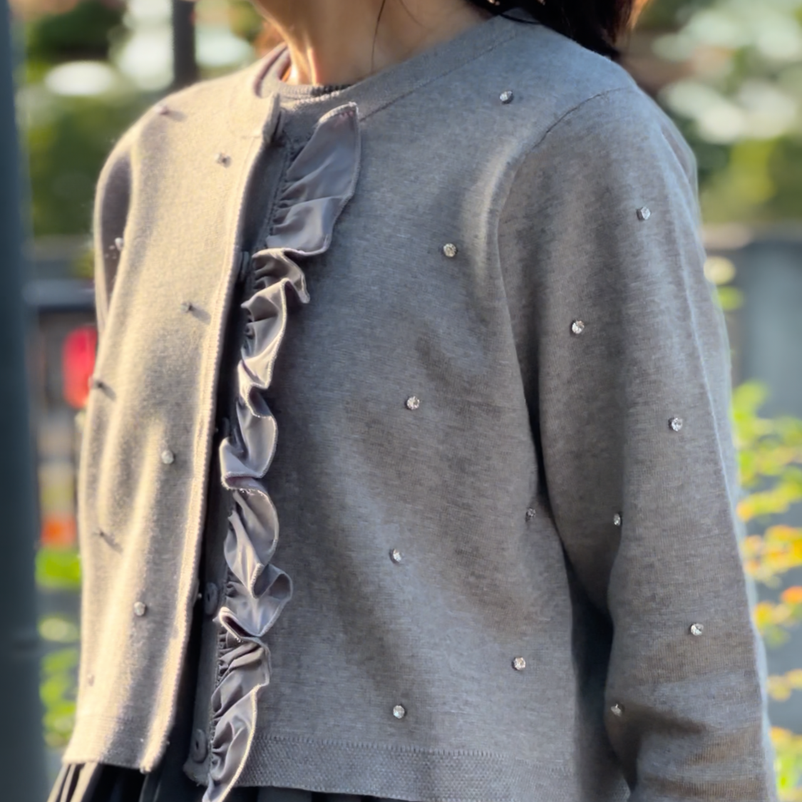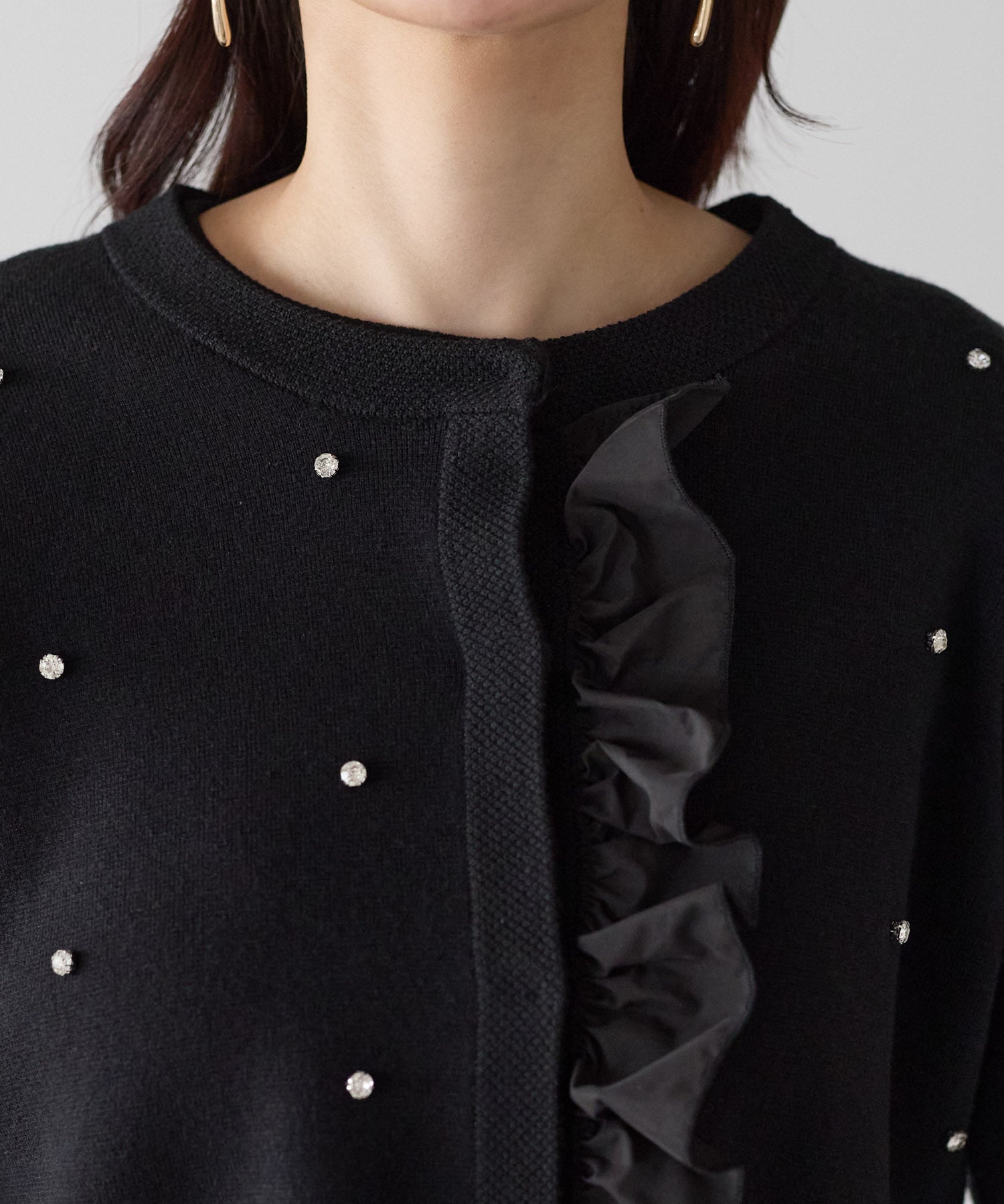 大粒ジュエルのきらめきとフリルの立体感が、冬の装いに品よく華を添えるカーディガン。