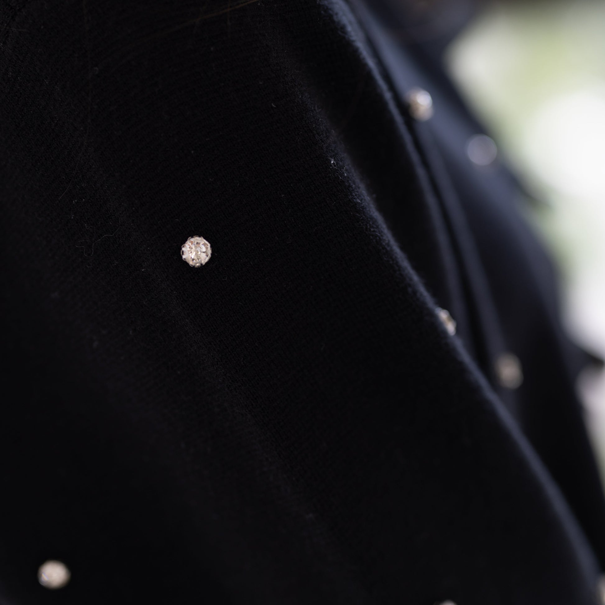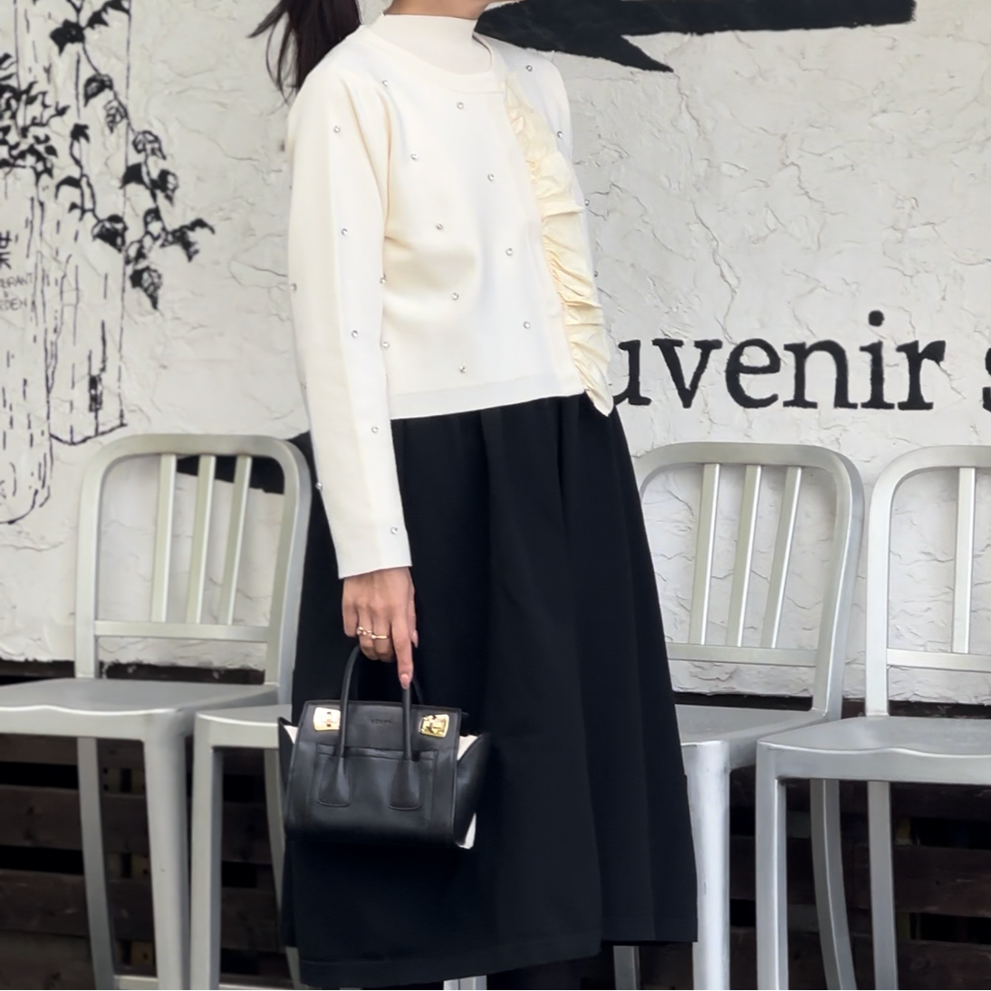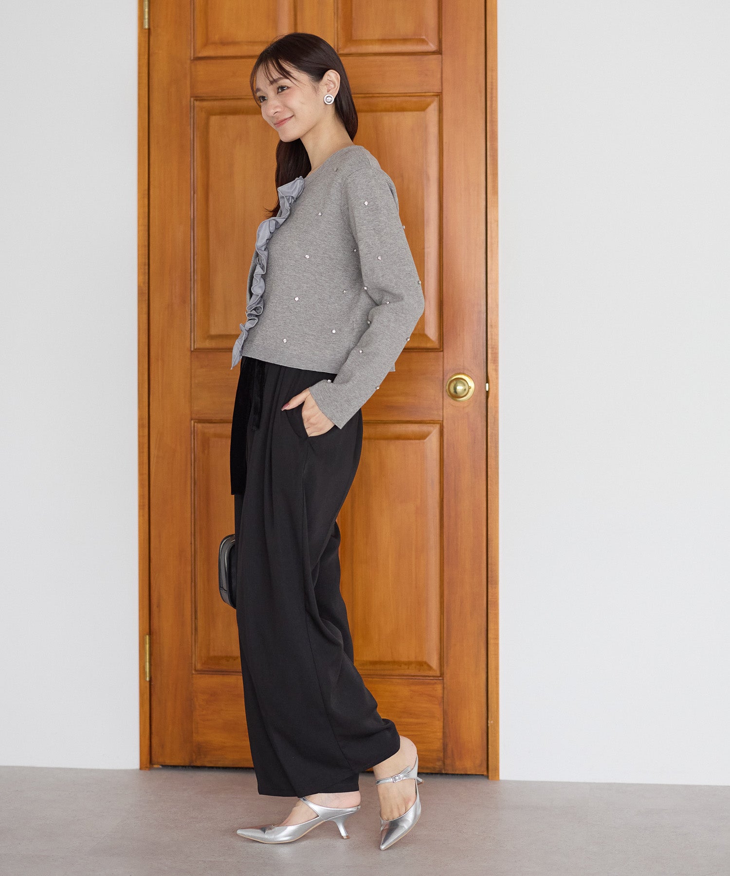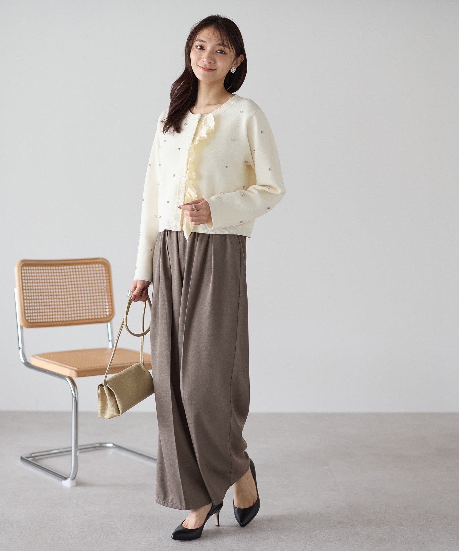 大粒ジュエルのきらめきとフリルの立体感が、冬の装いに品よく華を添えるカーディガン。
