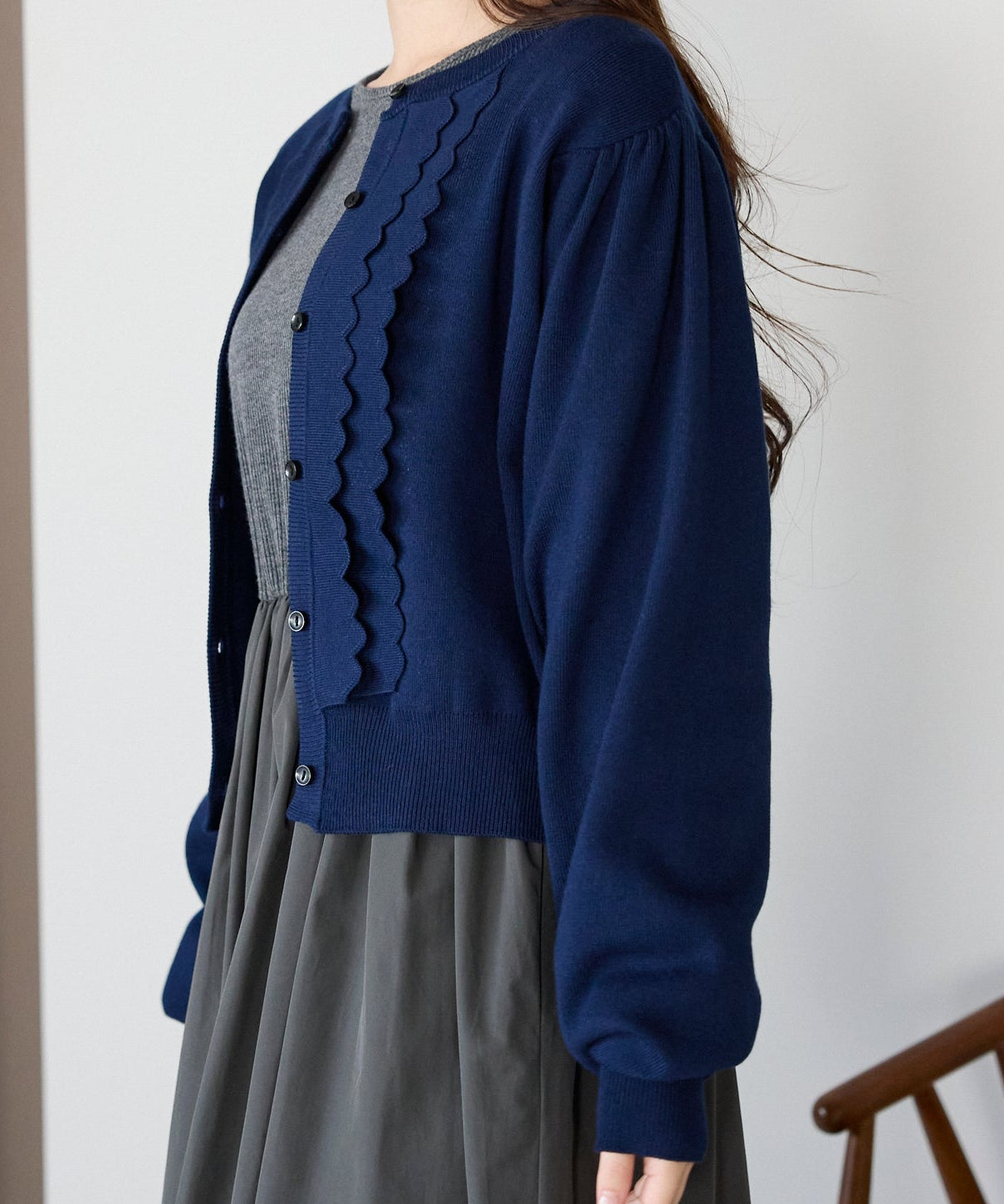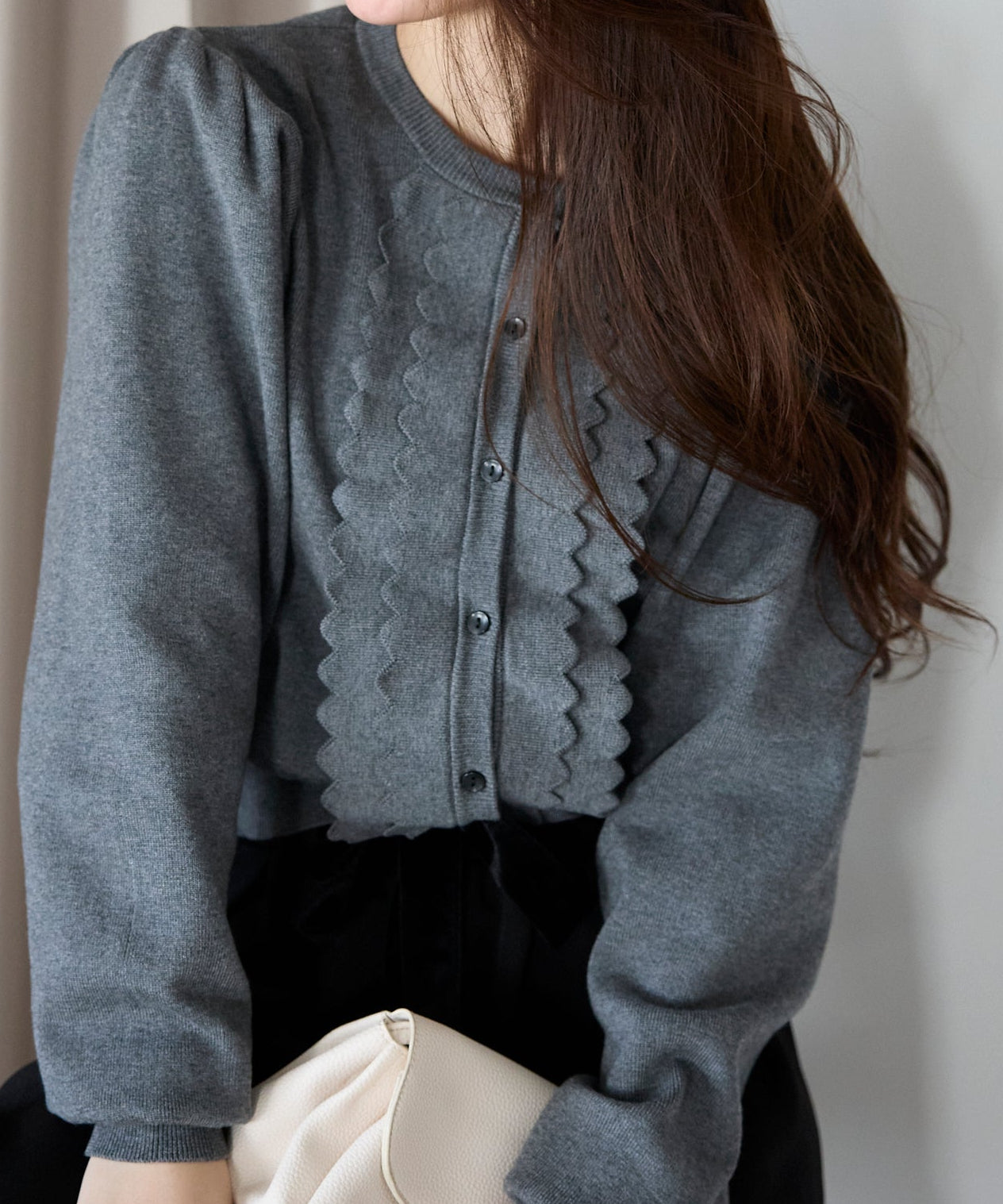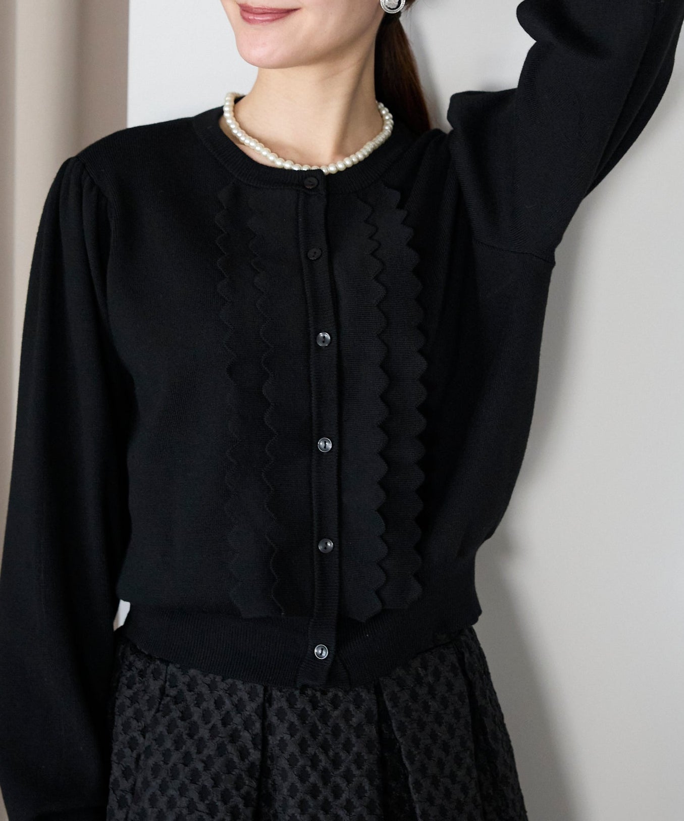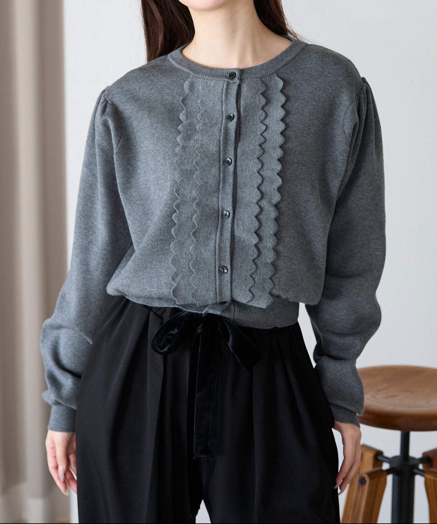繊細なスカラップフリルが、装いにやさしい華やぎを添えるニットカーディガン。