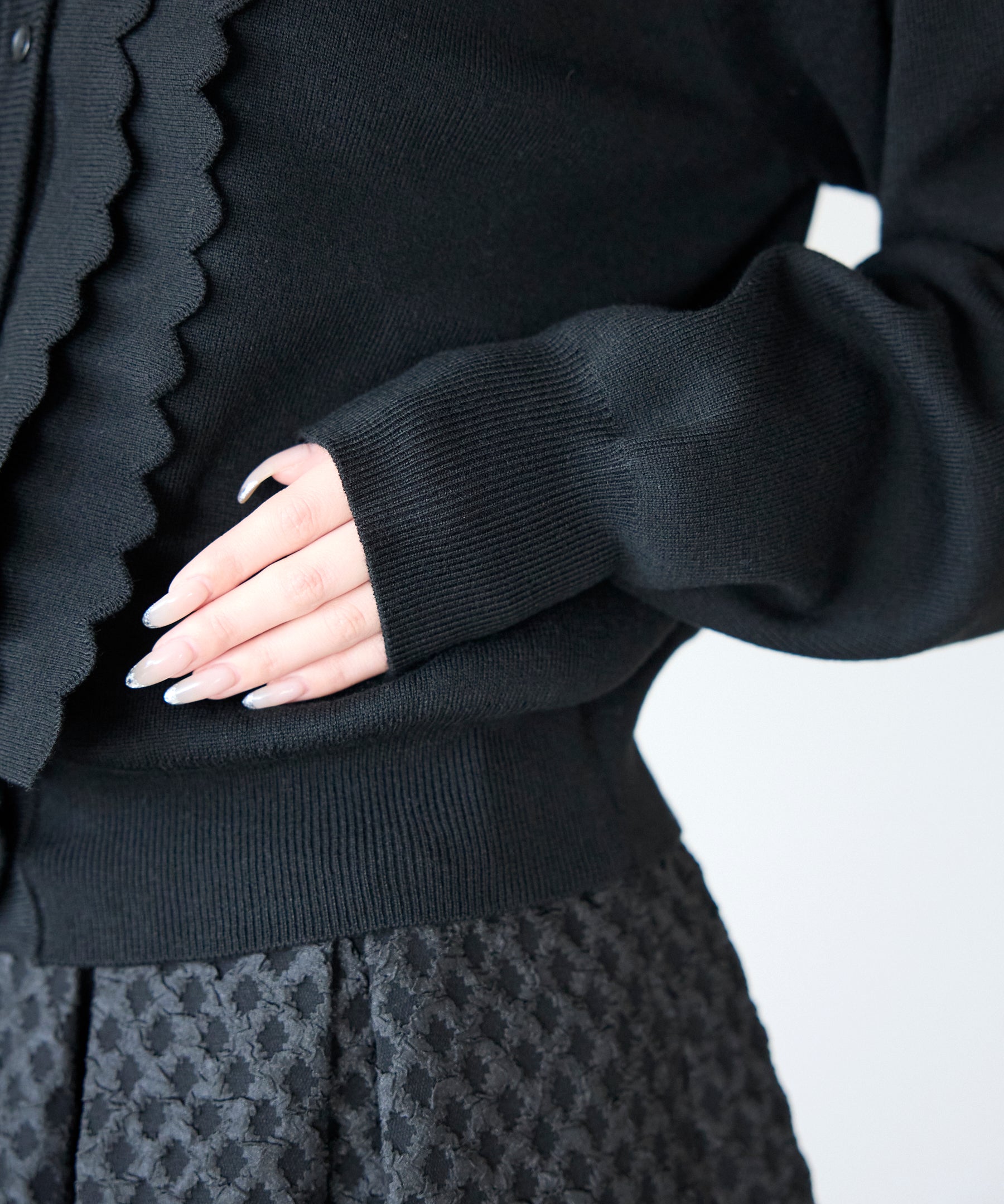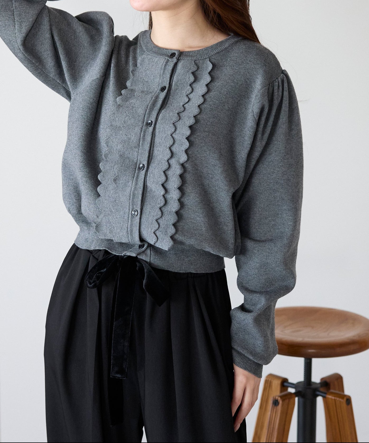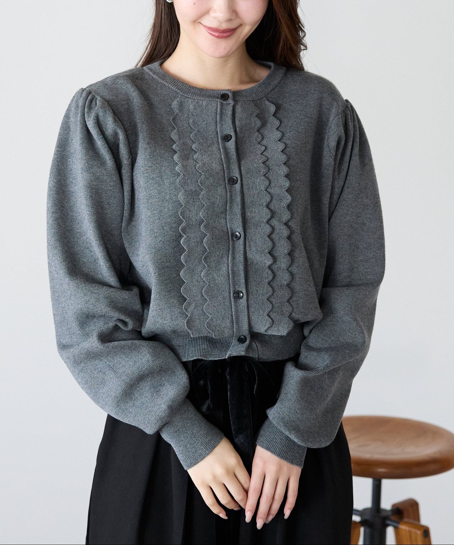 繊細なスカラップフリルが、装いにやさしい華やぎを添えるニットカーディガン。