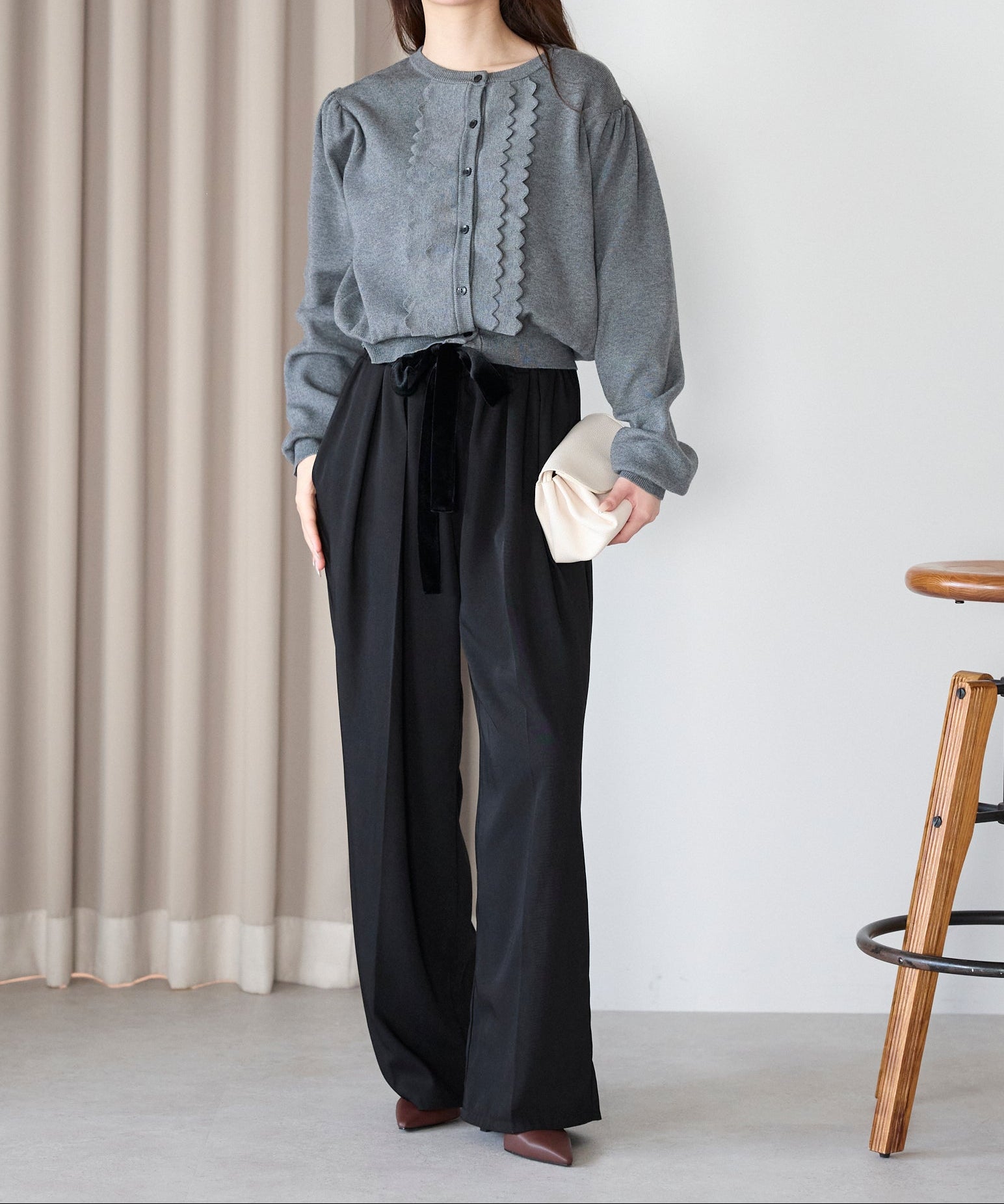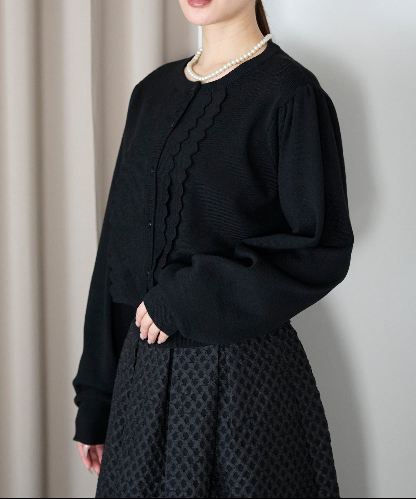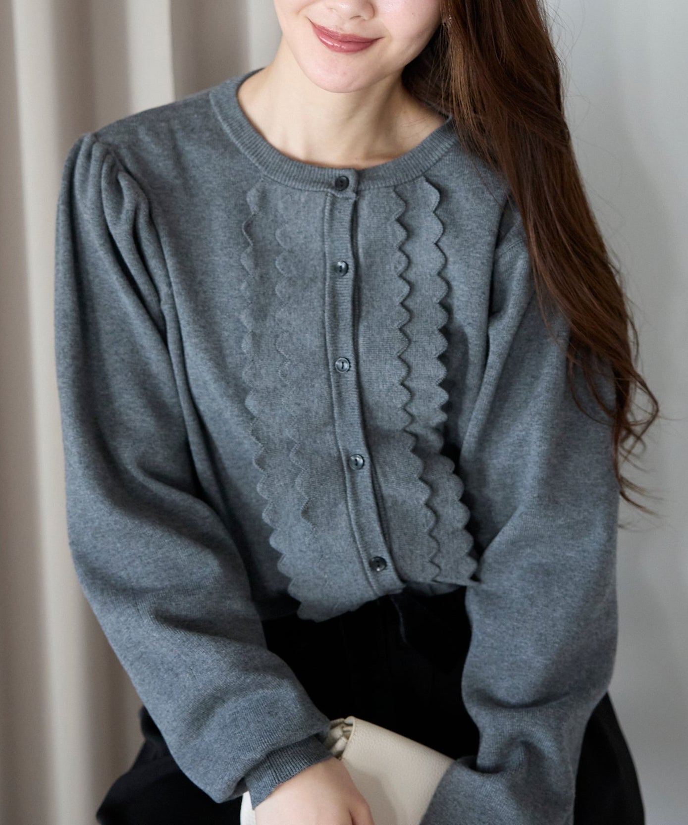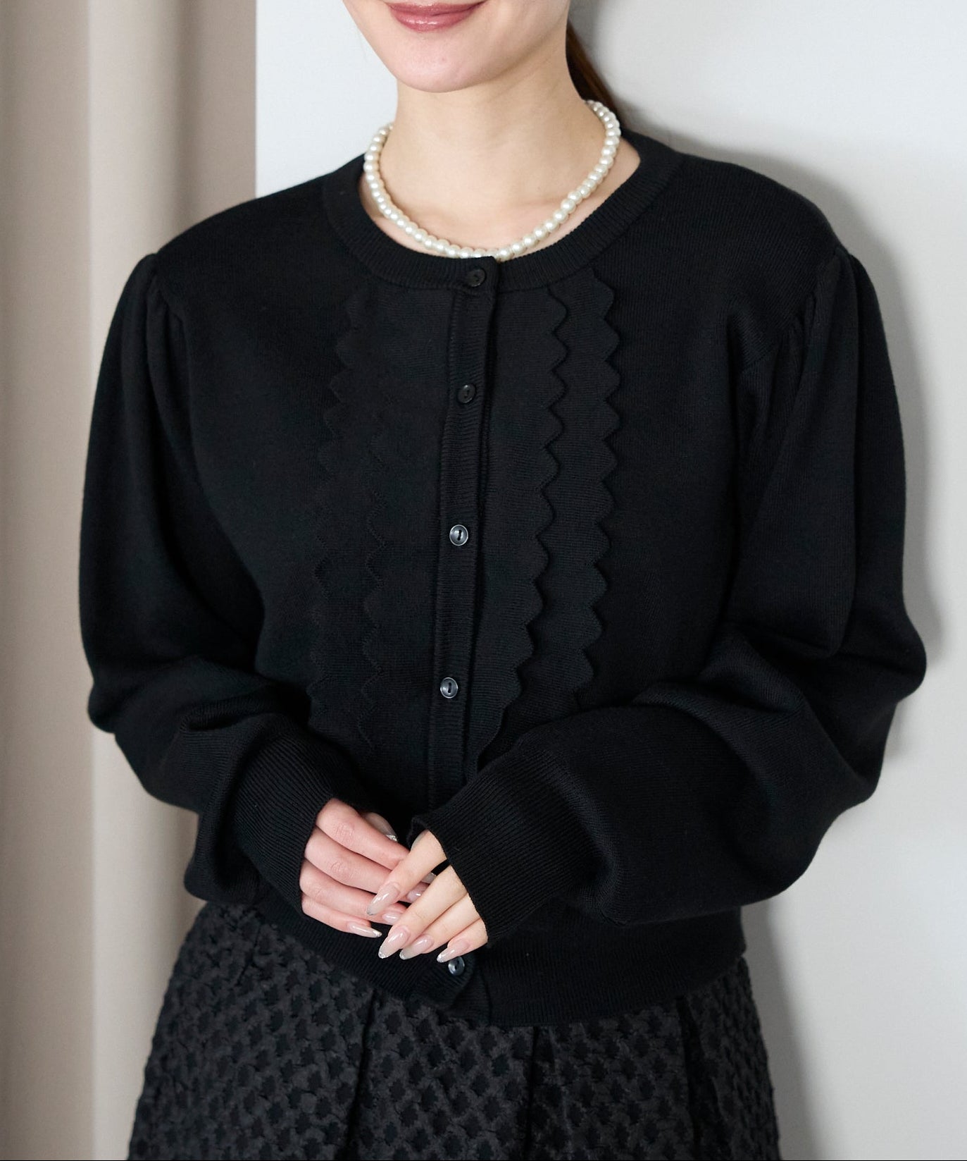 繊細なスカラップフリルが、装いにやさしい華やぎを添えるニットカーディガン。