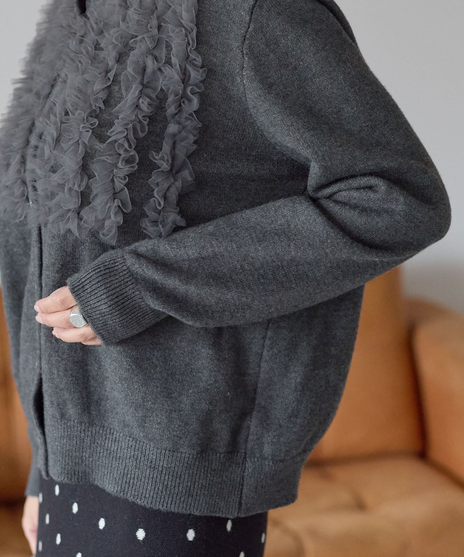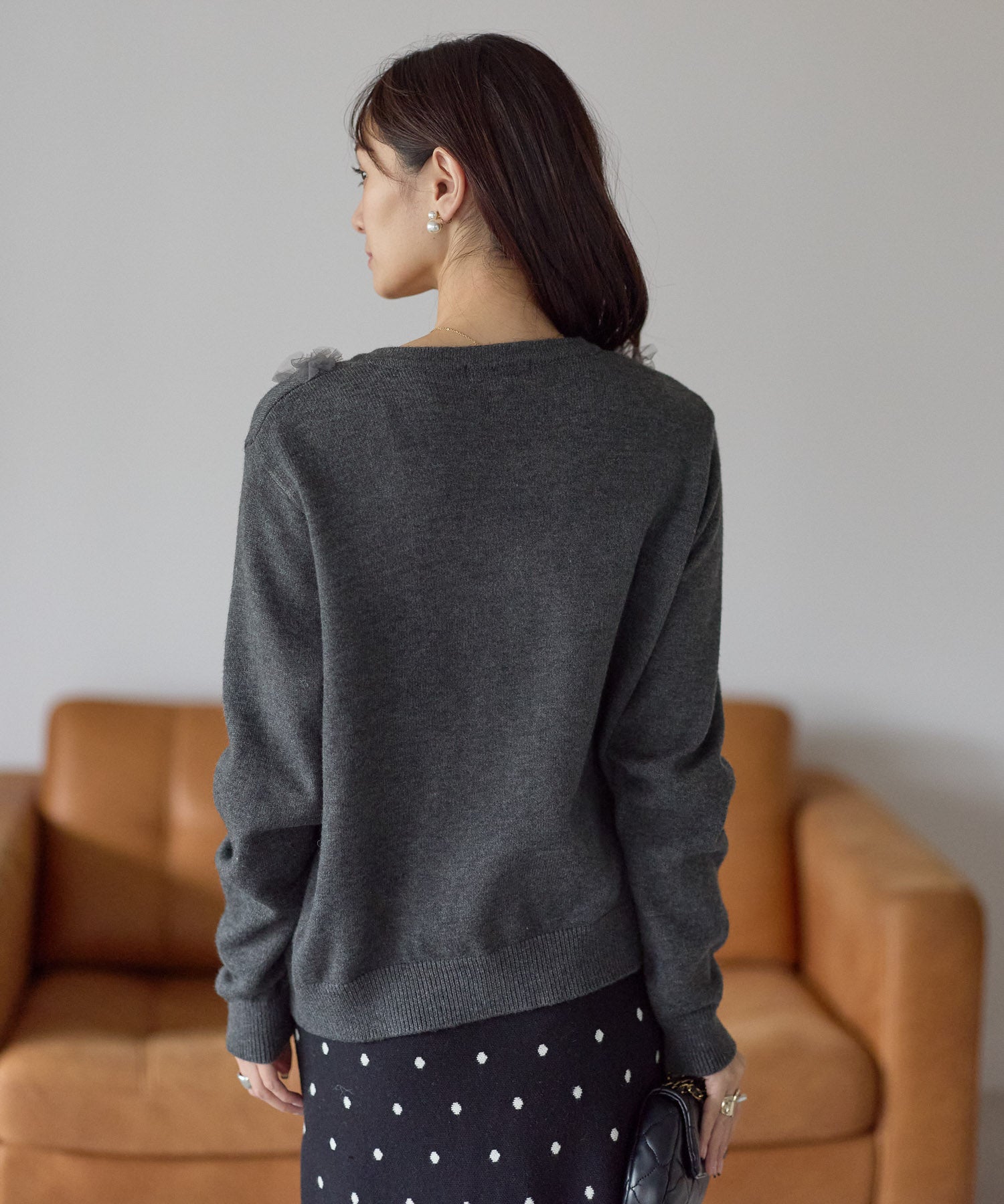 ふんわりと立体感のあるチュールフリルを前身頃に贅沢にあしらい、シンプルなニットに華やぎをプラス。