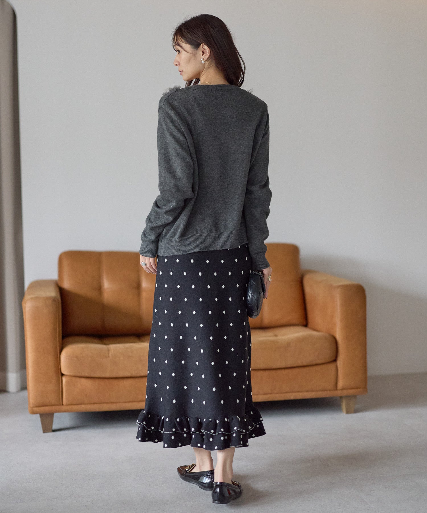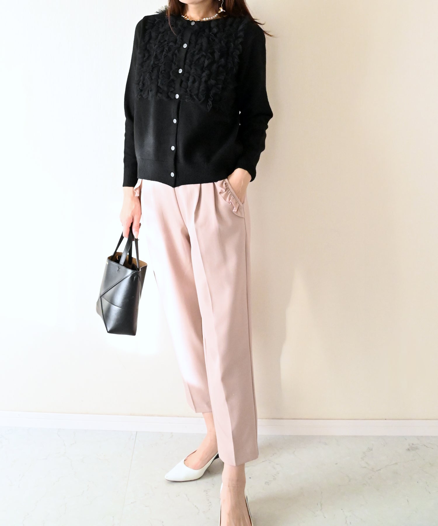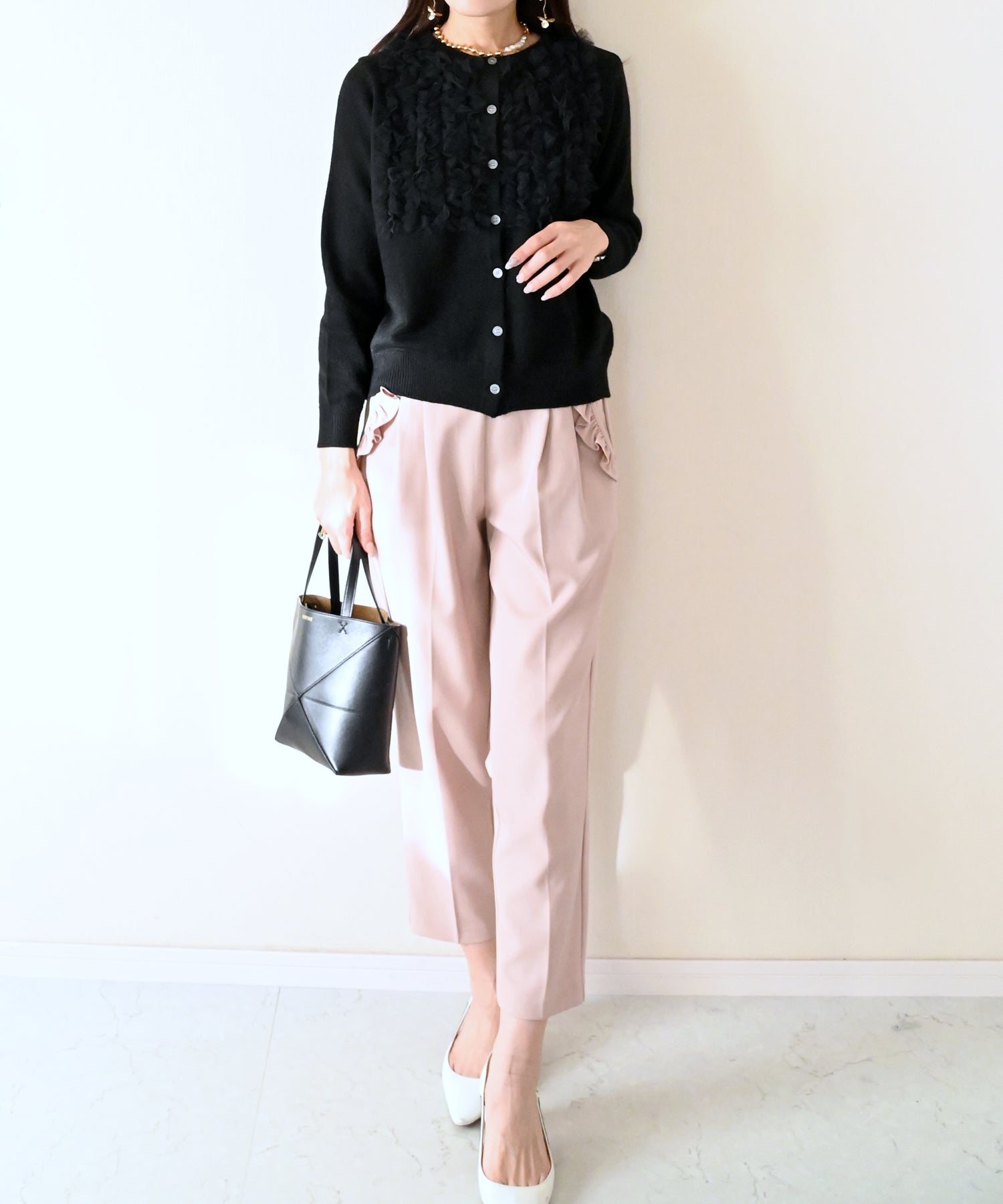 羽織るだけでコーデの主役になり、大人フェミニンなラッフルカーディガン。