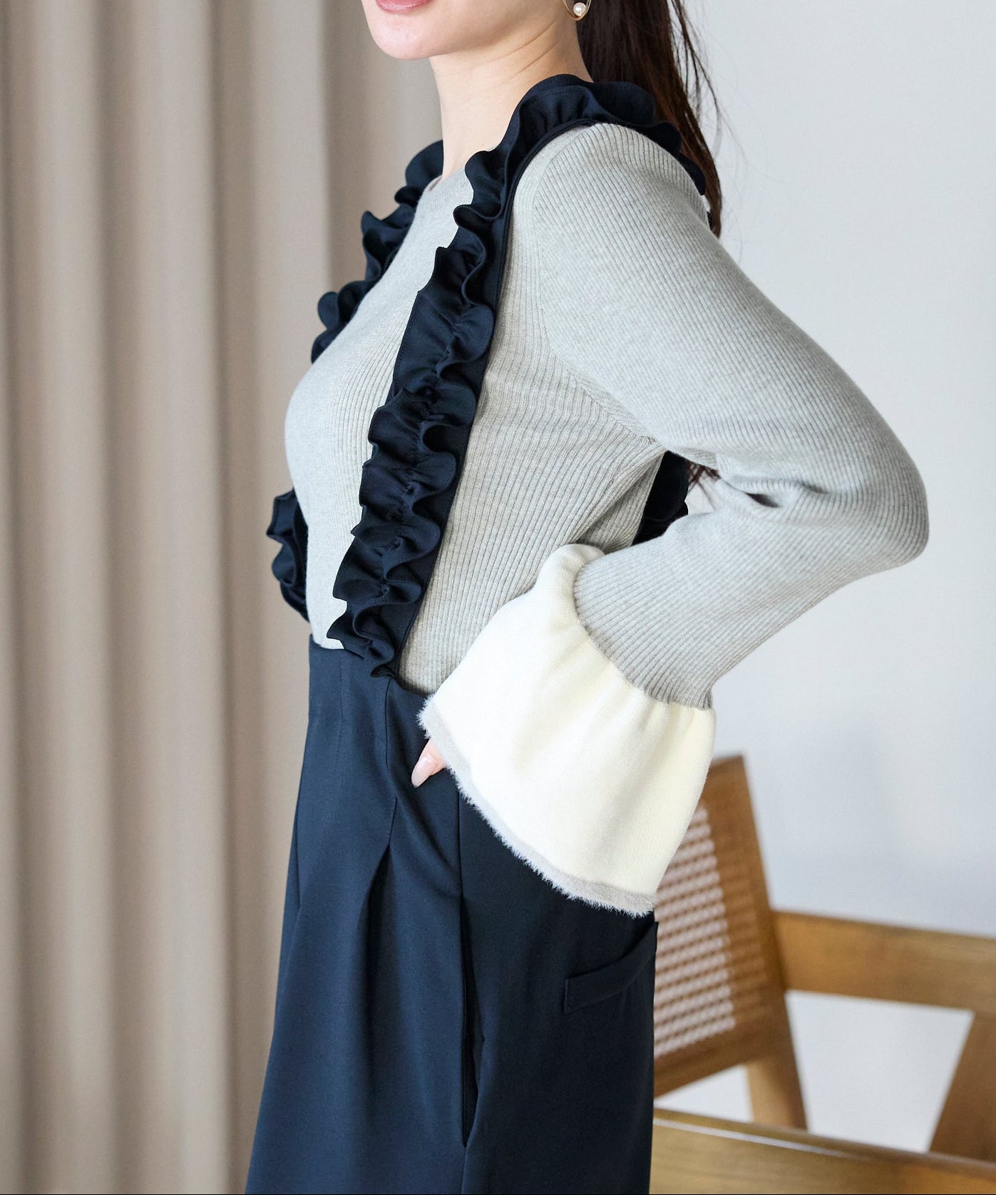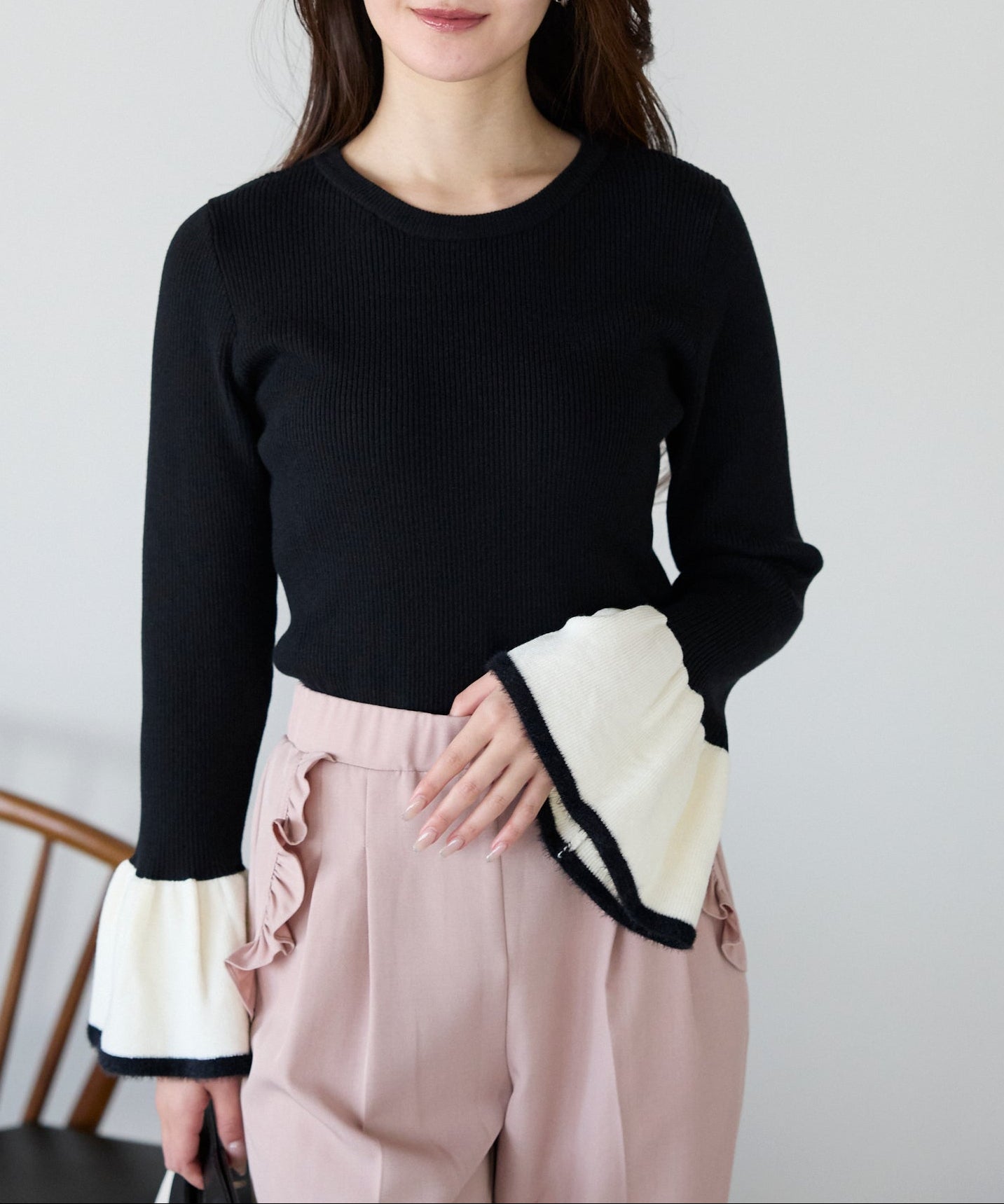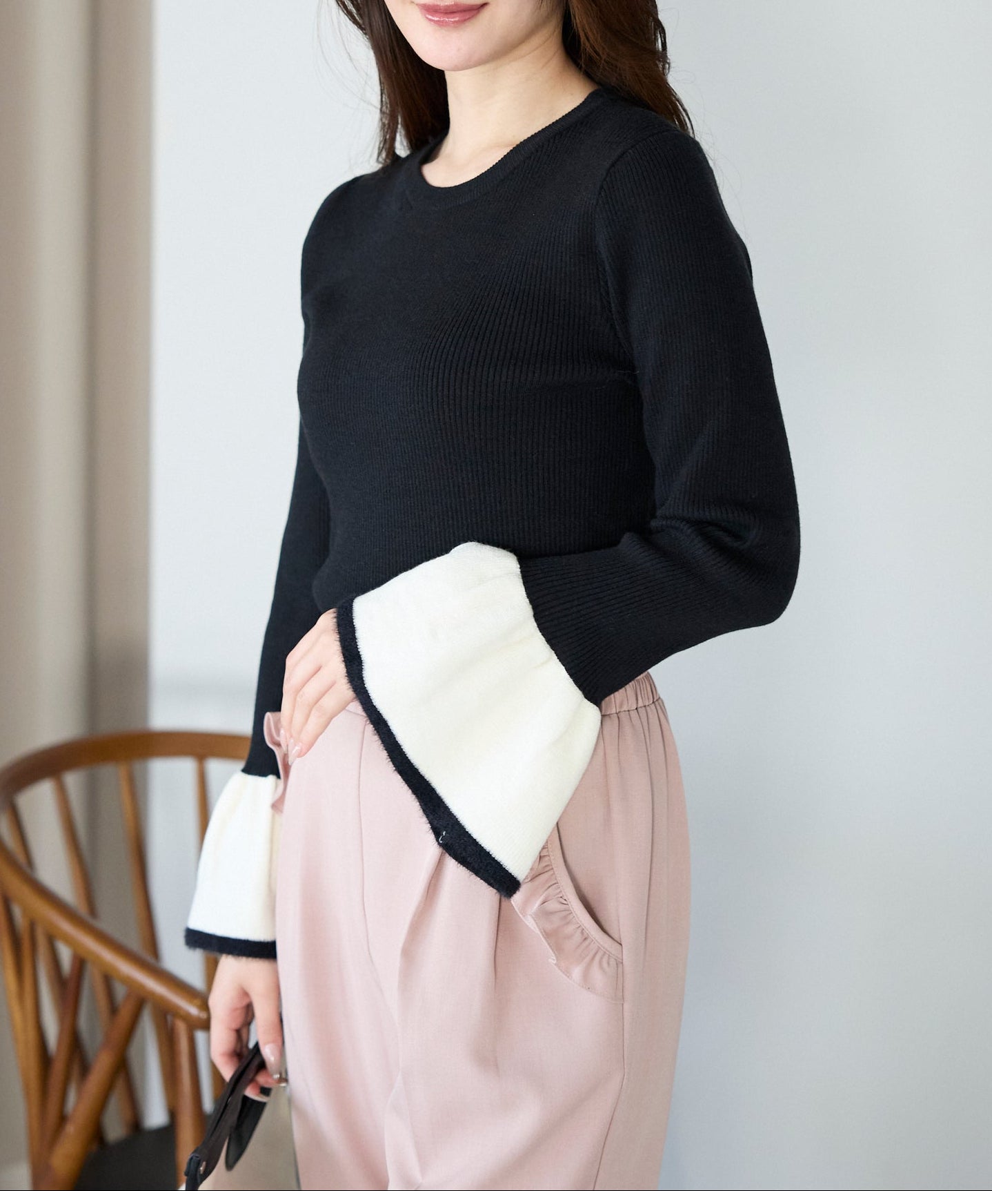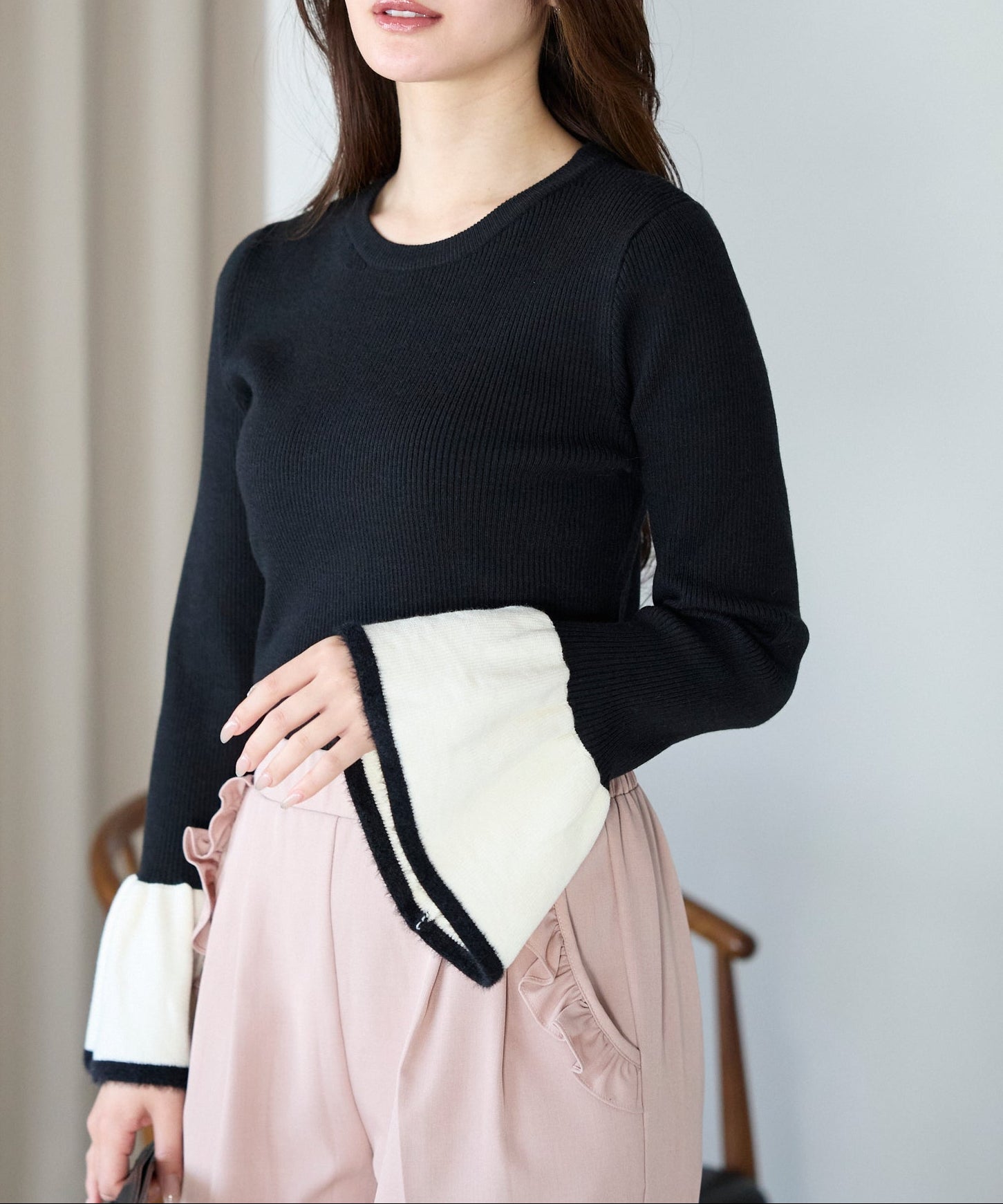 袖口のバイカラーデザインが、さりげなく華やぎを添えるフレアスリーブニット。