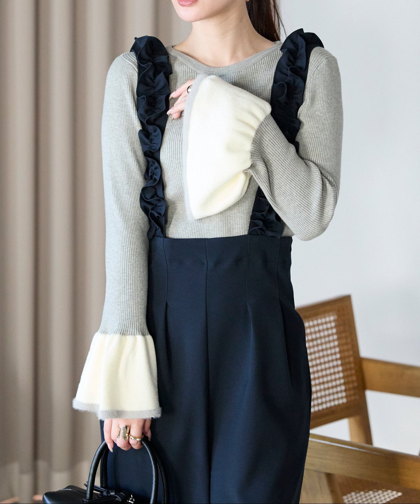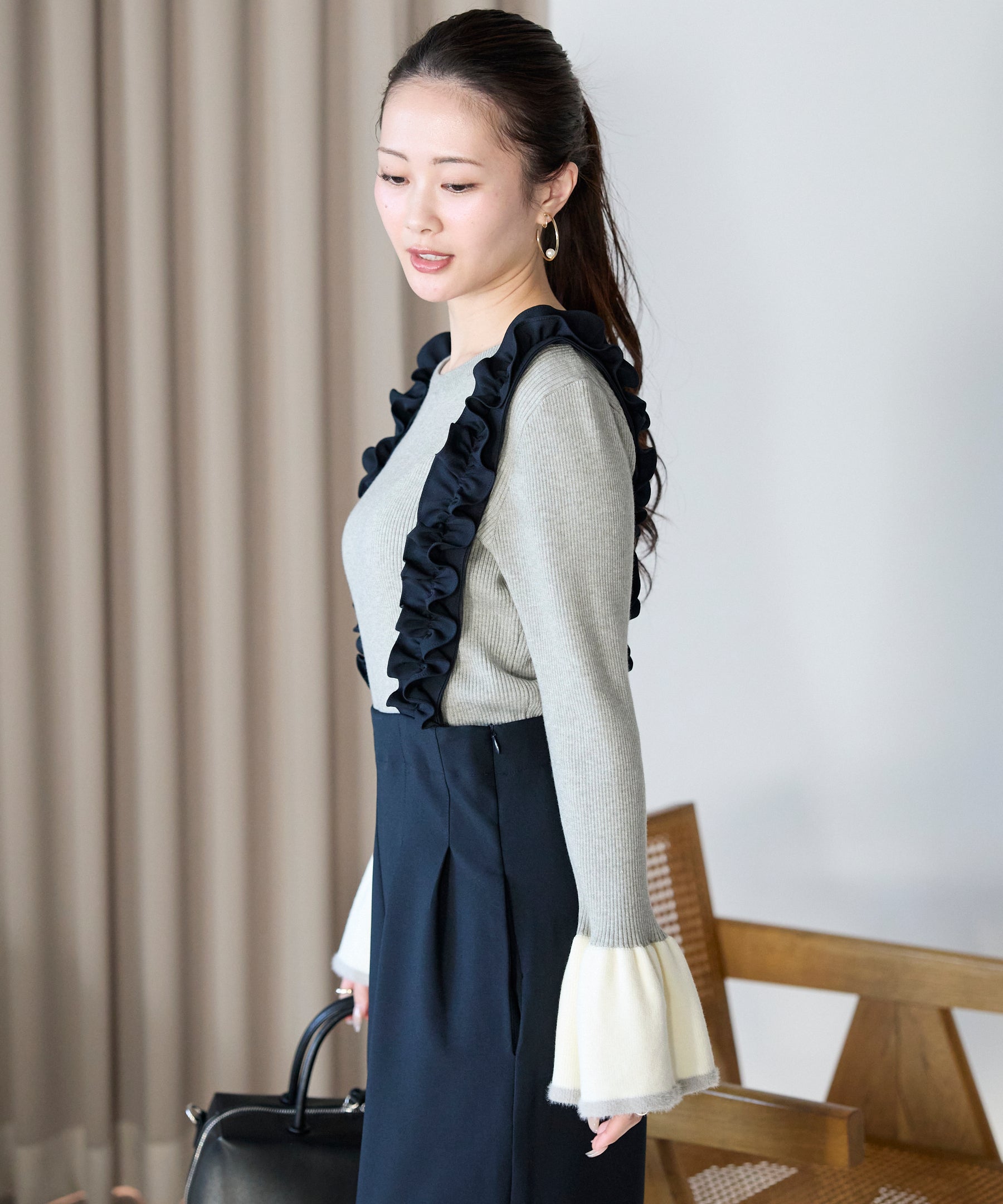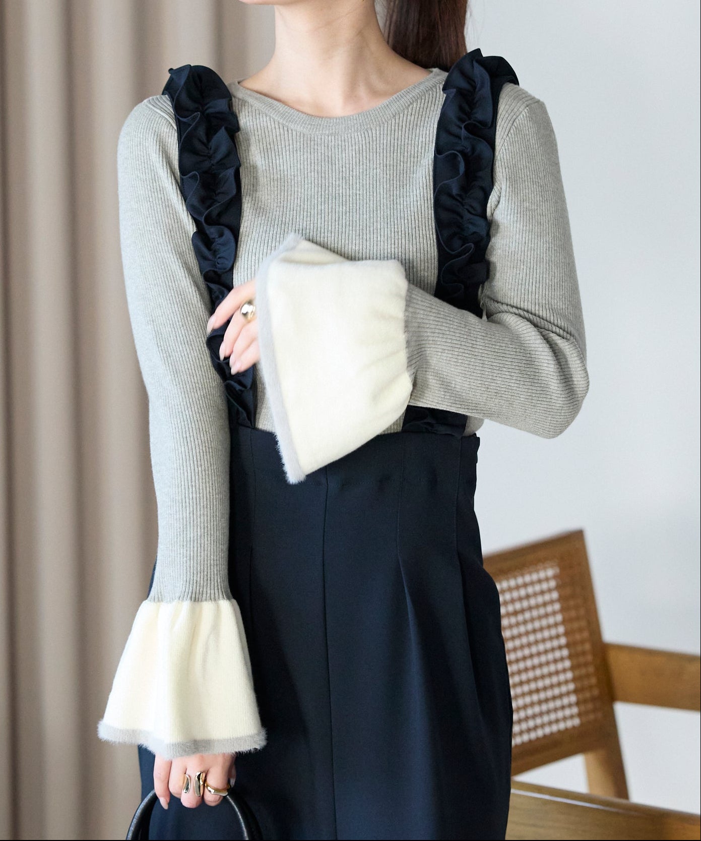 袖口のバイカラーデザインが、さりげなく華やぎを添えるフレアスリーブニット。