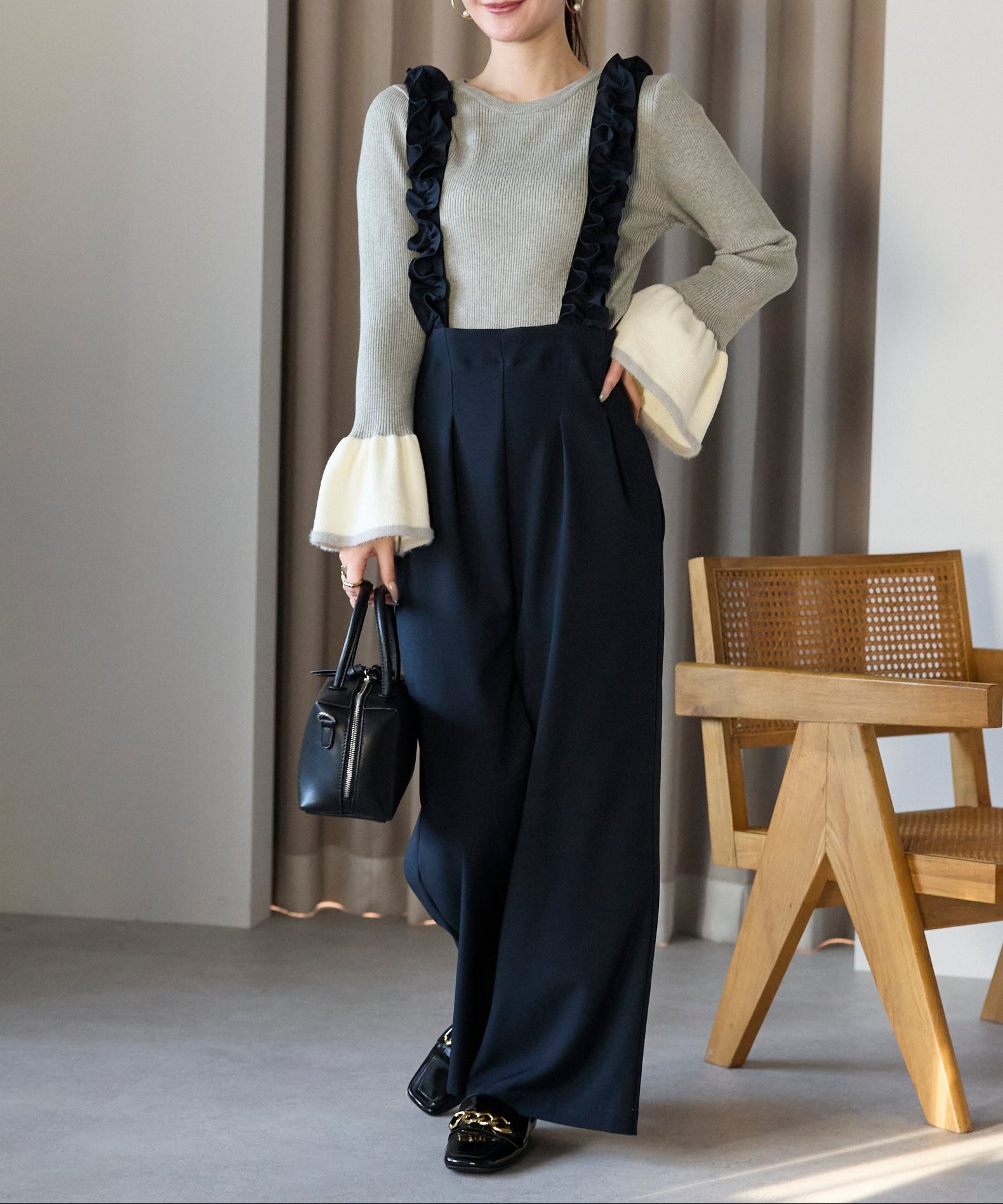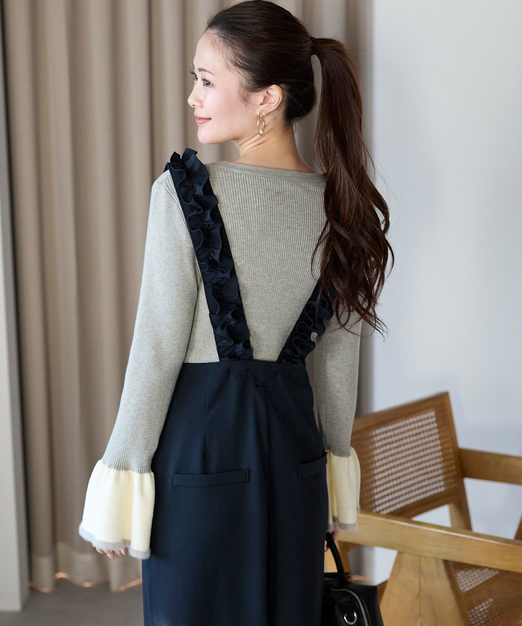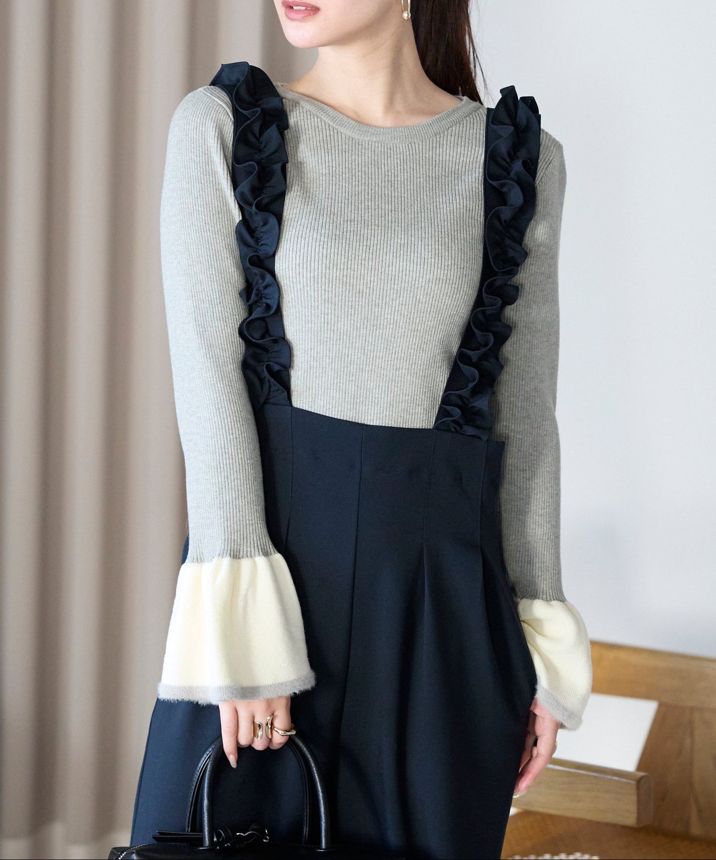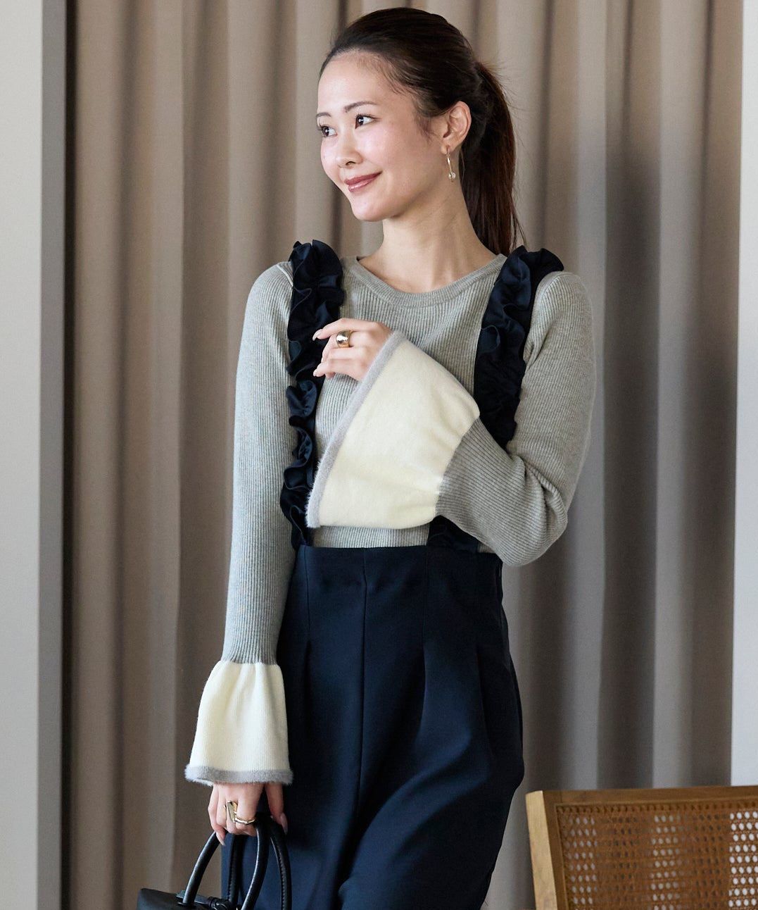 袖口のバイカラーデザインが、さりげなく華やぎを添えるフレアスリーブニット。
