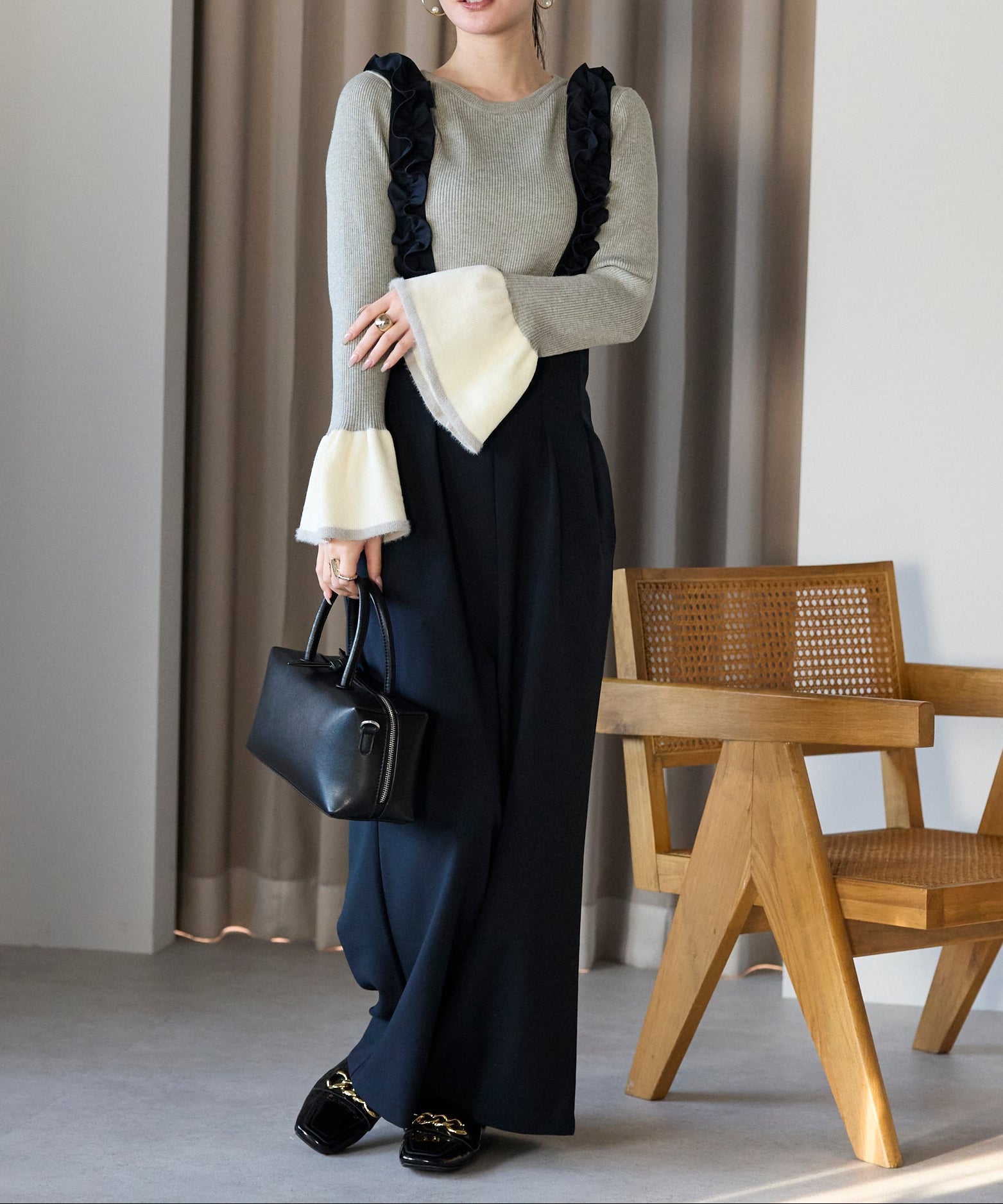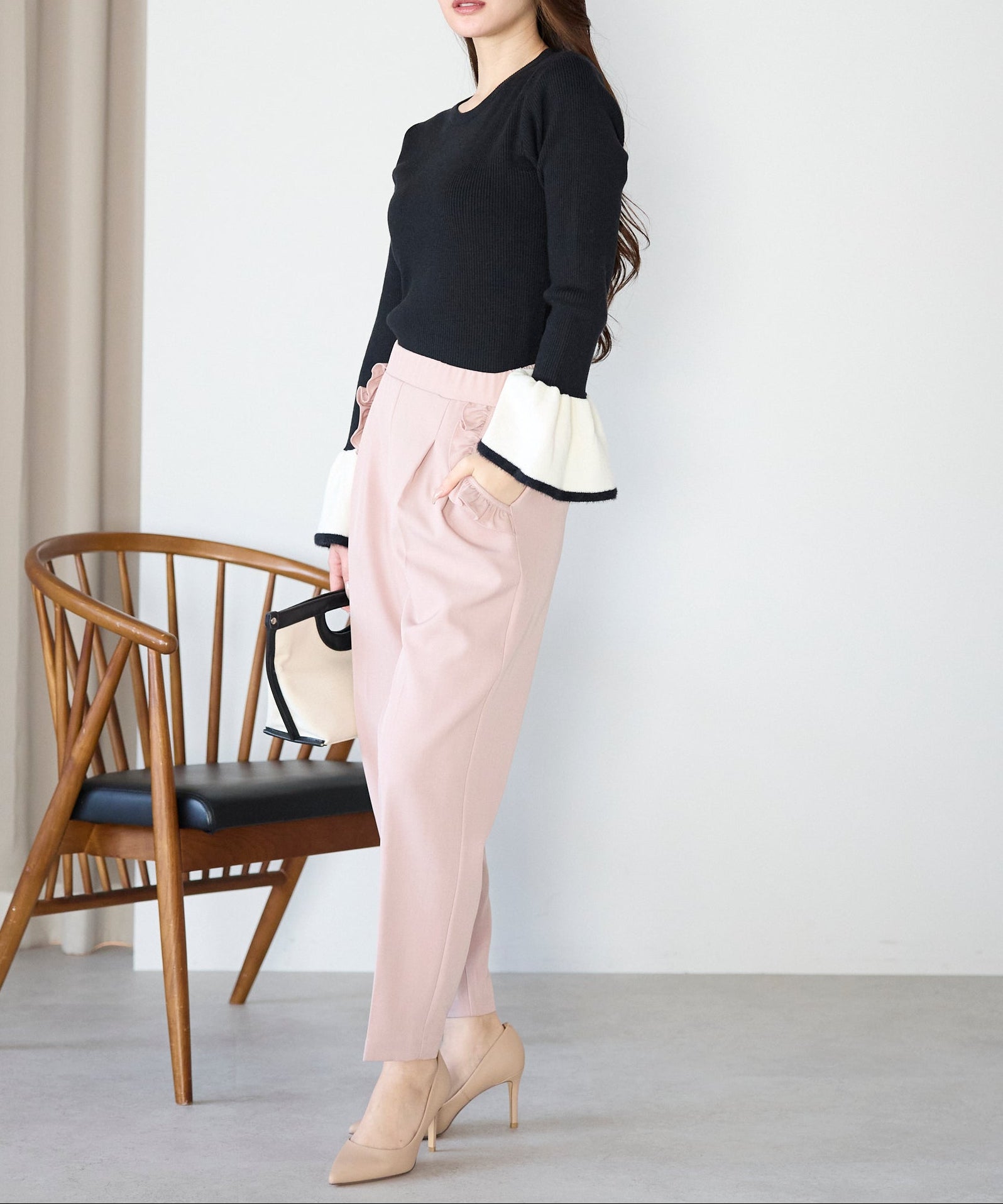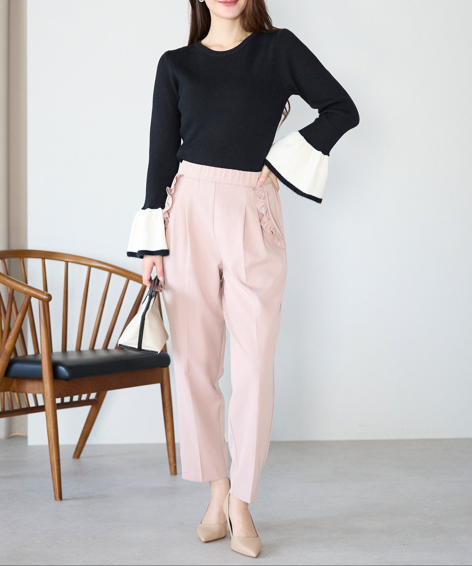手元に動きをつけるフレアスリーブが、シンプルなコーディネートにも自然な女性らしさをプラスします。