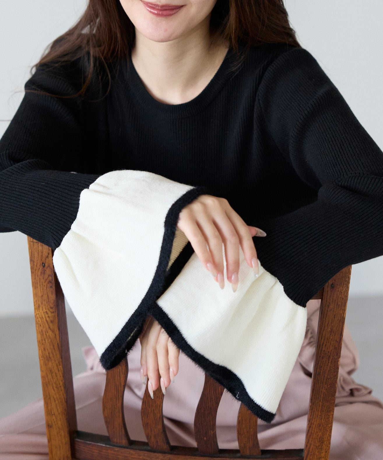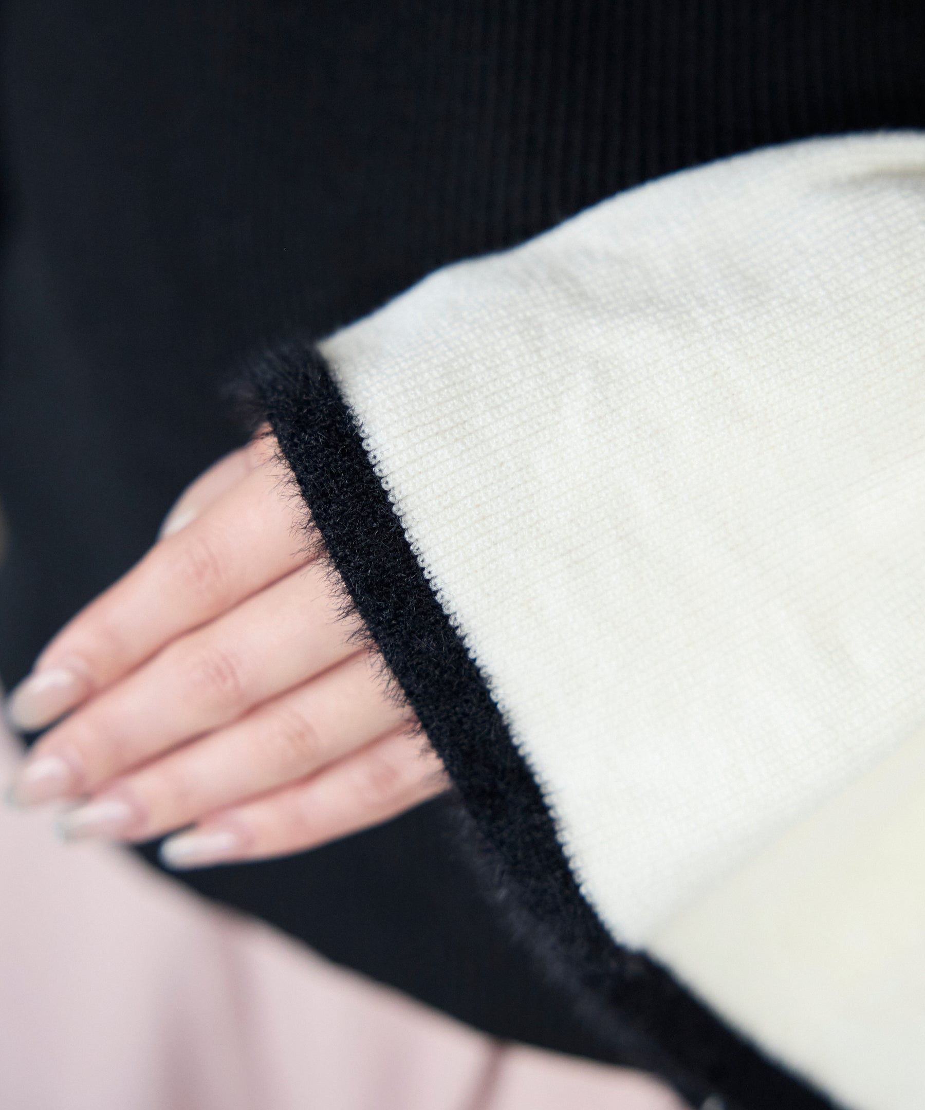 ◆素材感:程よい厚みのリブニット素材(袖口配色部分はシャギー糸使用)