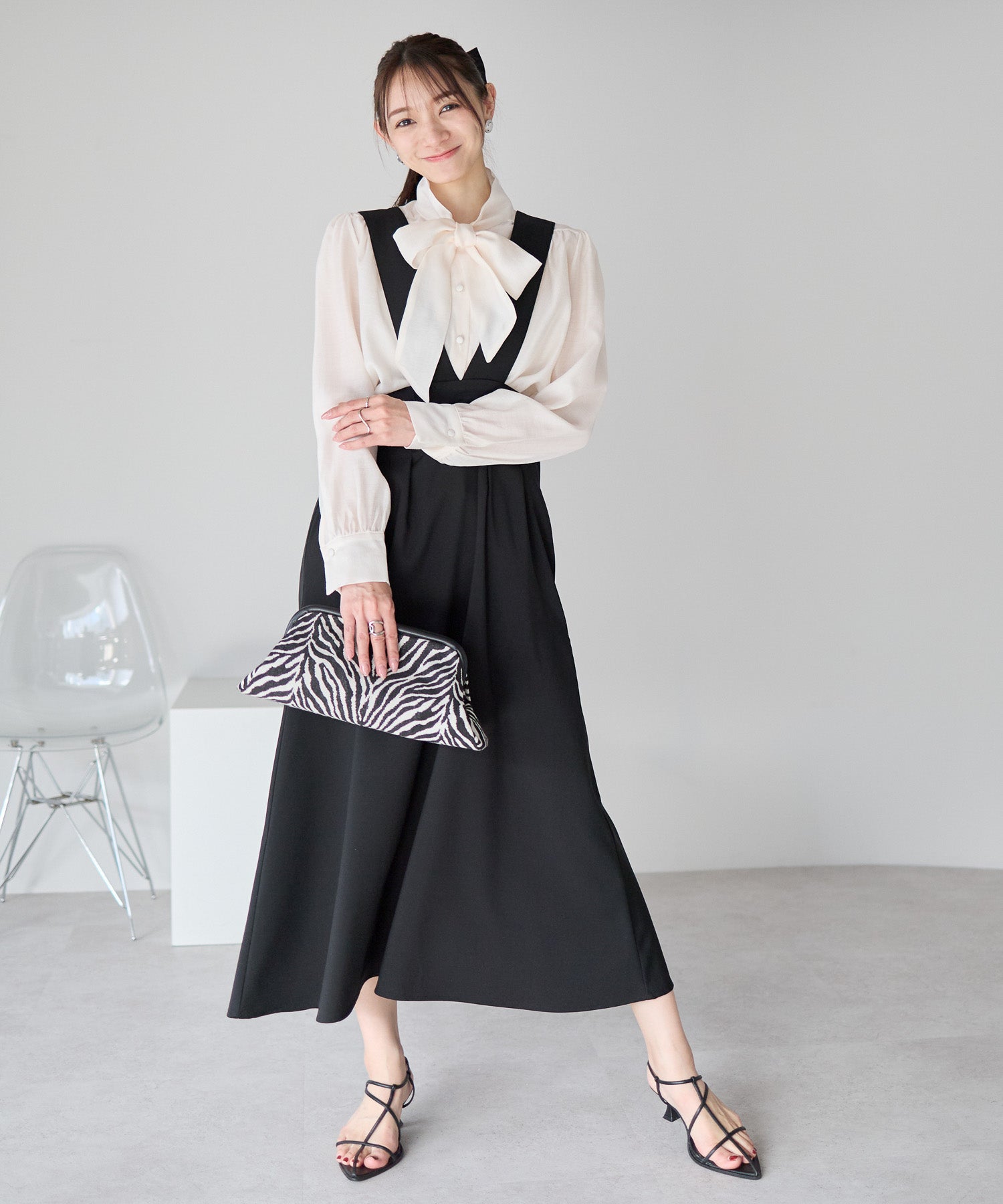 シンプルなフロントと印象的なバックスタイルのコントラストが、大人の可愛らしさを引き立てます。