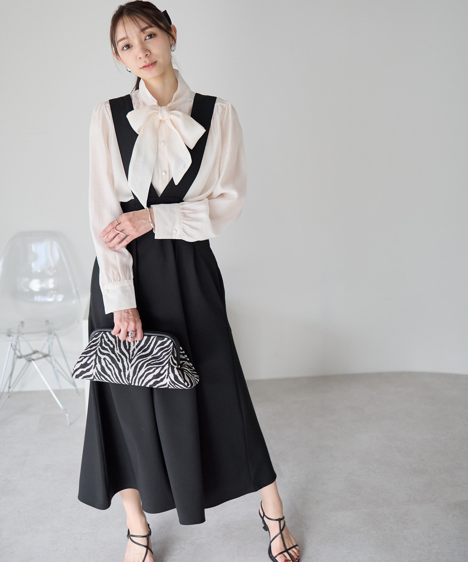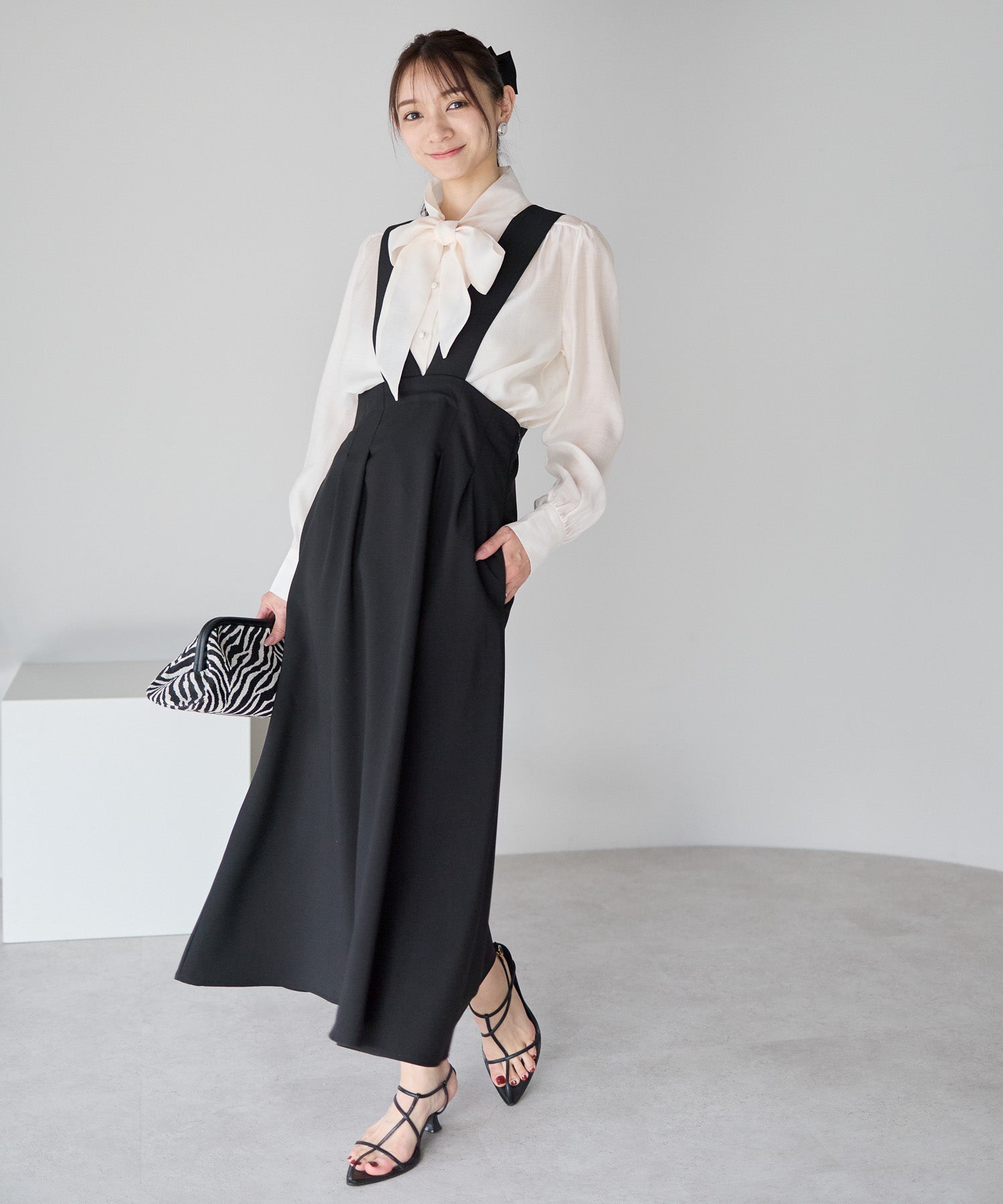 バックには立体感のあるリボンをあしらい、甘さを添えつつも全体は上品にまとまる一枚です。