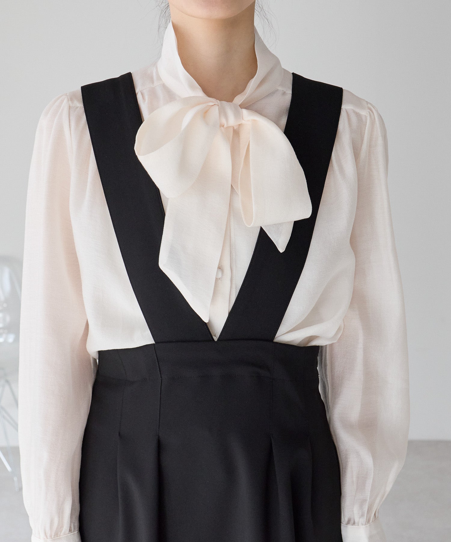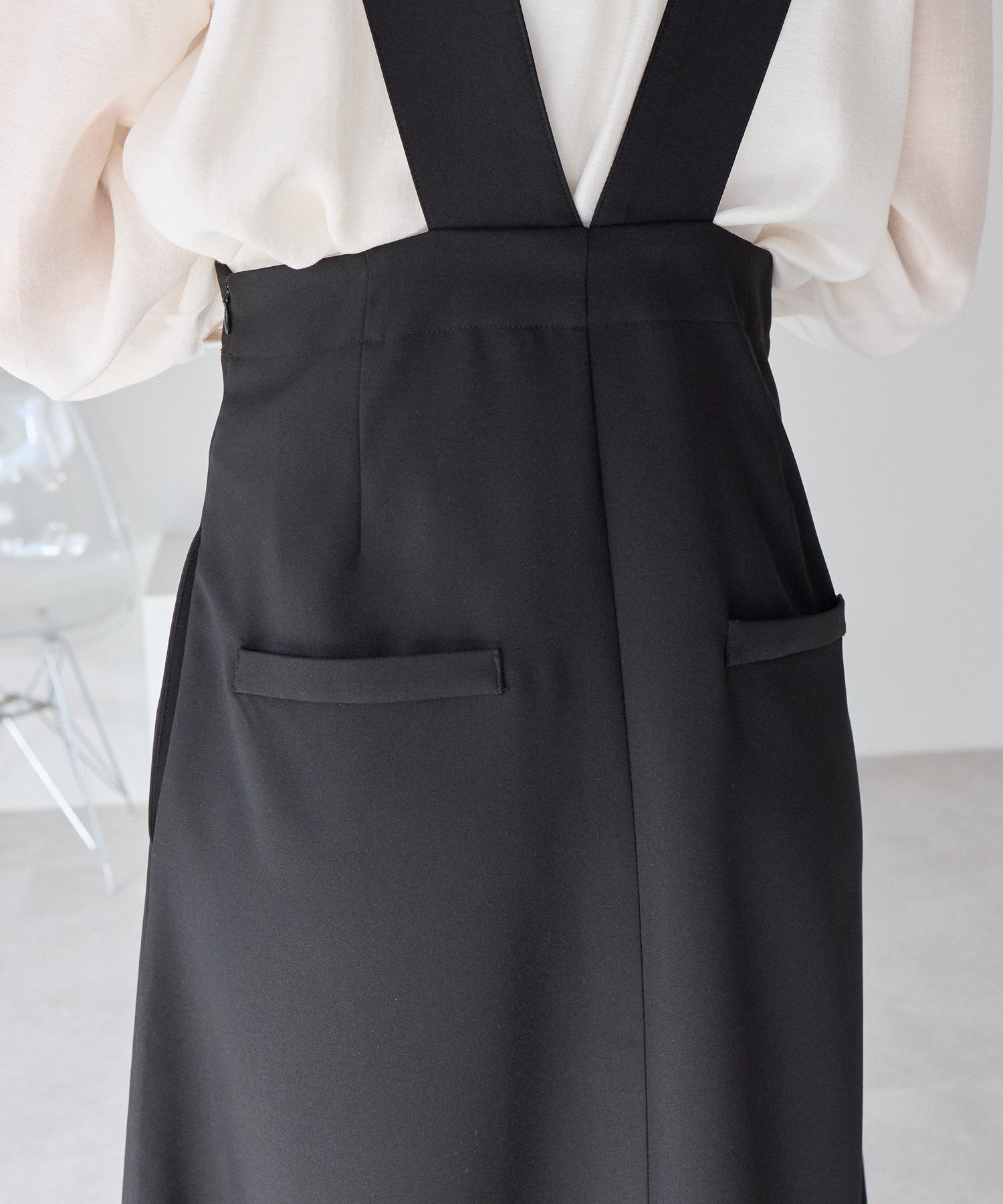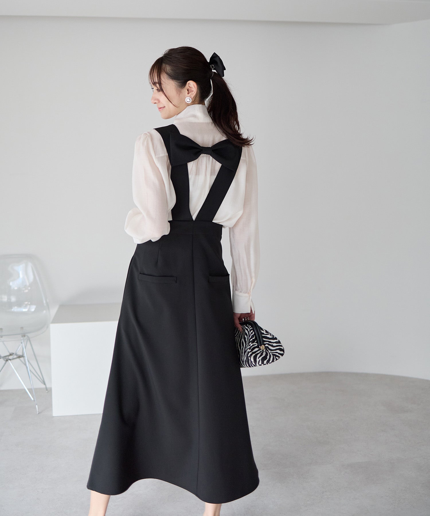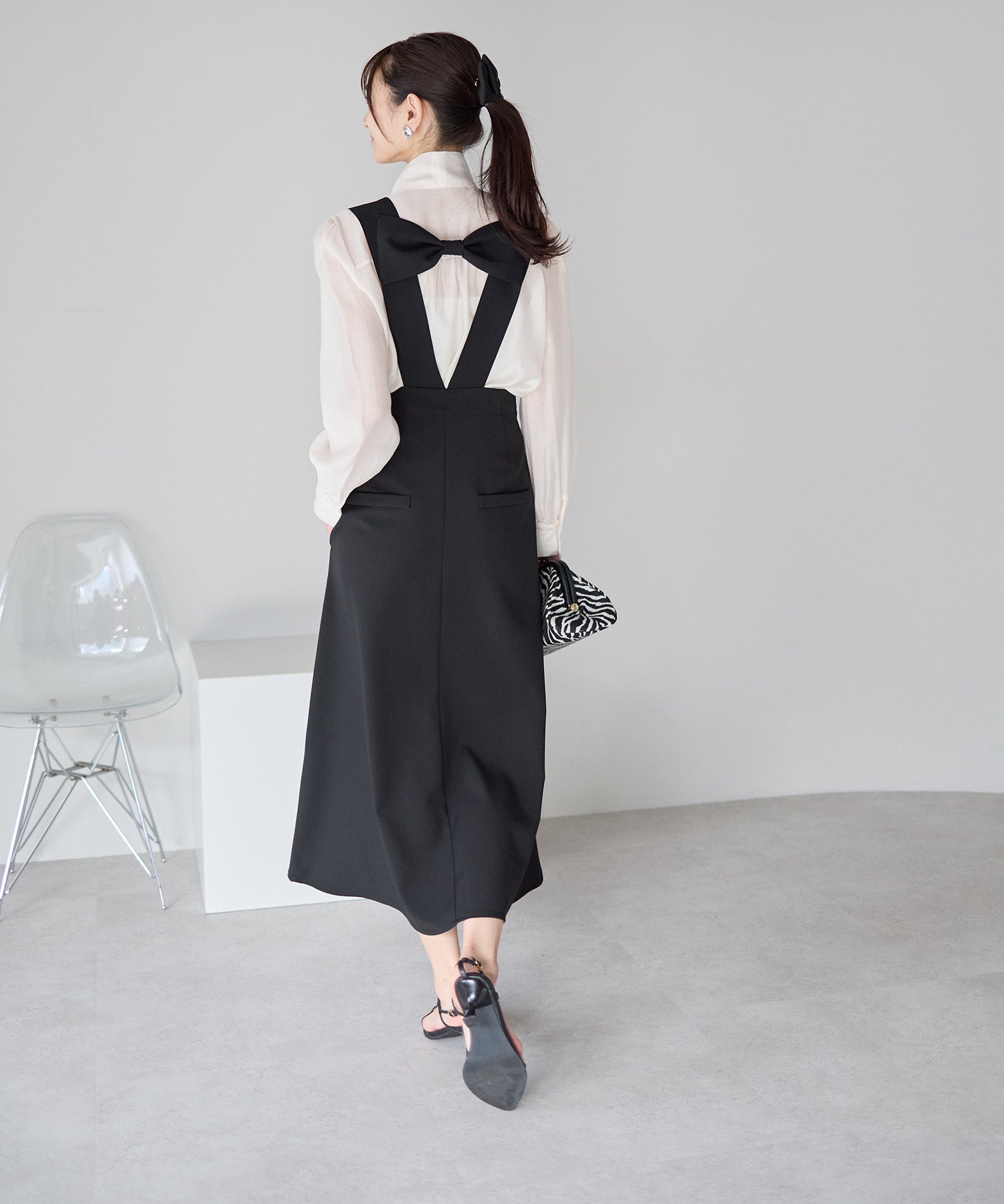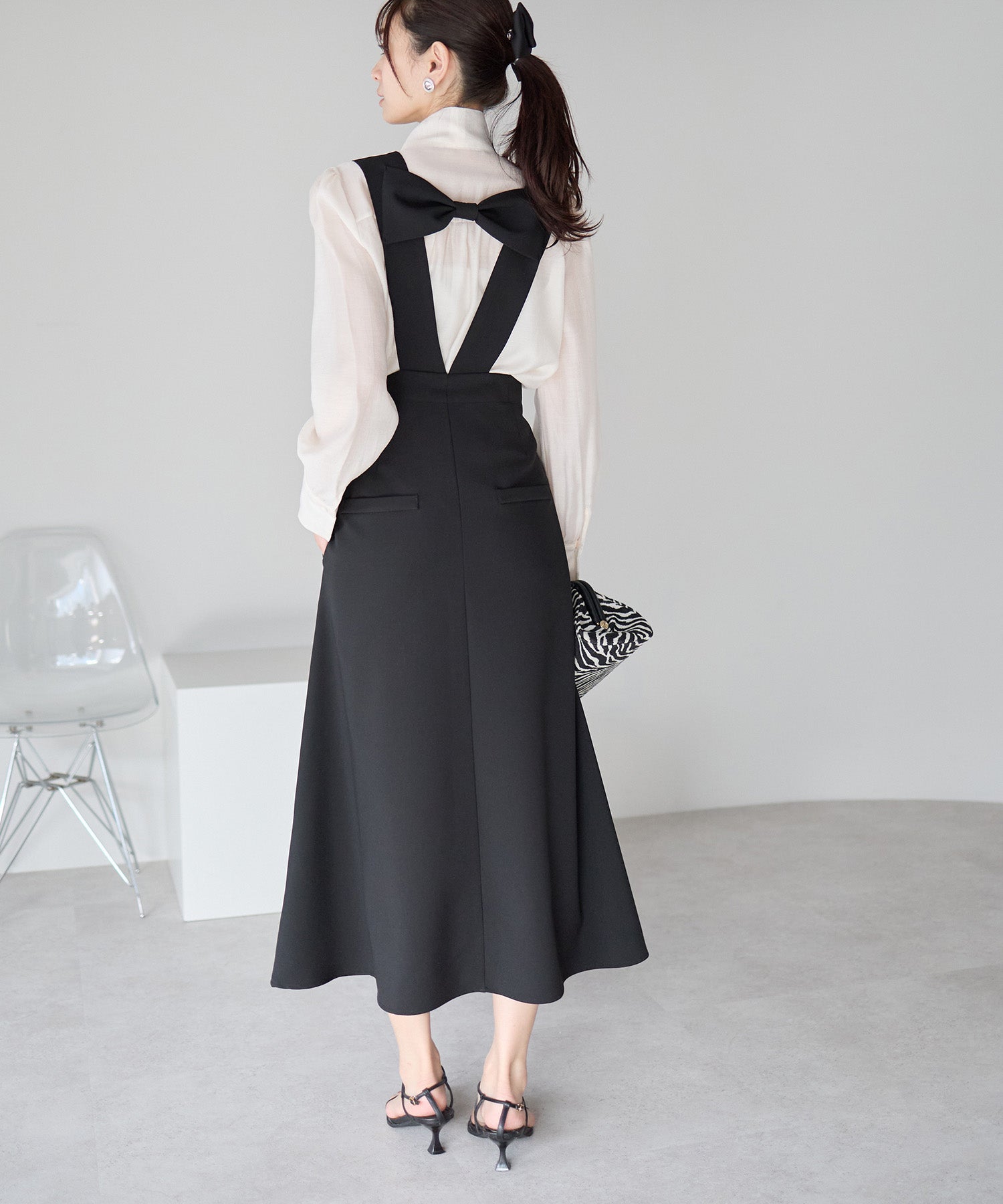 後ろ姿にさりげない華やぎを添える、バックリボンデザインのジャンパースカート。