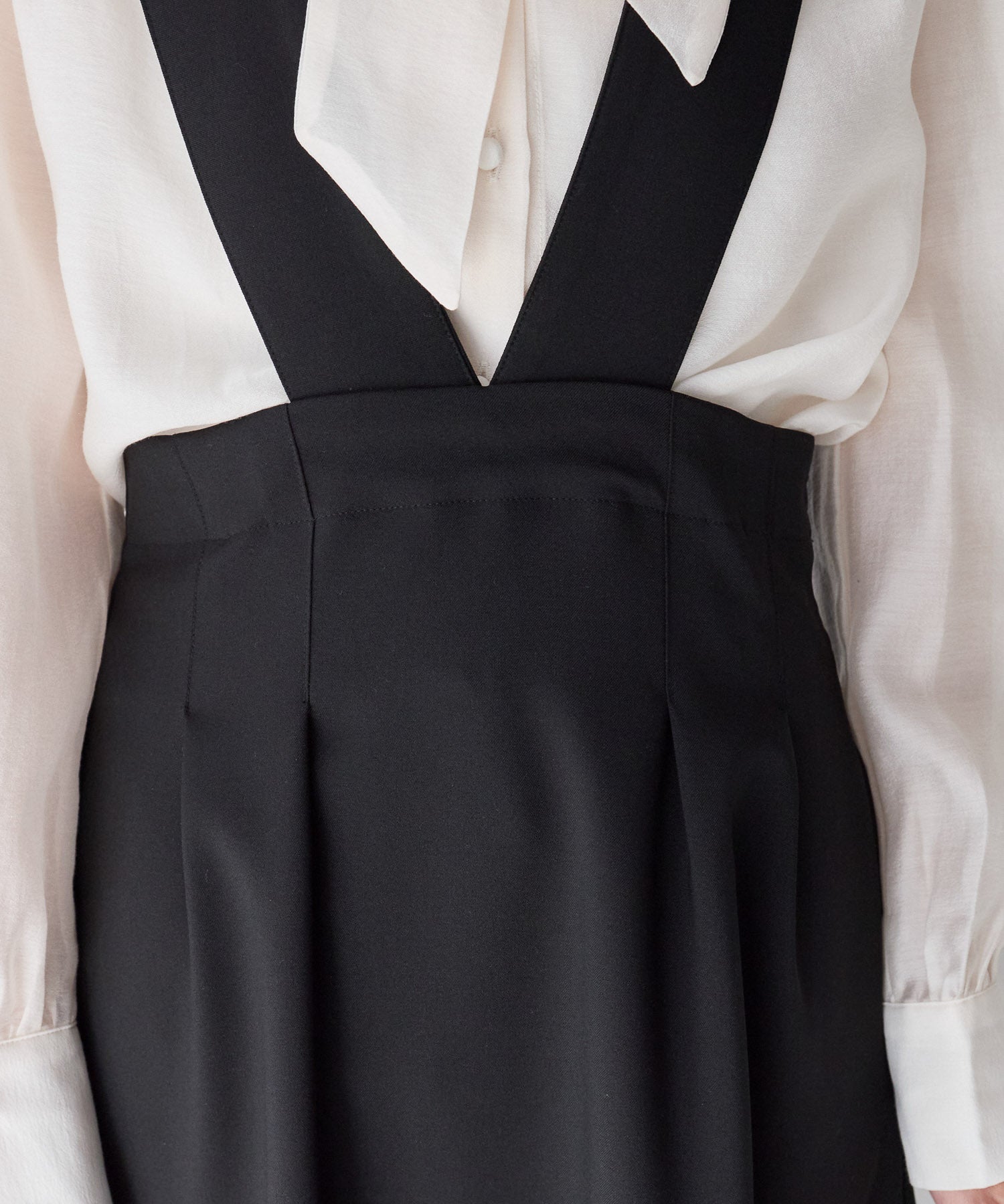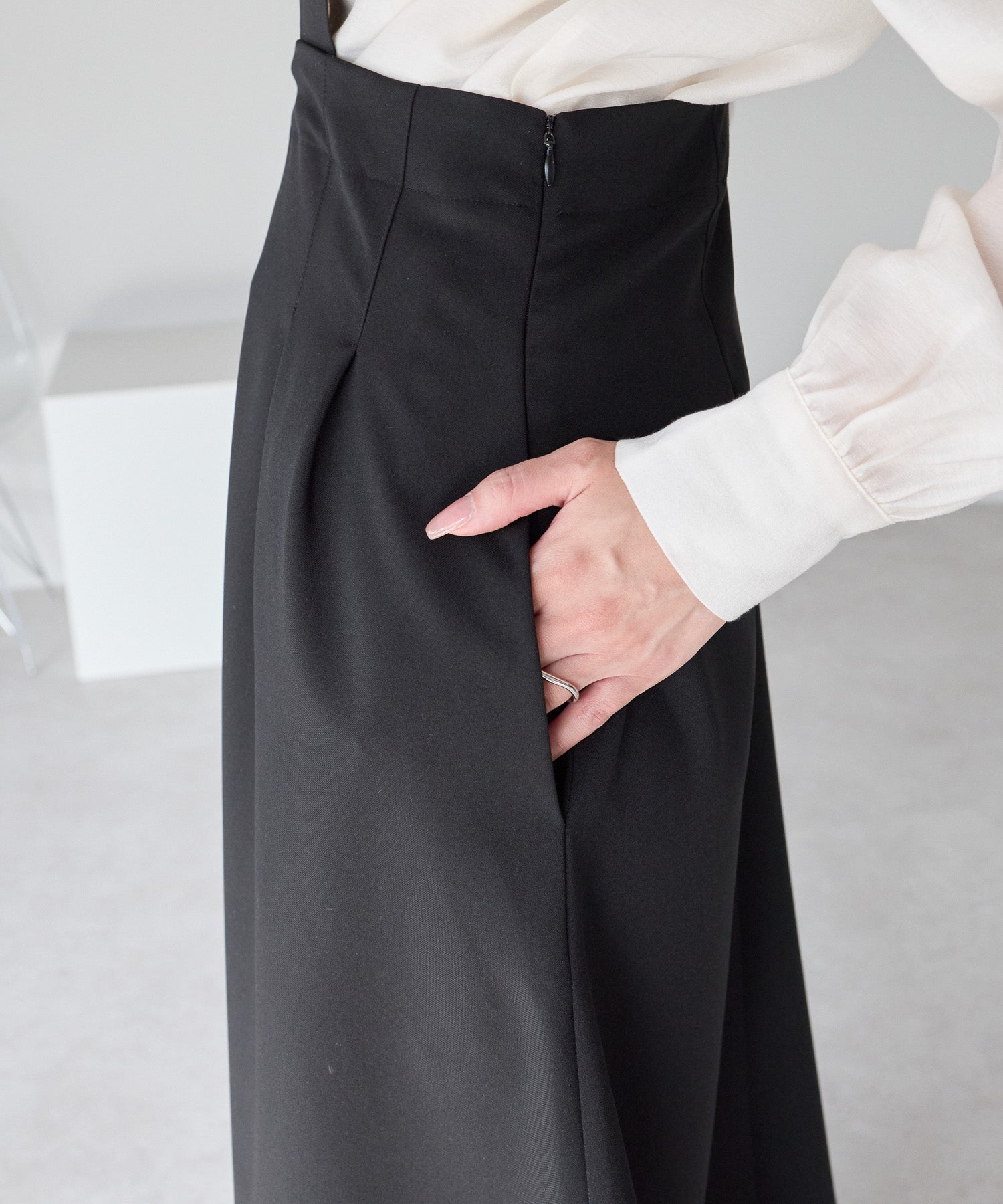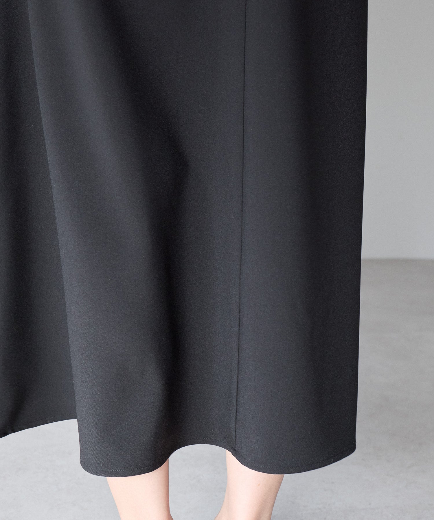 ウエスト位置を高めに見せるバランスと、裾に向かってなだらかに広がるシルエットが、脚長効果と美しい立ち姿を演出します。