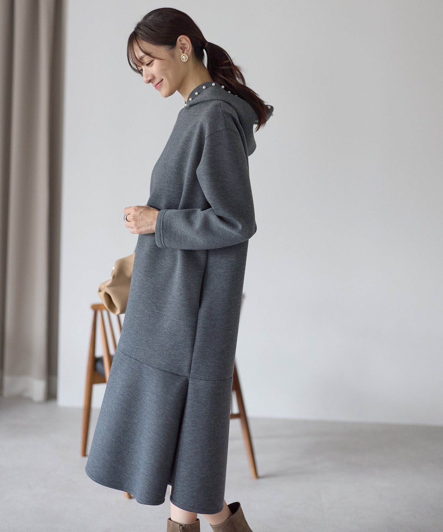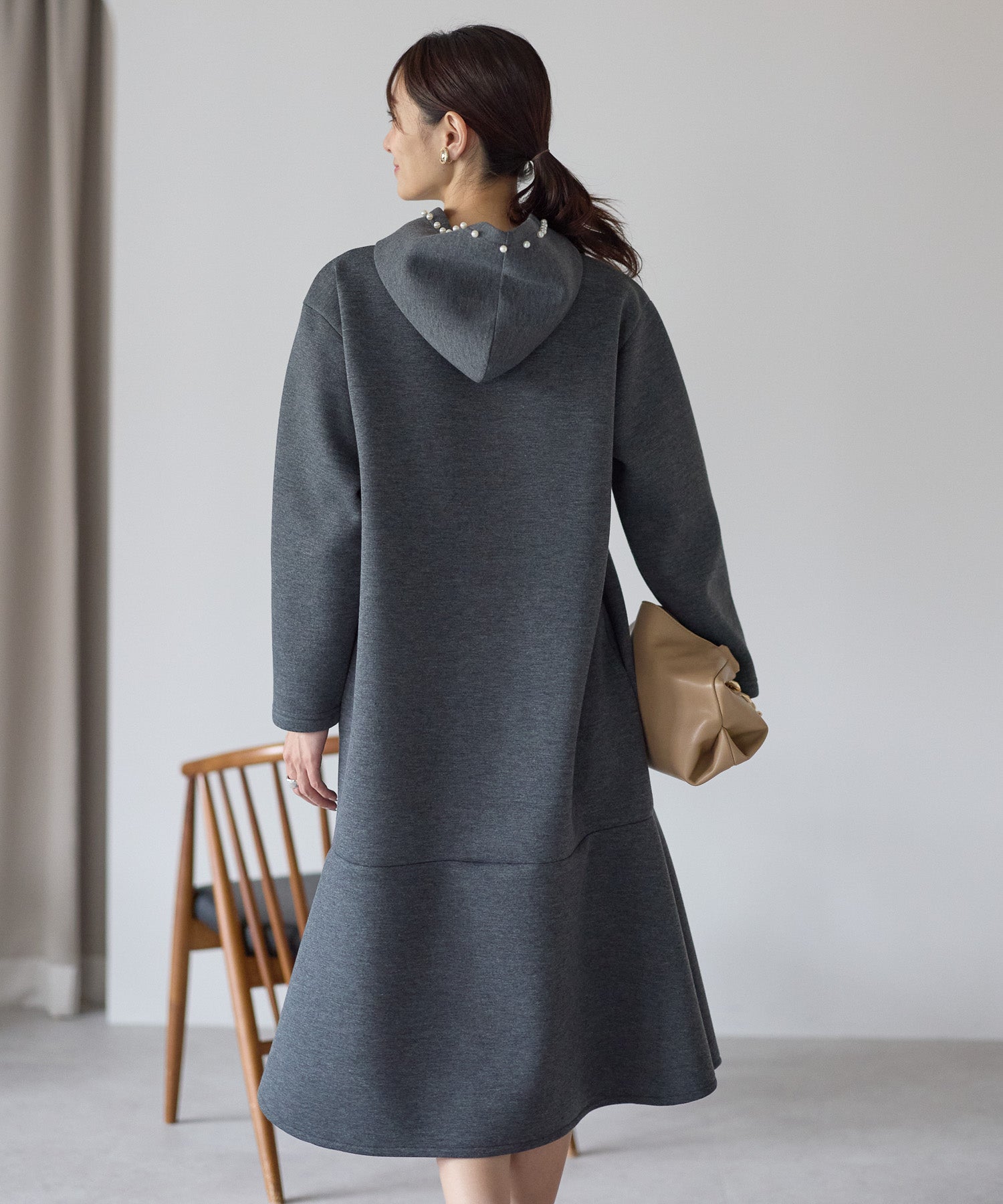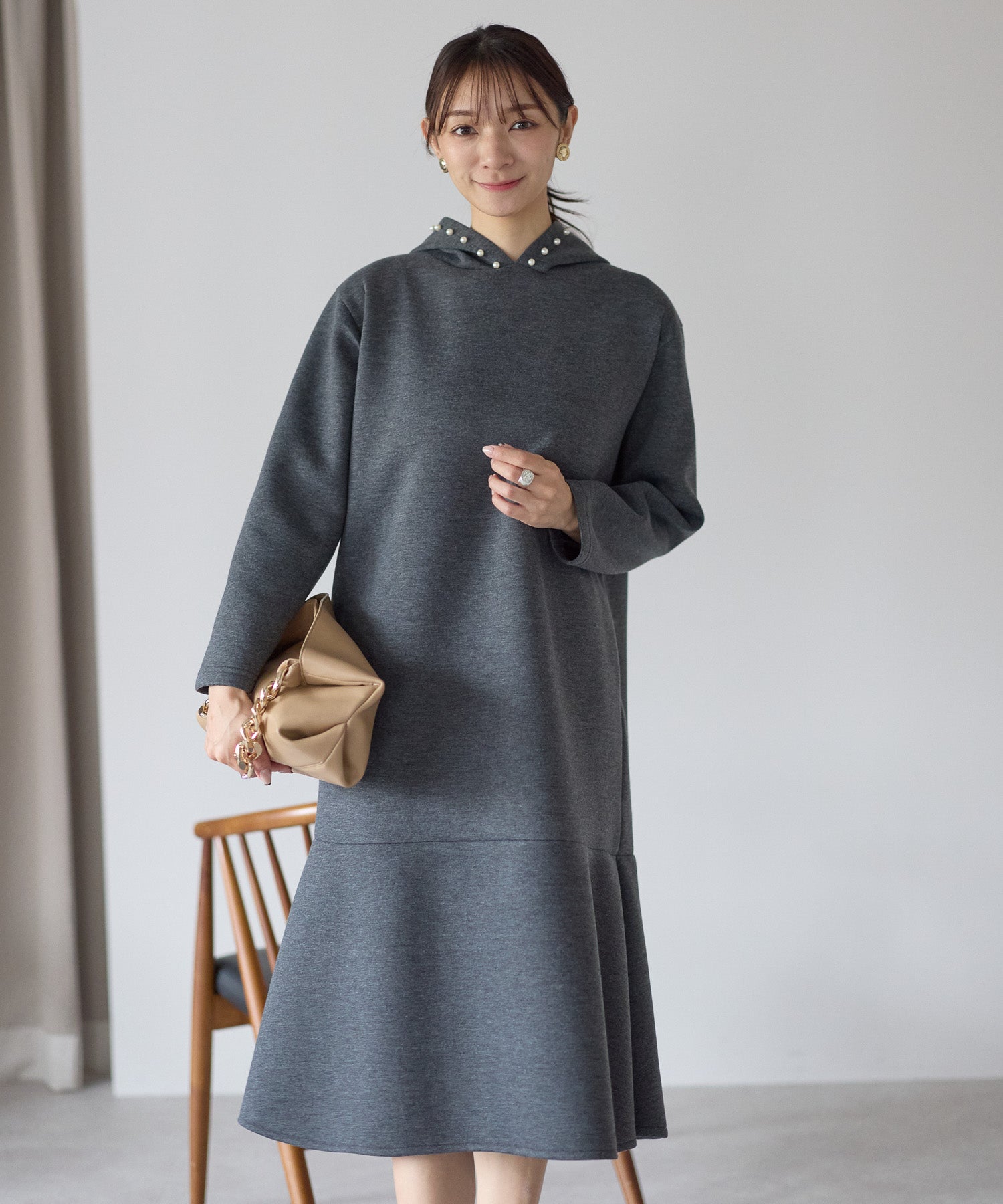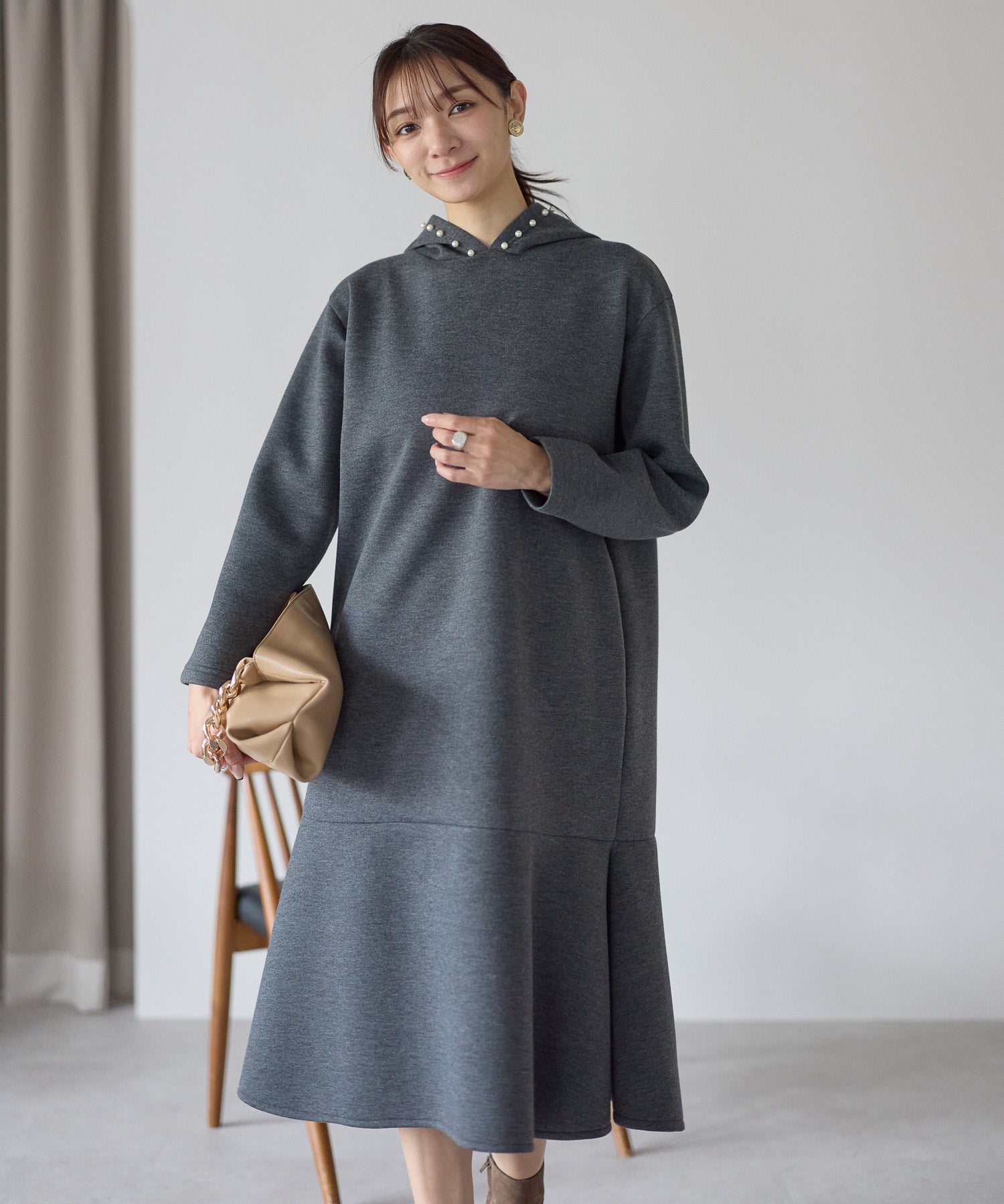 フード部分にあしらったパールが、カジュアルになりがちなフーディーデザインを上品に昇華したワンピース。