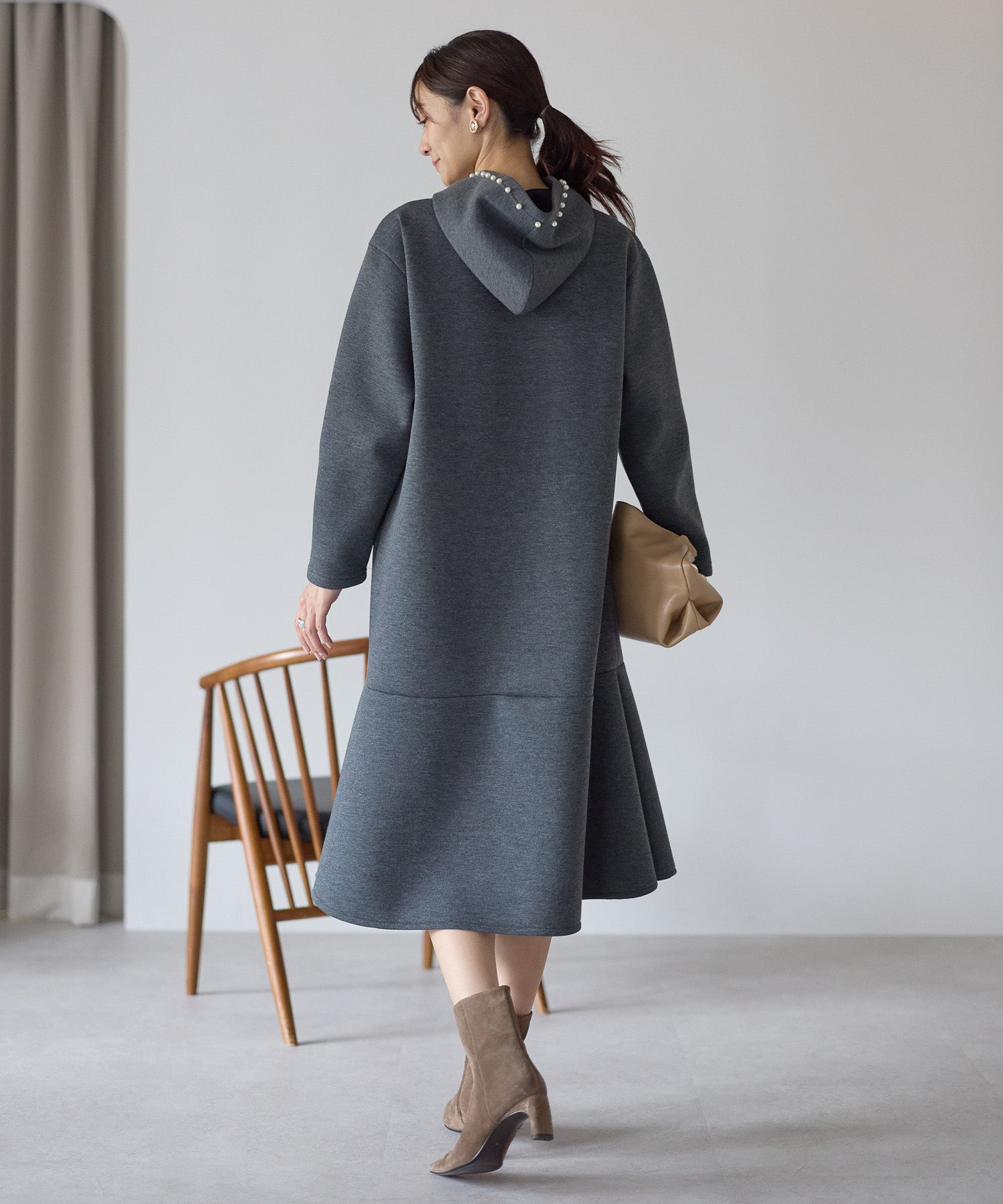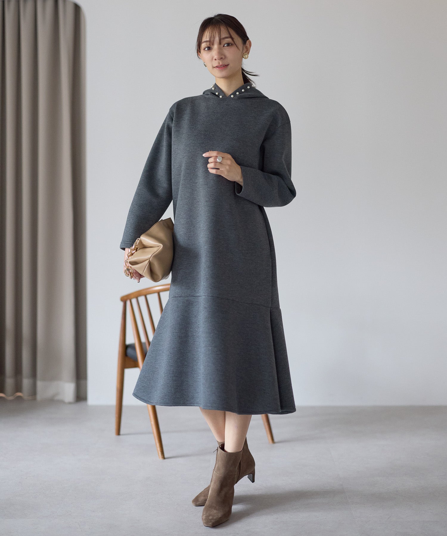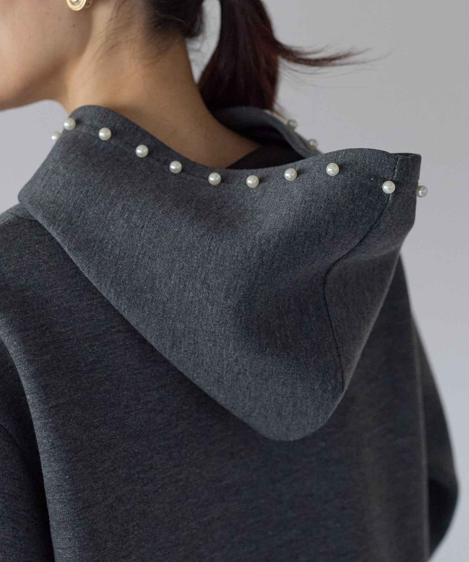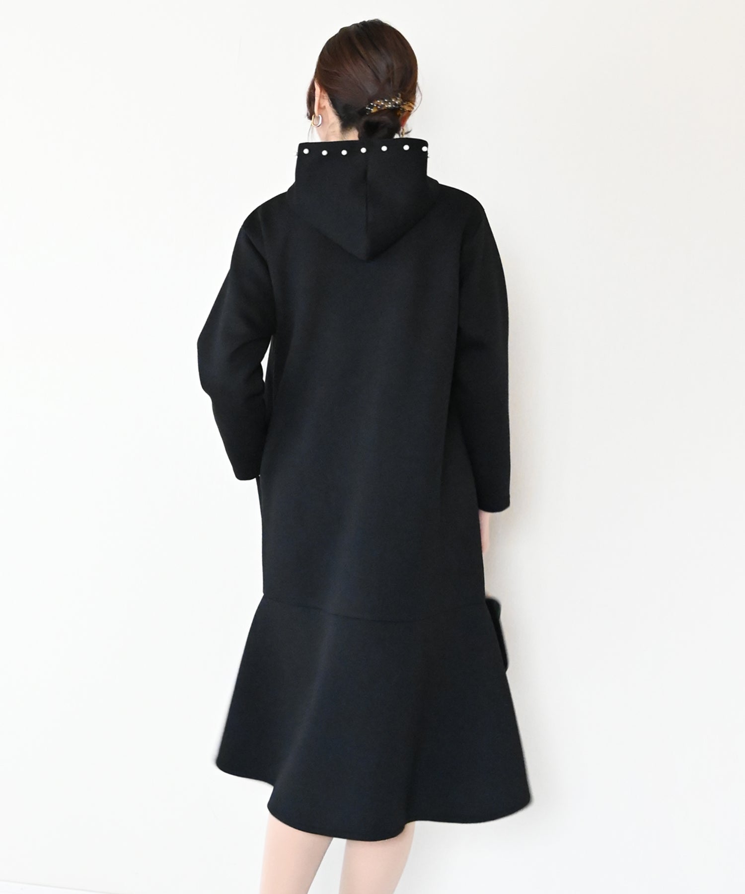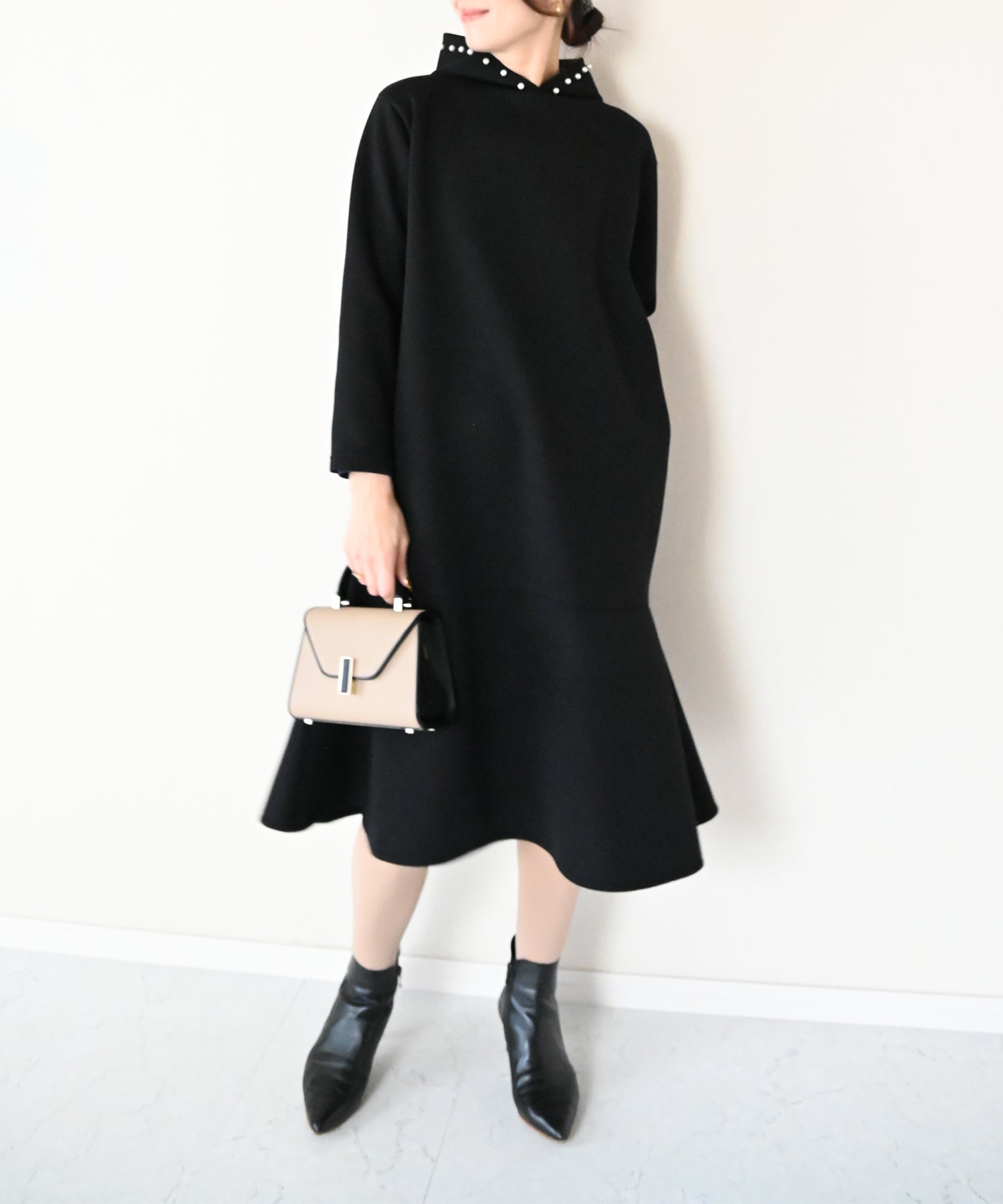 フード部分にあしらったパールが、カジュアルになりがちなフーディーデザインを上品に昇華したワンピース。