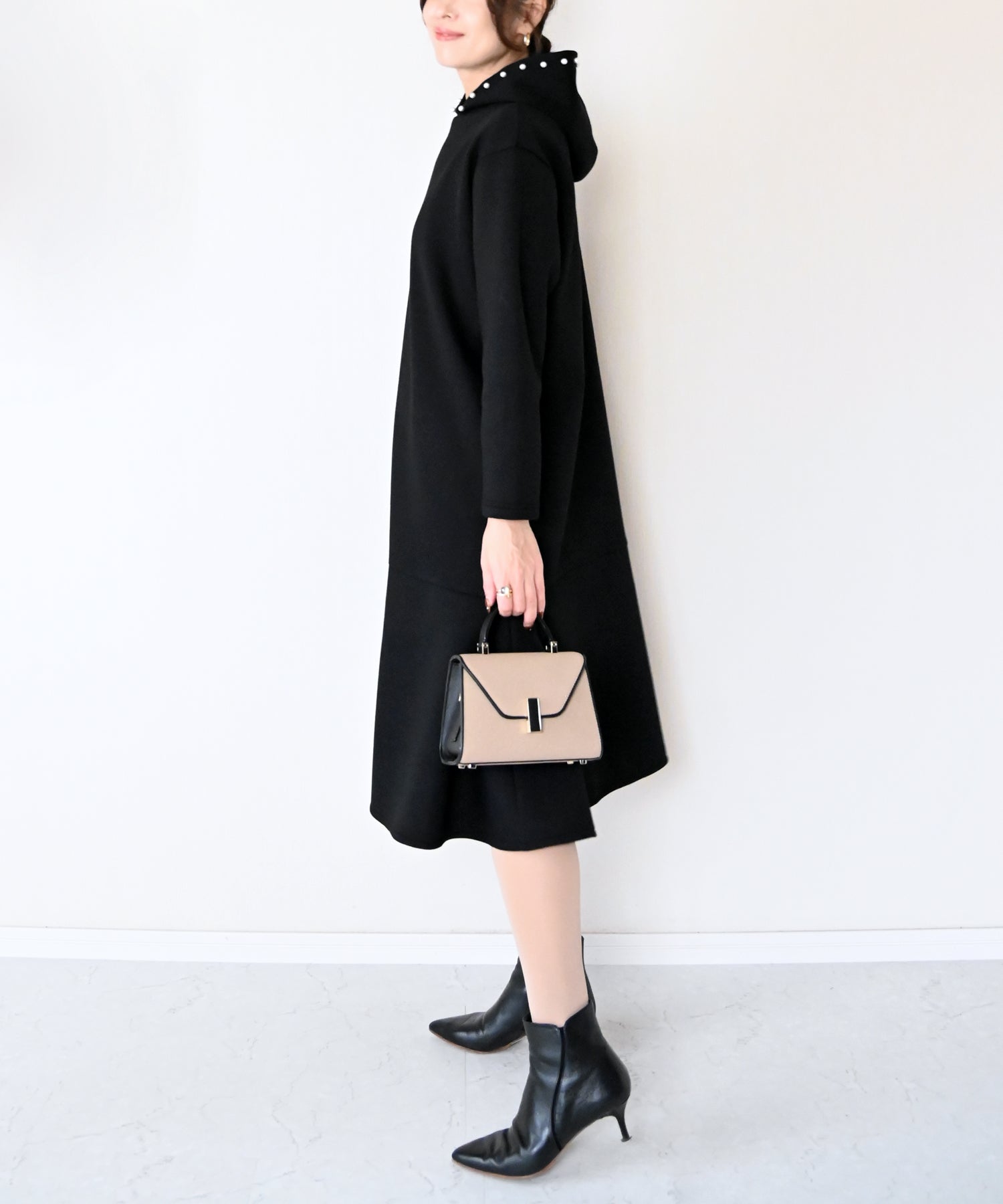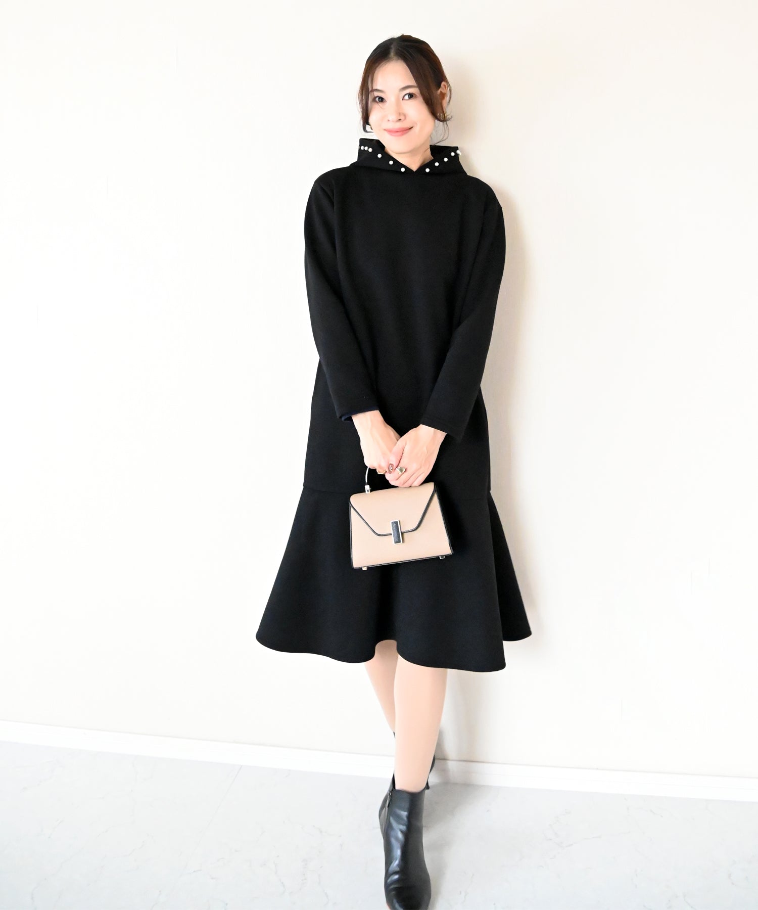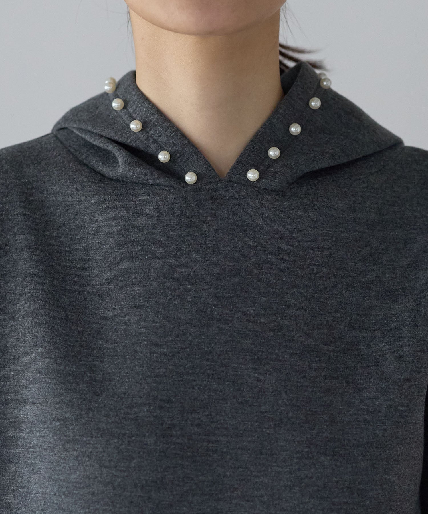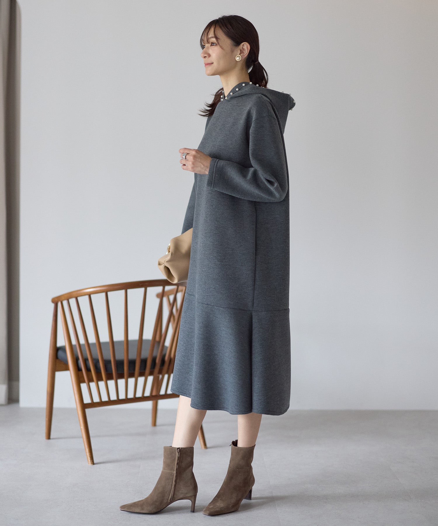 フード部分にあしらったパールが、カジュアルになりがちなフーディーデザインを上品に昇華したワンピース。