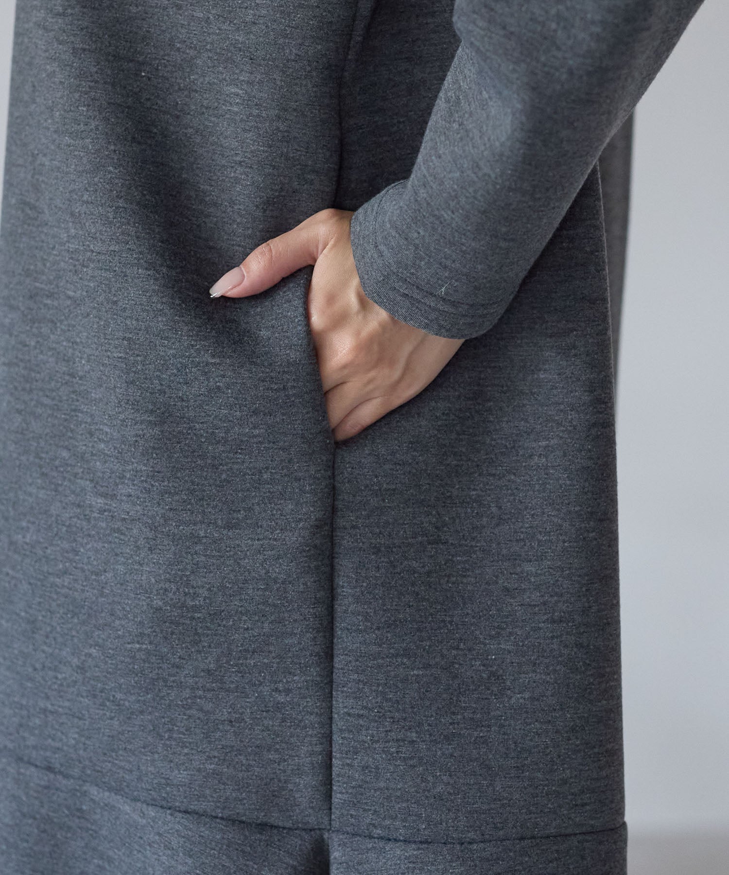 ほどよい厚みのポンチ素材を使用しており、身体のラインを拾いにくく、きちんと感のある着こなしに。