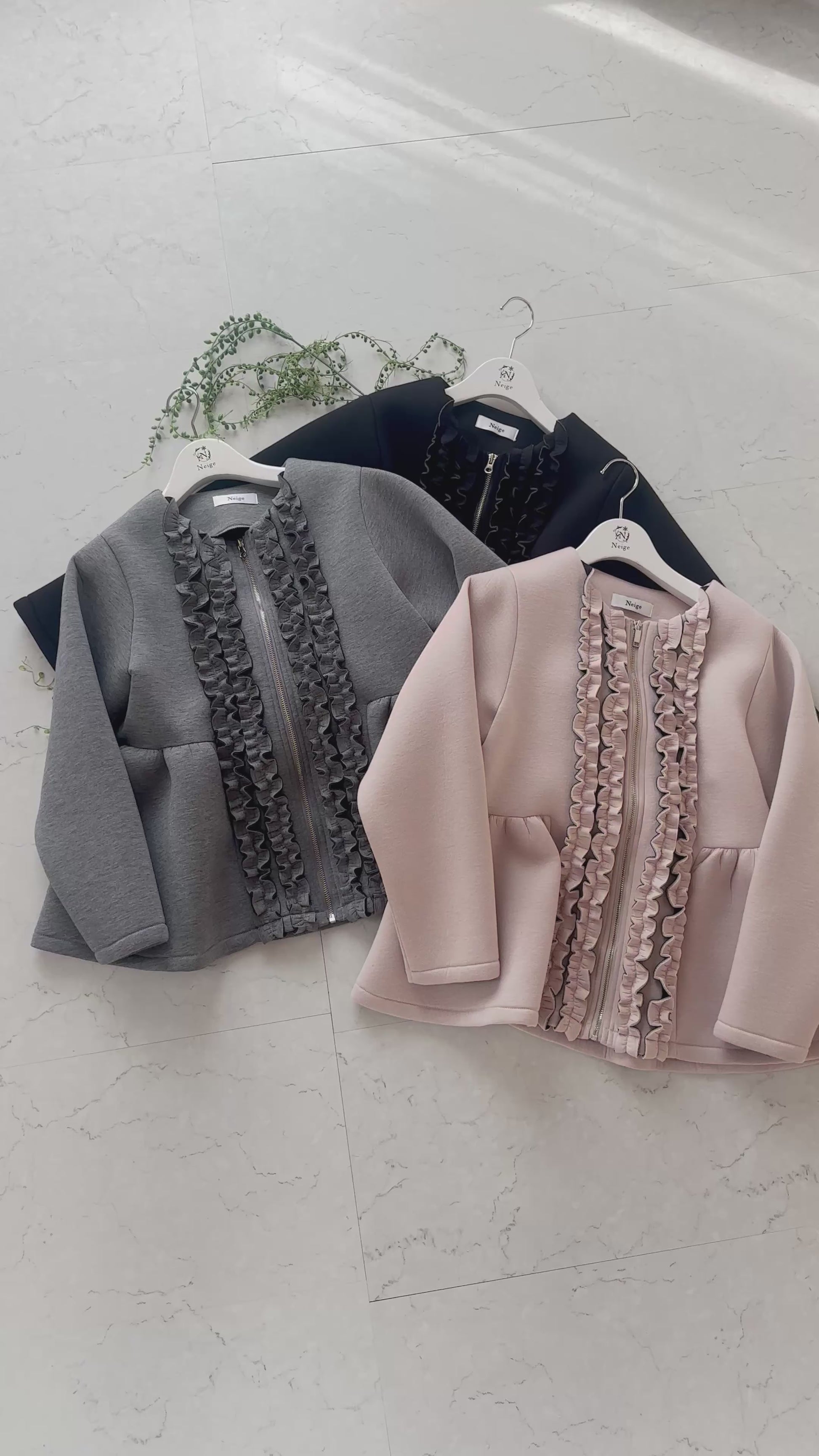 縦に連なるフリルが印象的な、フロントデザインが主役のペプラムジャケット。