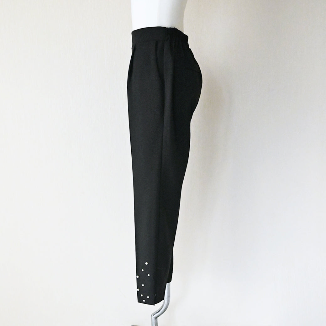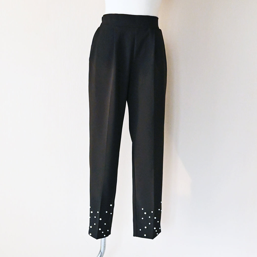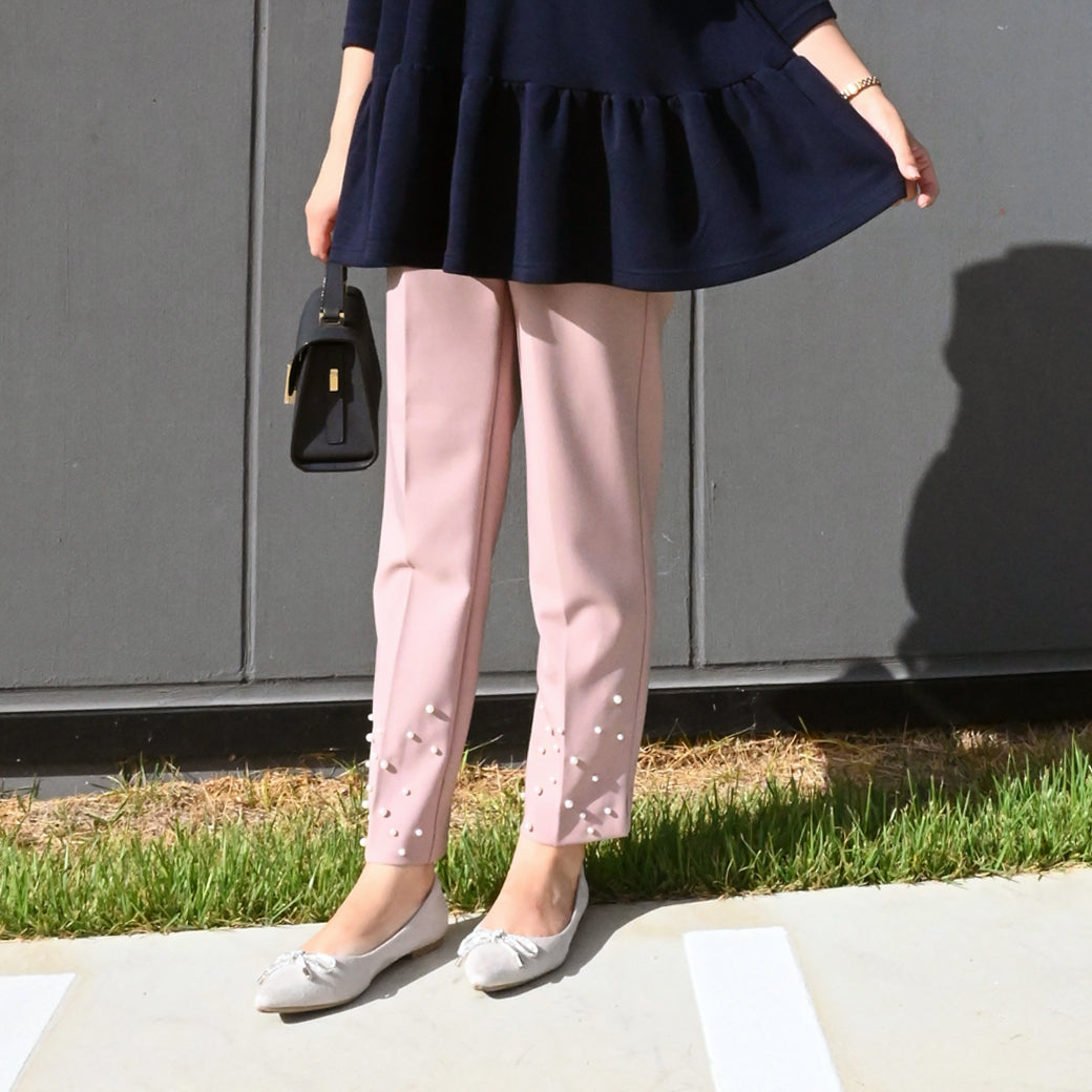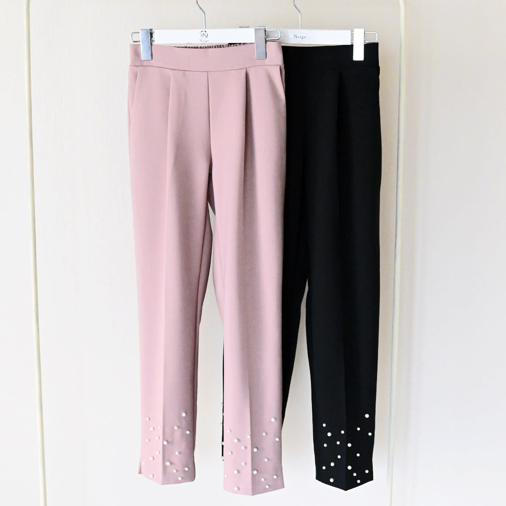 裾に大小さまざまなパールをランダムに散りばめた、華やかで上品なテーパードパンツ。