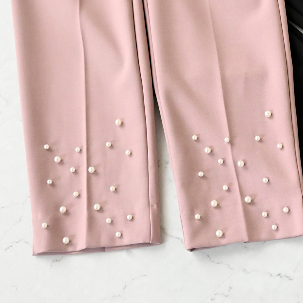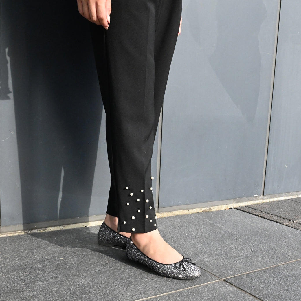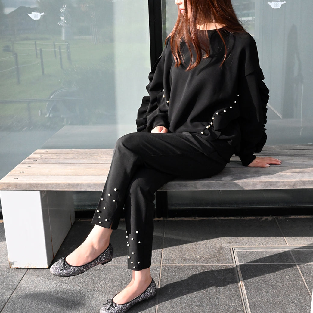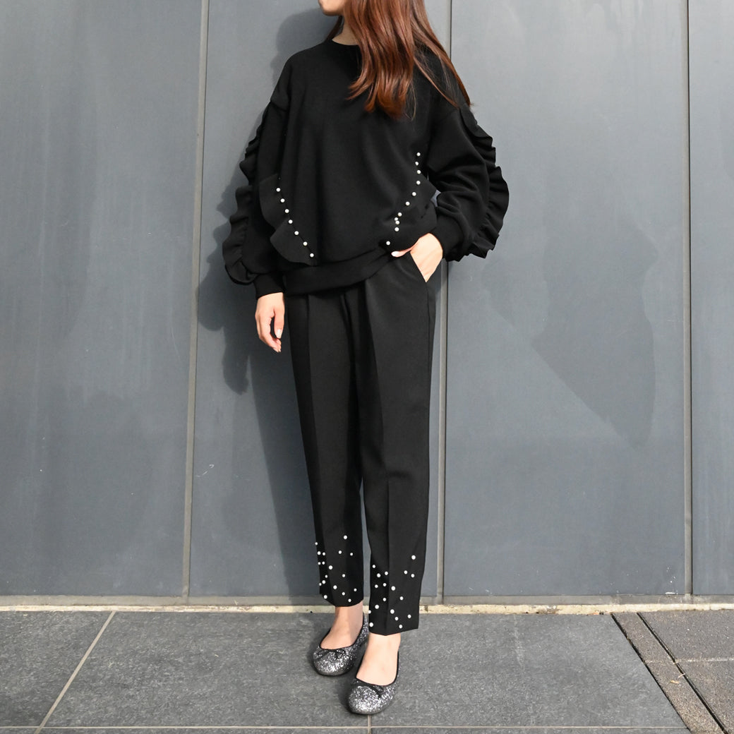 裾に大小さまざまなパールをランダムに散りばめた、華やかで上品なテーパードパンツ。