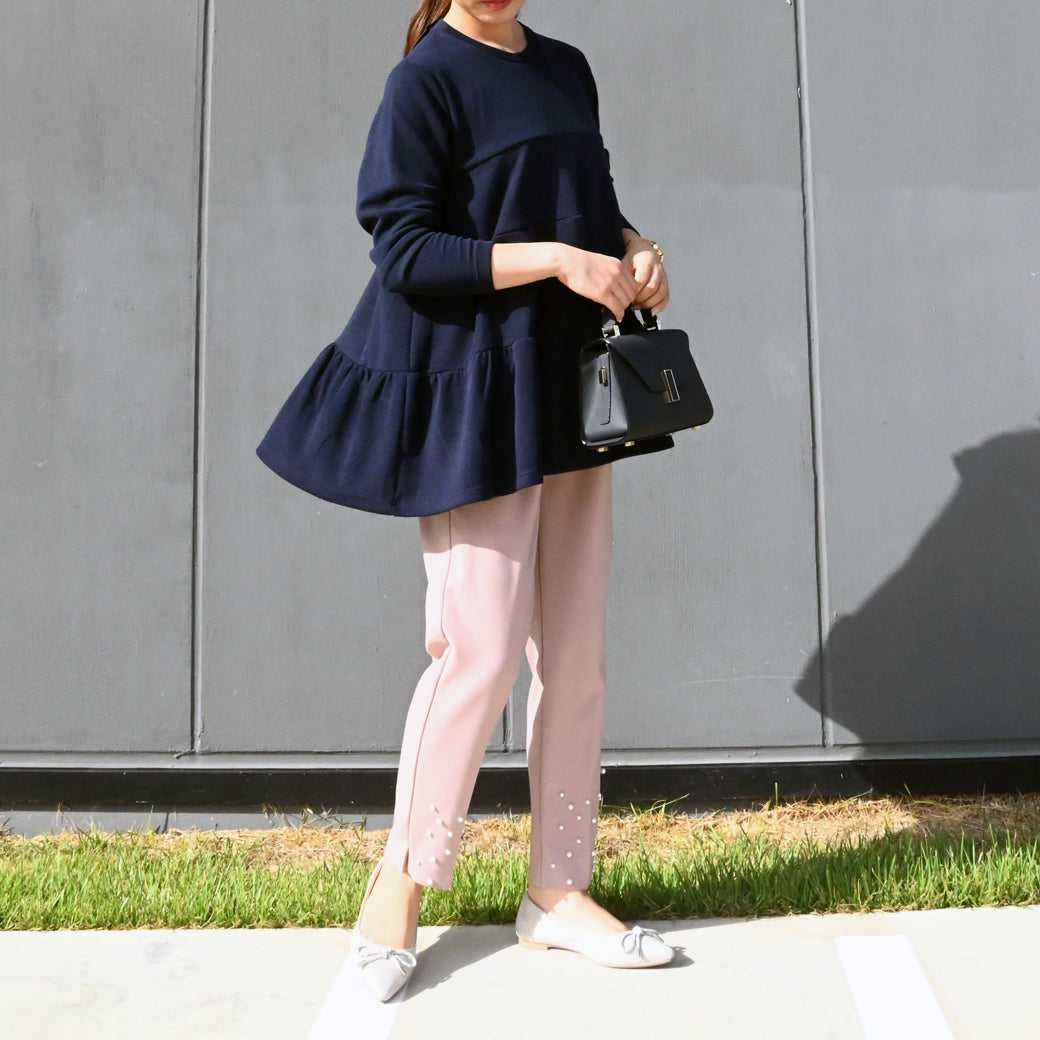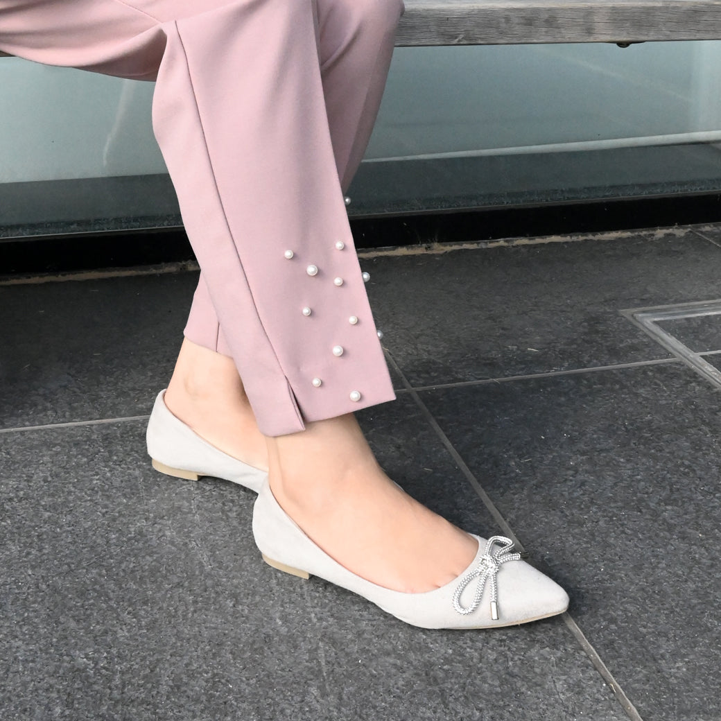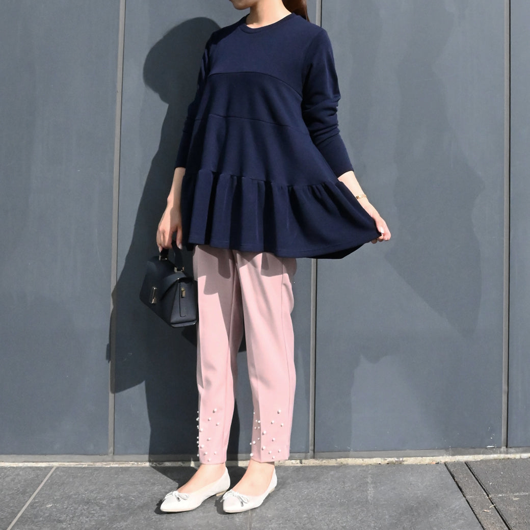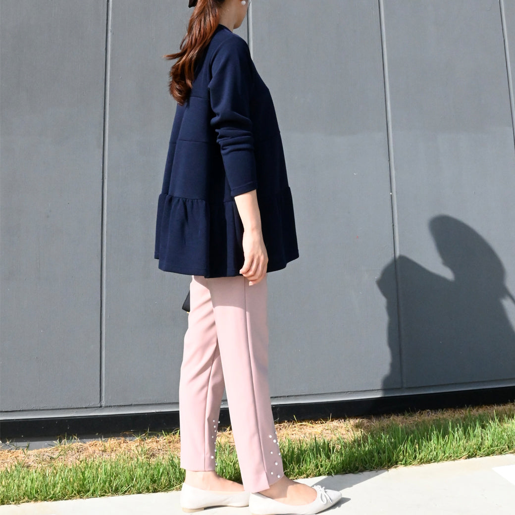 裾に大小さまざまなパールをランダムに散りばめた、華やかで上品なテーパードパンツ。