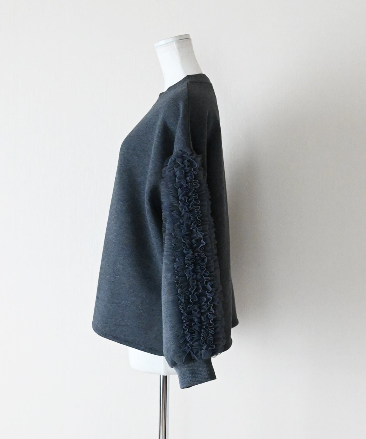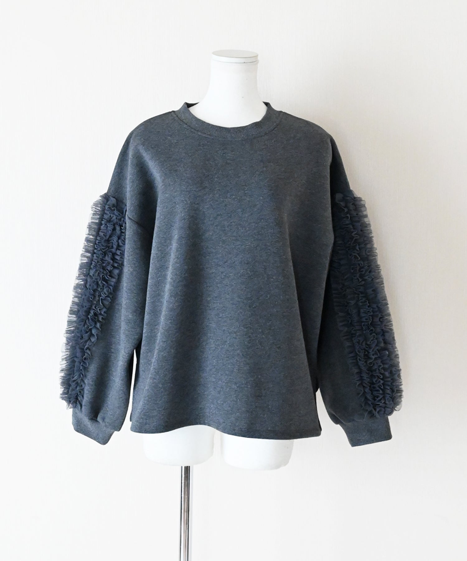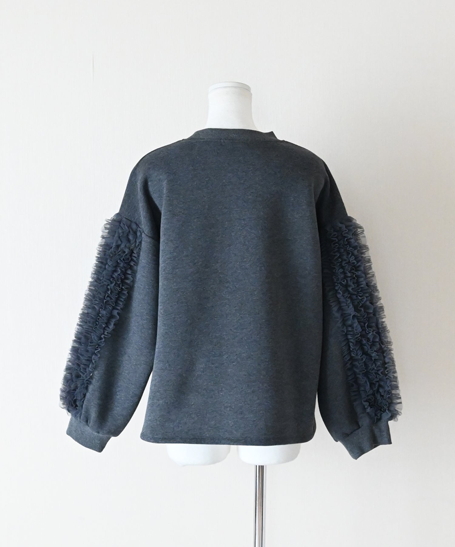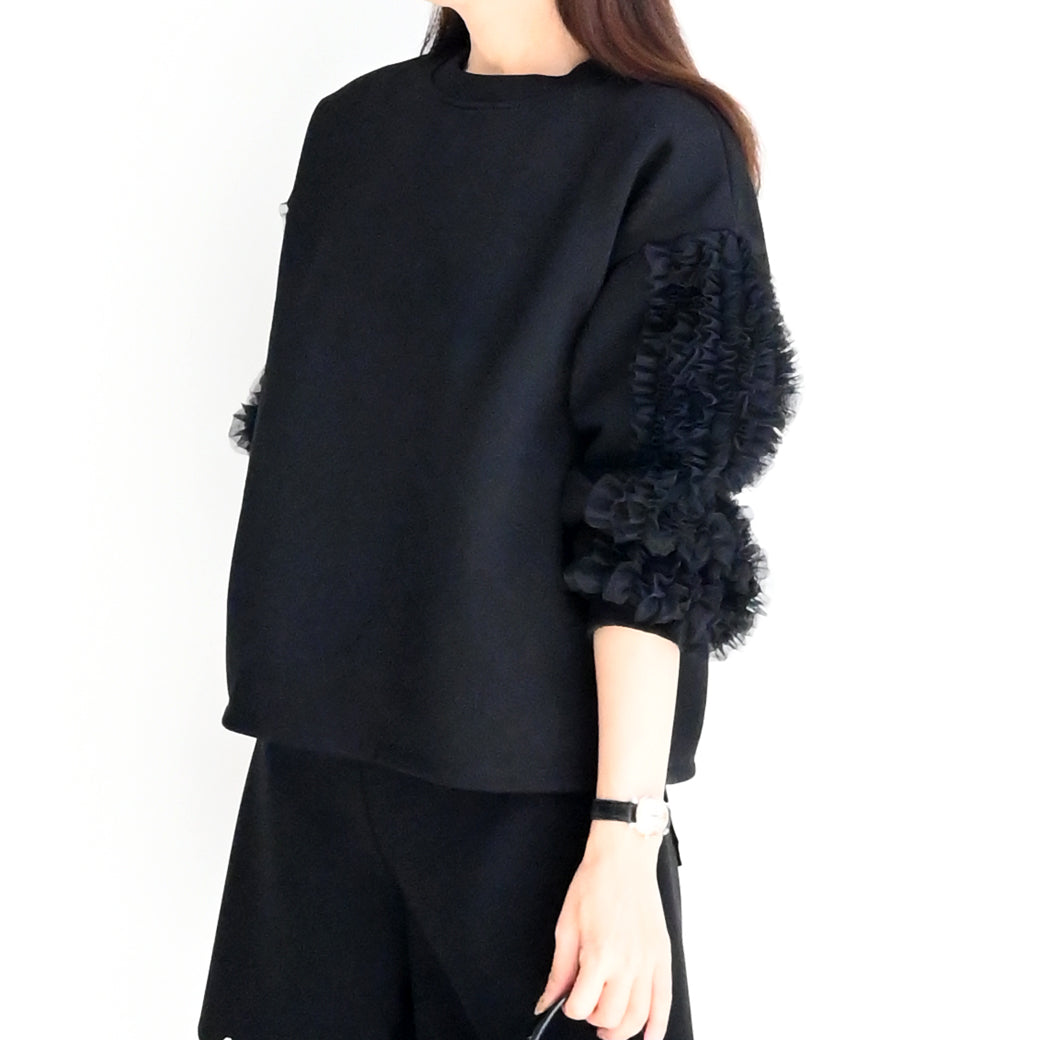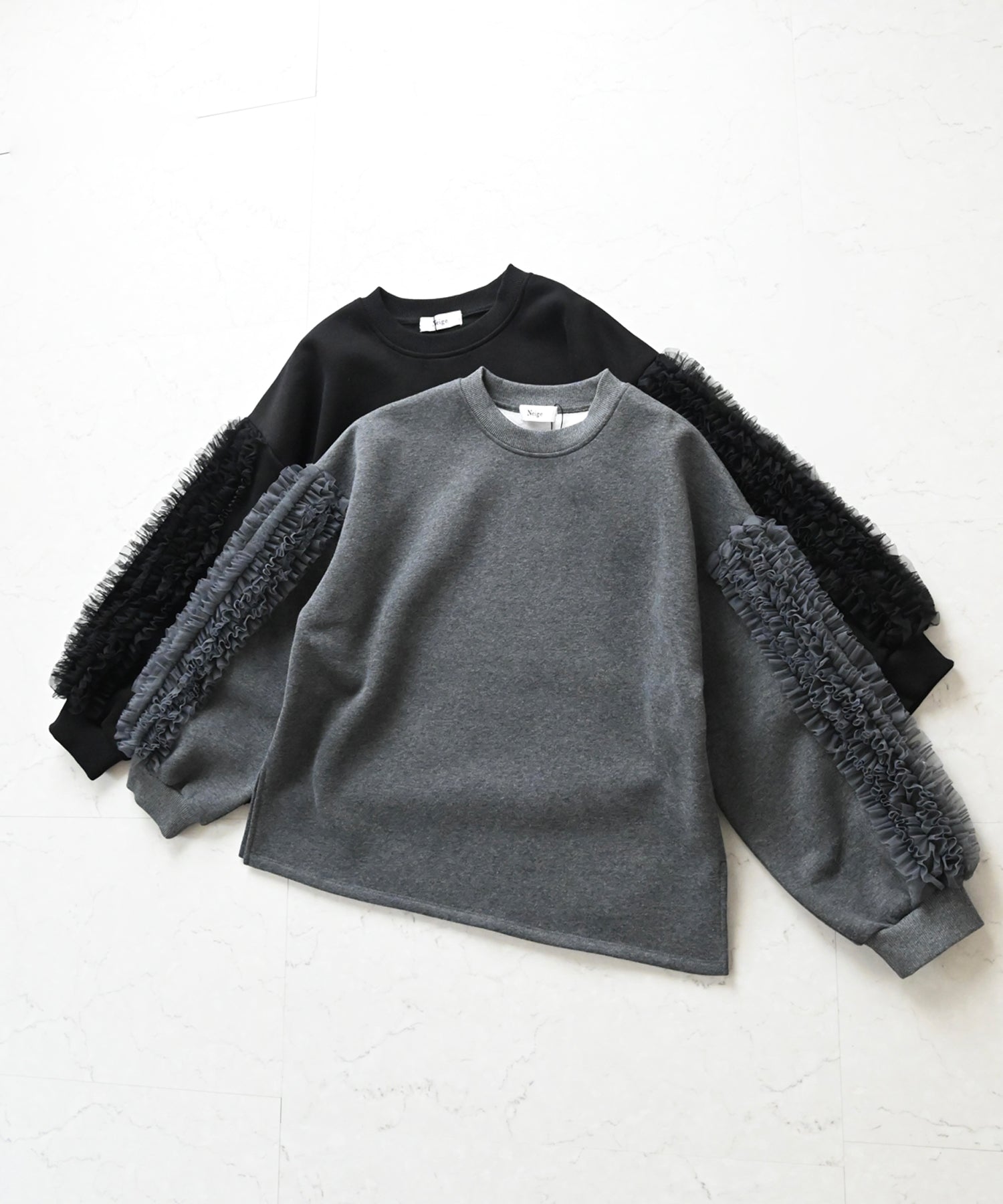 ◾️仕様:長袖/袖チュールフリル(密集ボリューム)/クルーネック/裏起毛素材