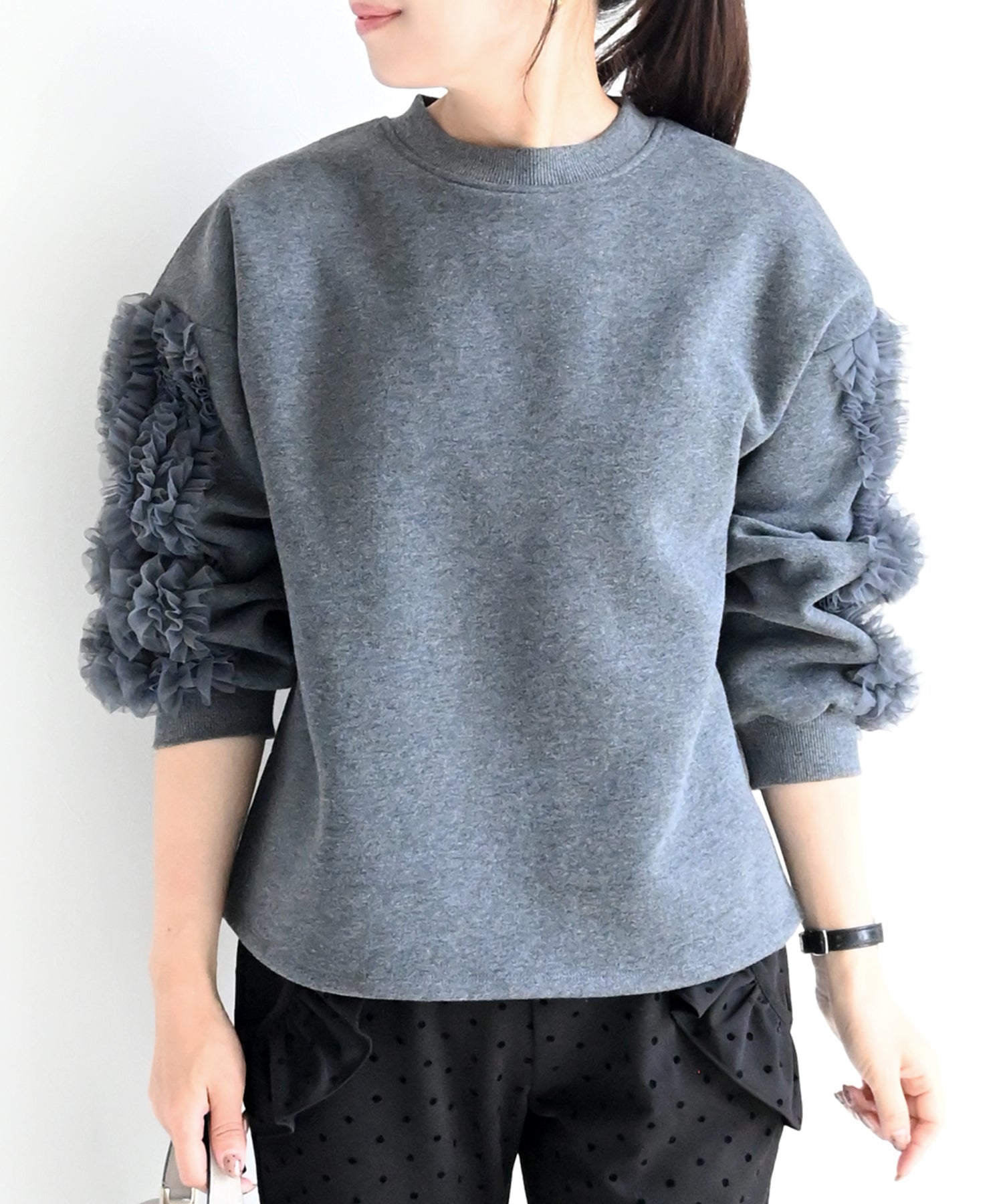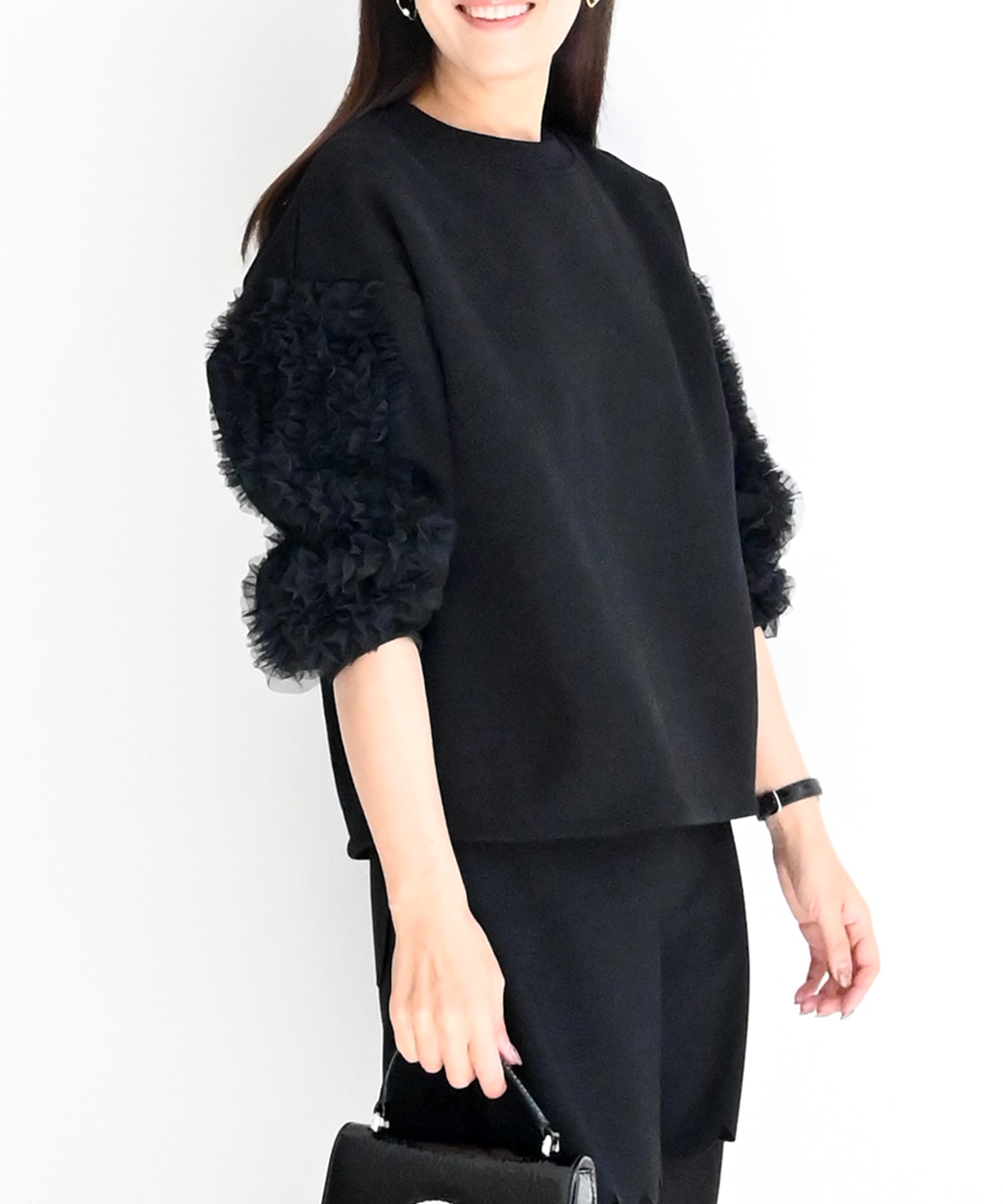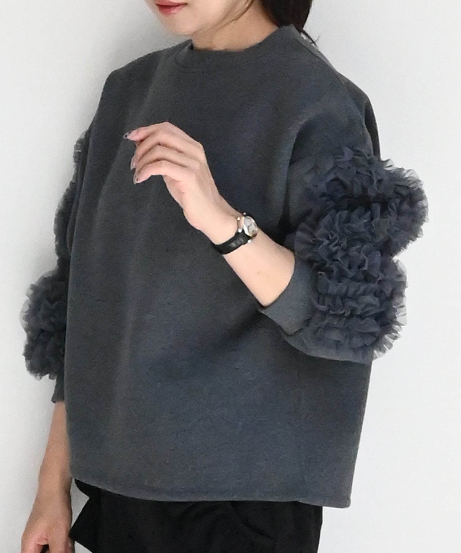 袖にはチュールをぎゅっと重ねた立体フリルを施し、カジュアルなコーデにひとさじの華やぎをプラス。