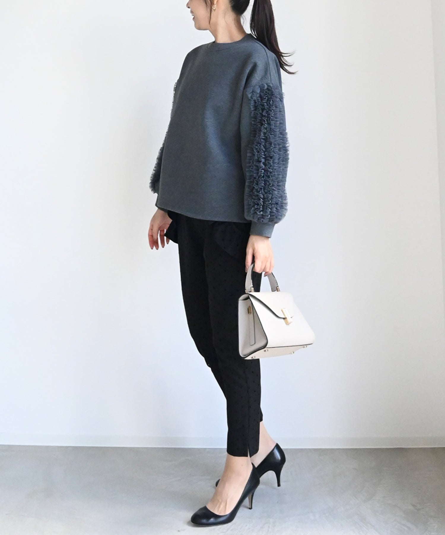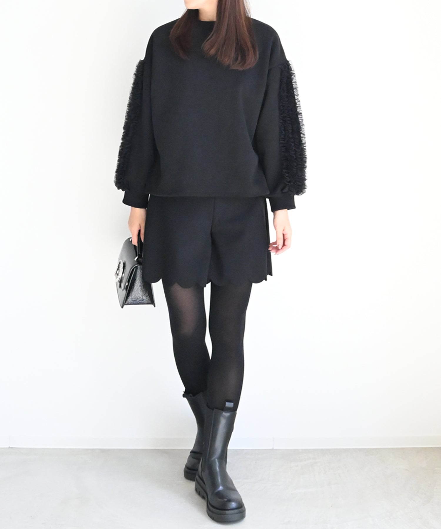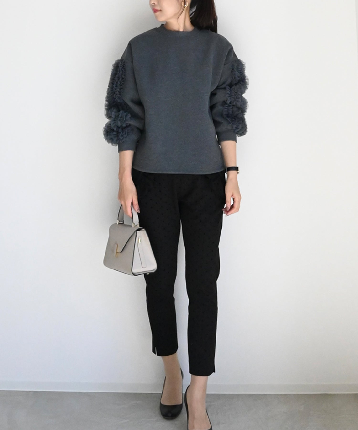 袖にはチュールをぎゅっと重ねた立体フリルを施し、カジュアルなコーデにひとさじの華やぎをプラス。