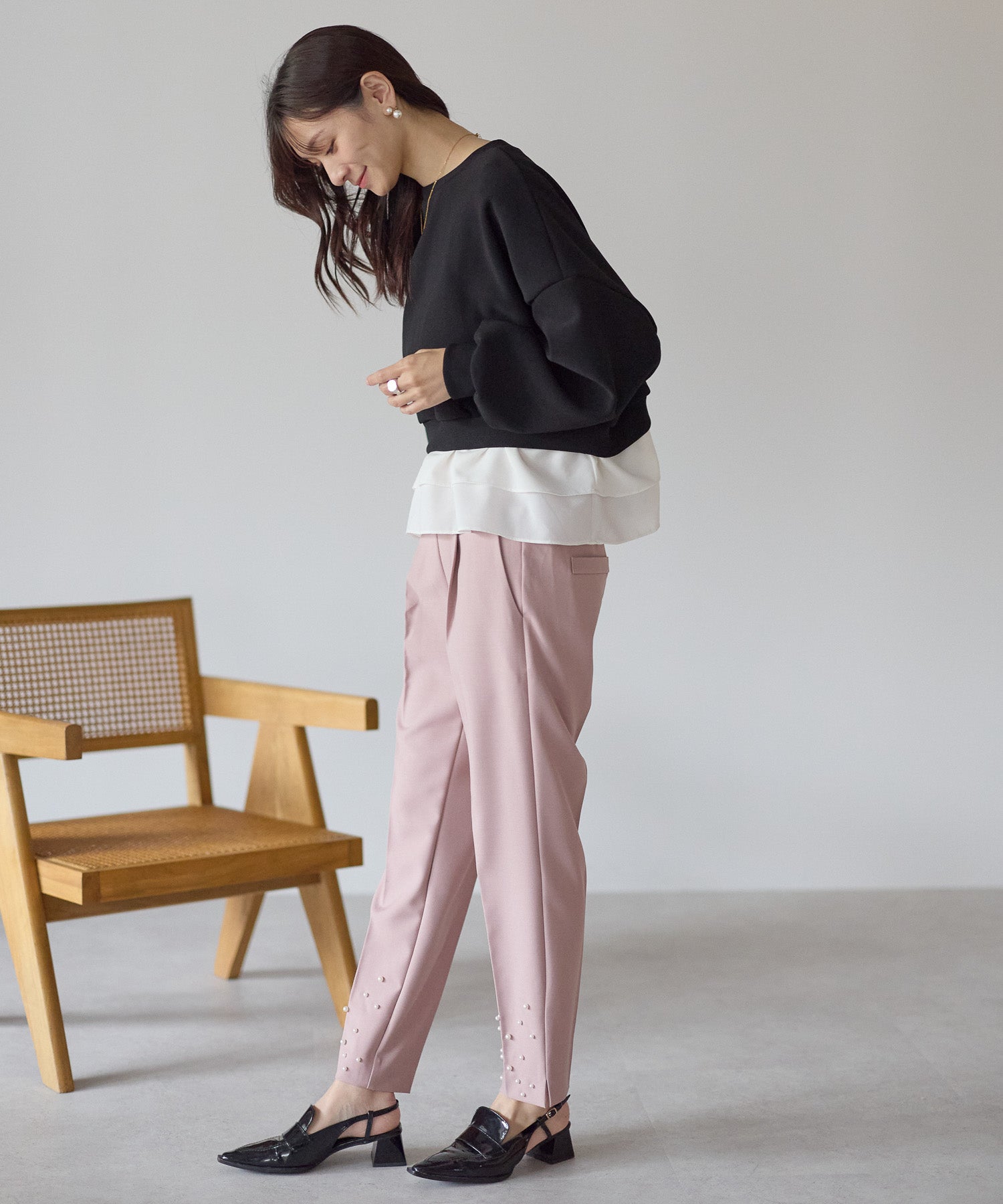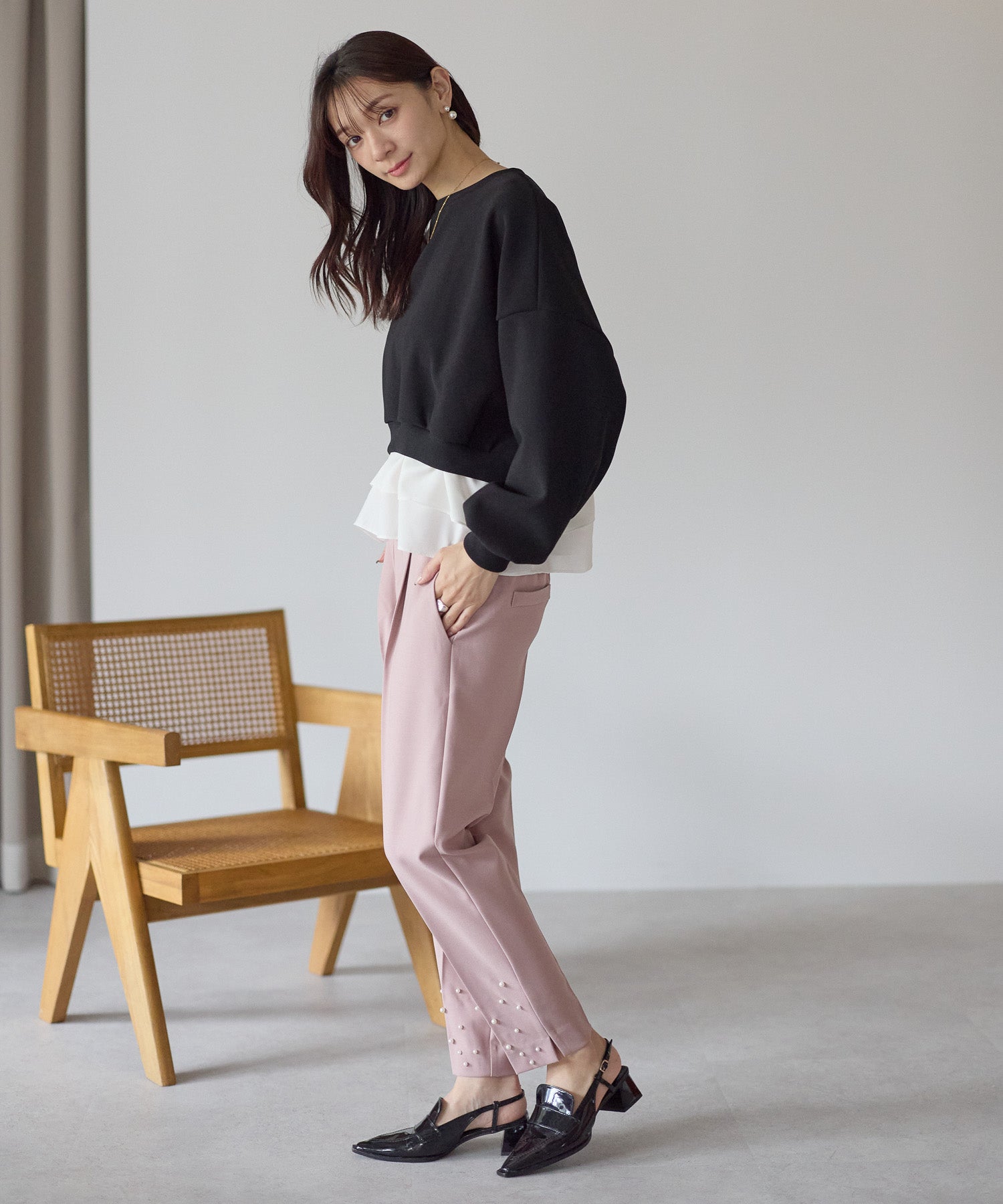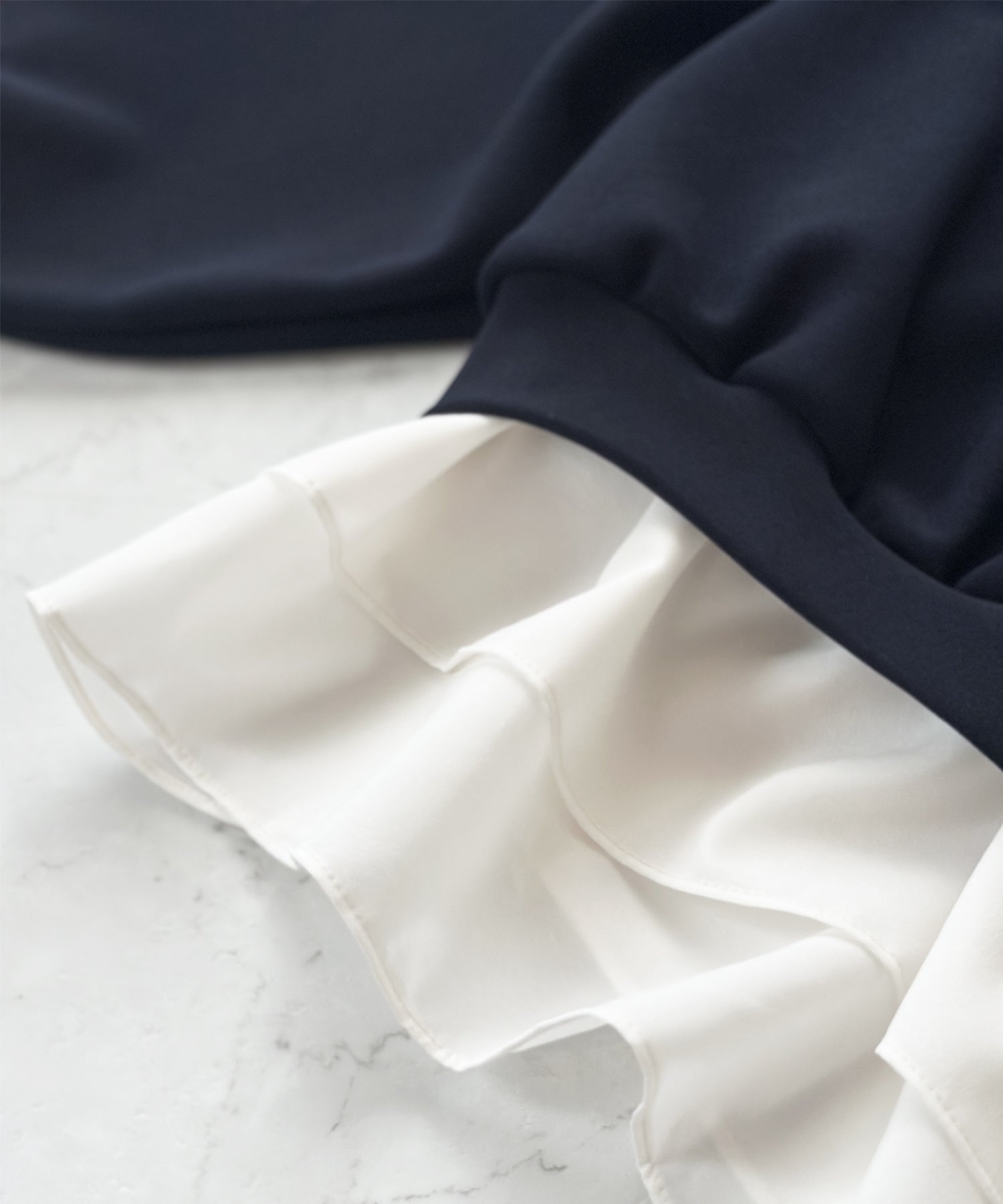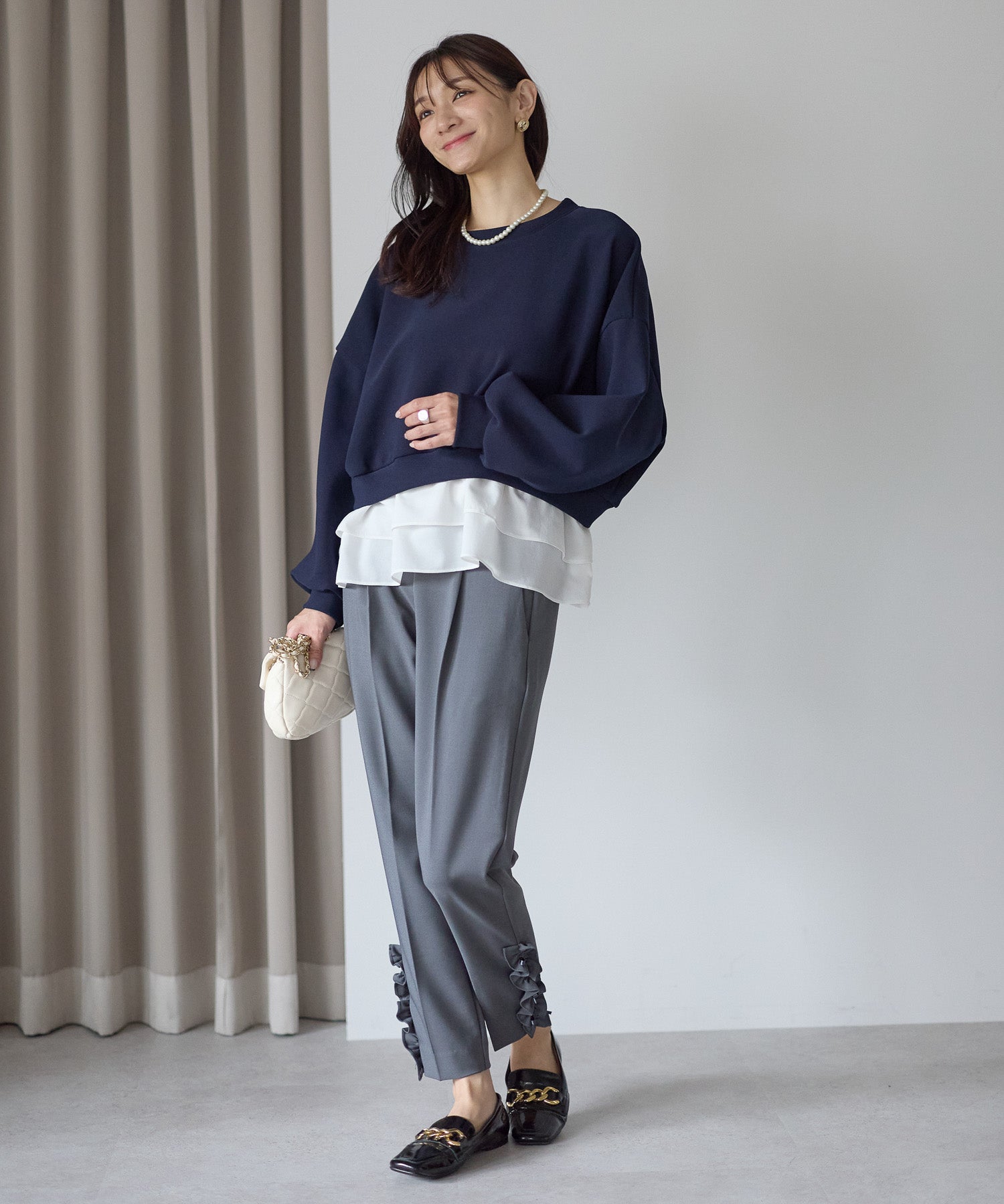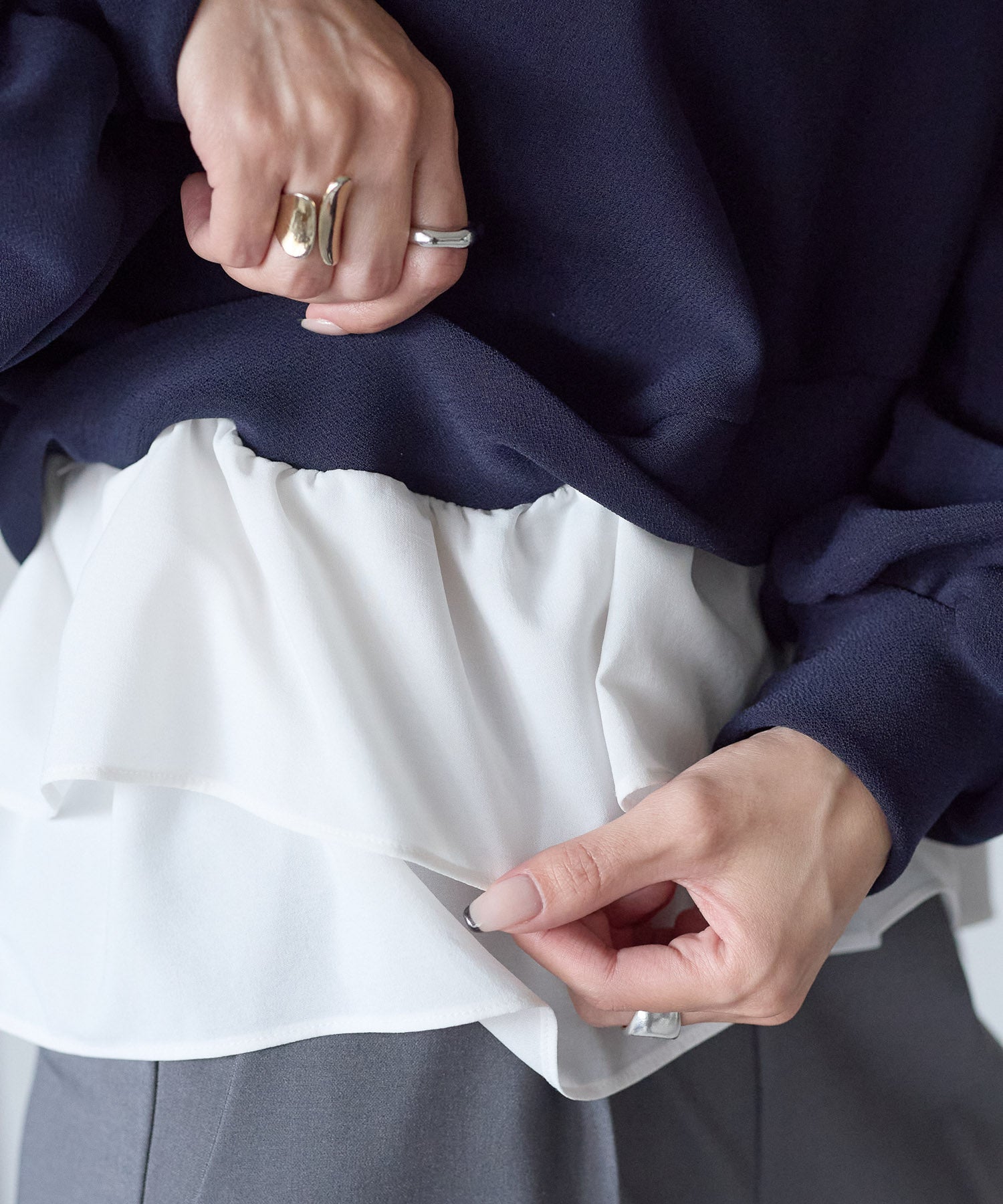 裾からのぞくシフォンフリルを重ねることで、きれいめ生地のトップスに大人フェミニンな表情をプラス。