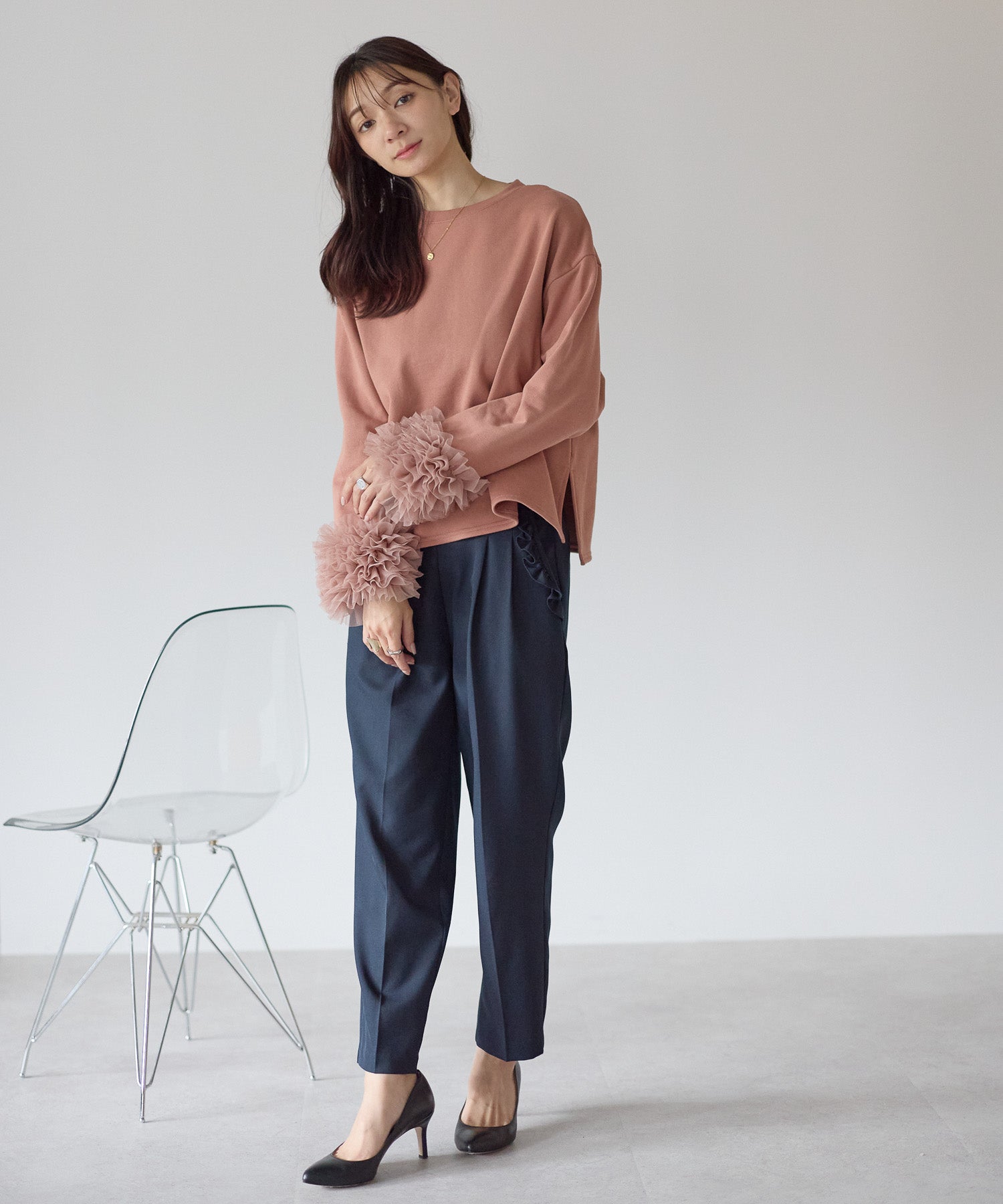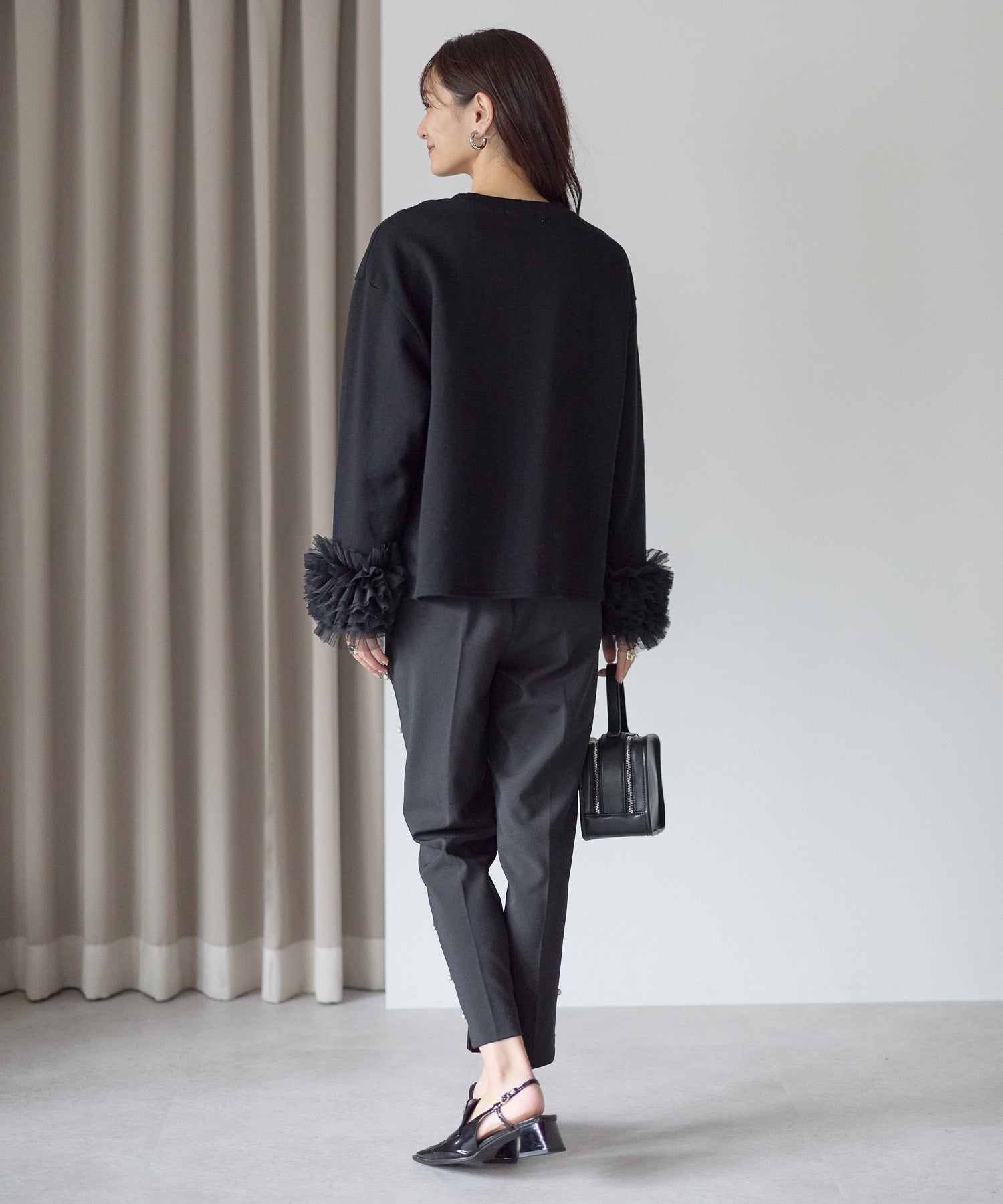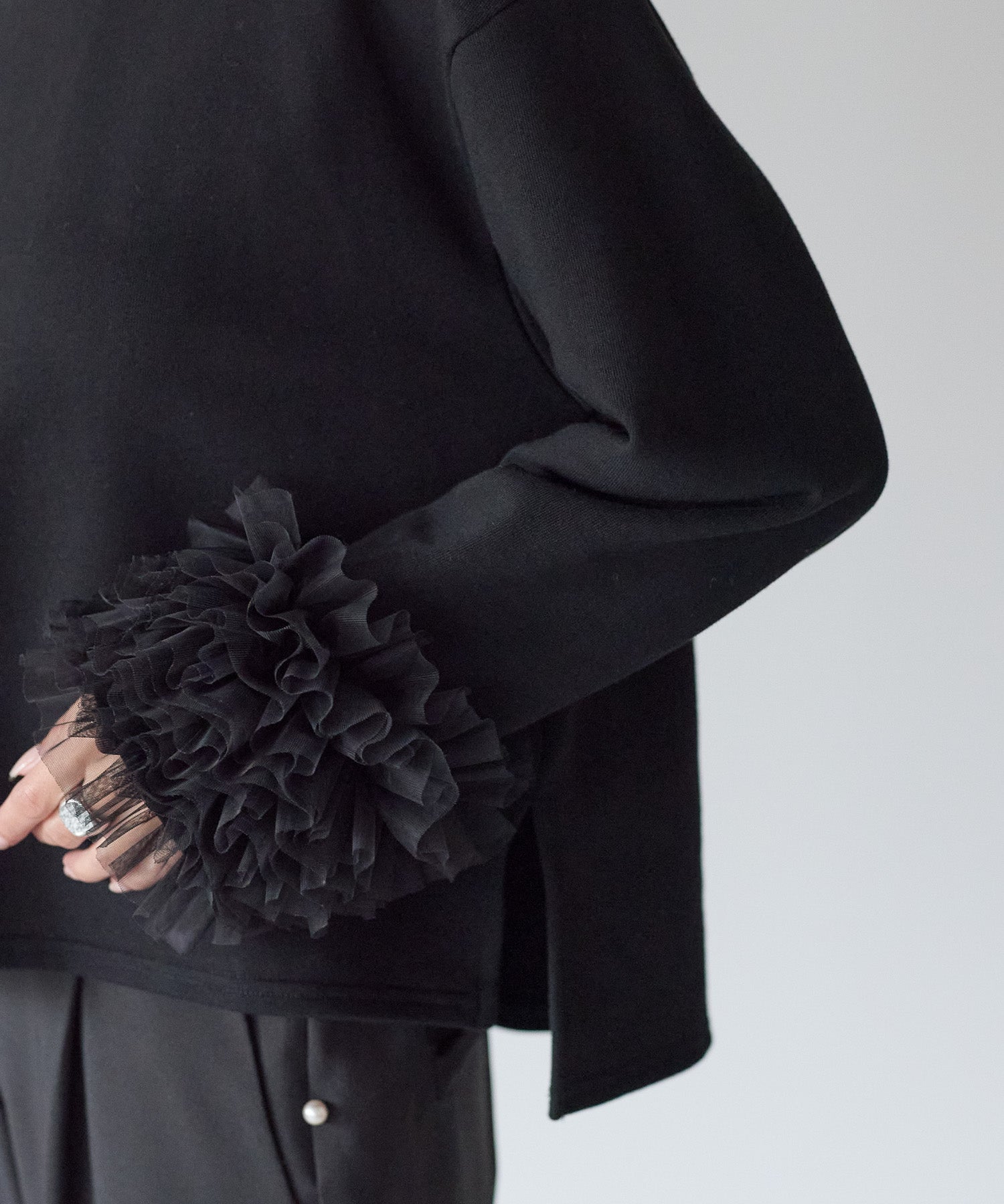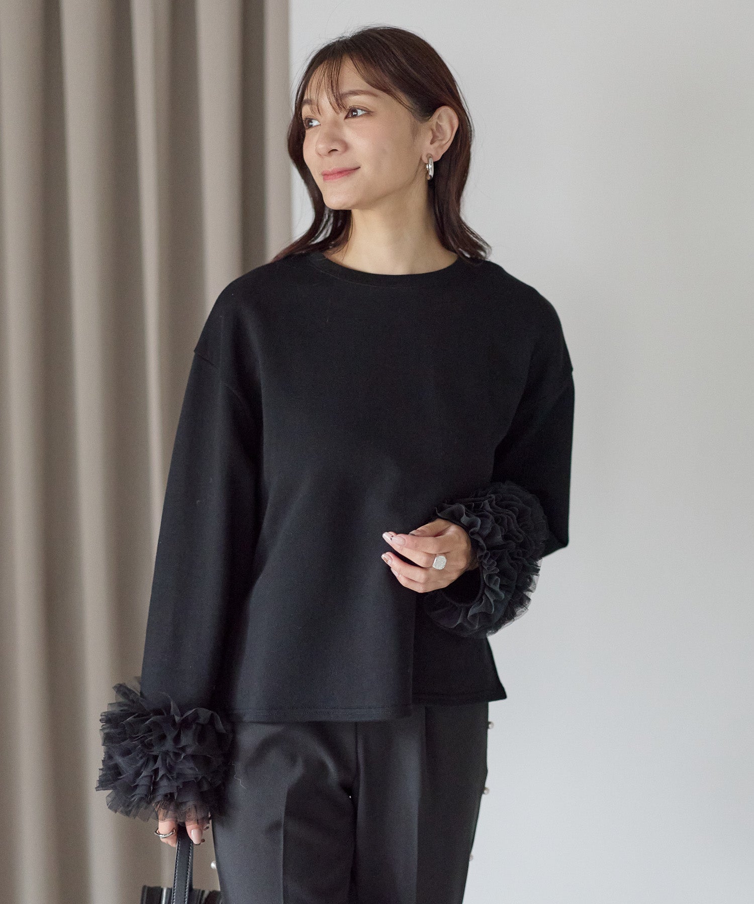 ストンとした程よいリラックス感と、袖口のチュールフリルの存在感をバランスよく掛け合わせたデザイン。