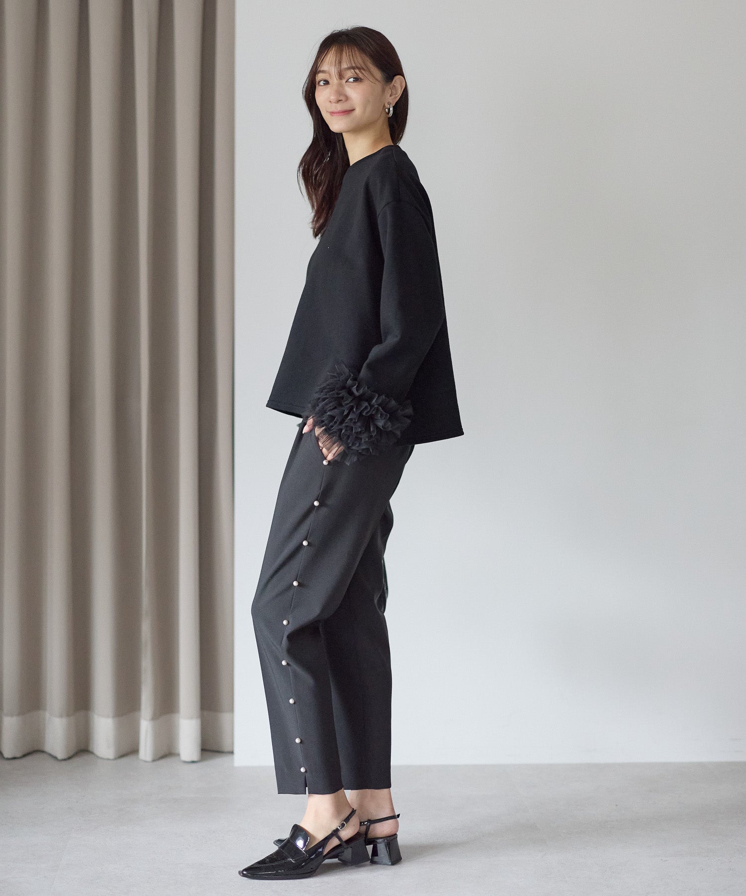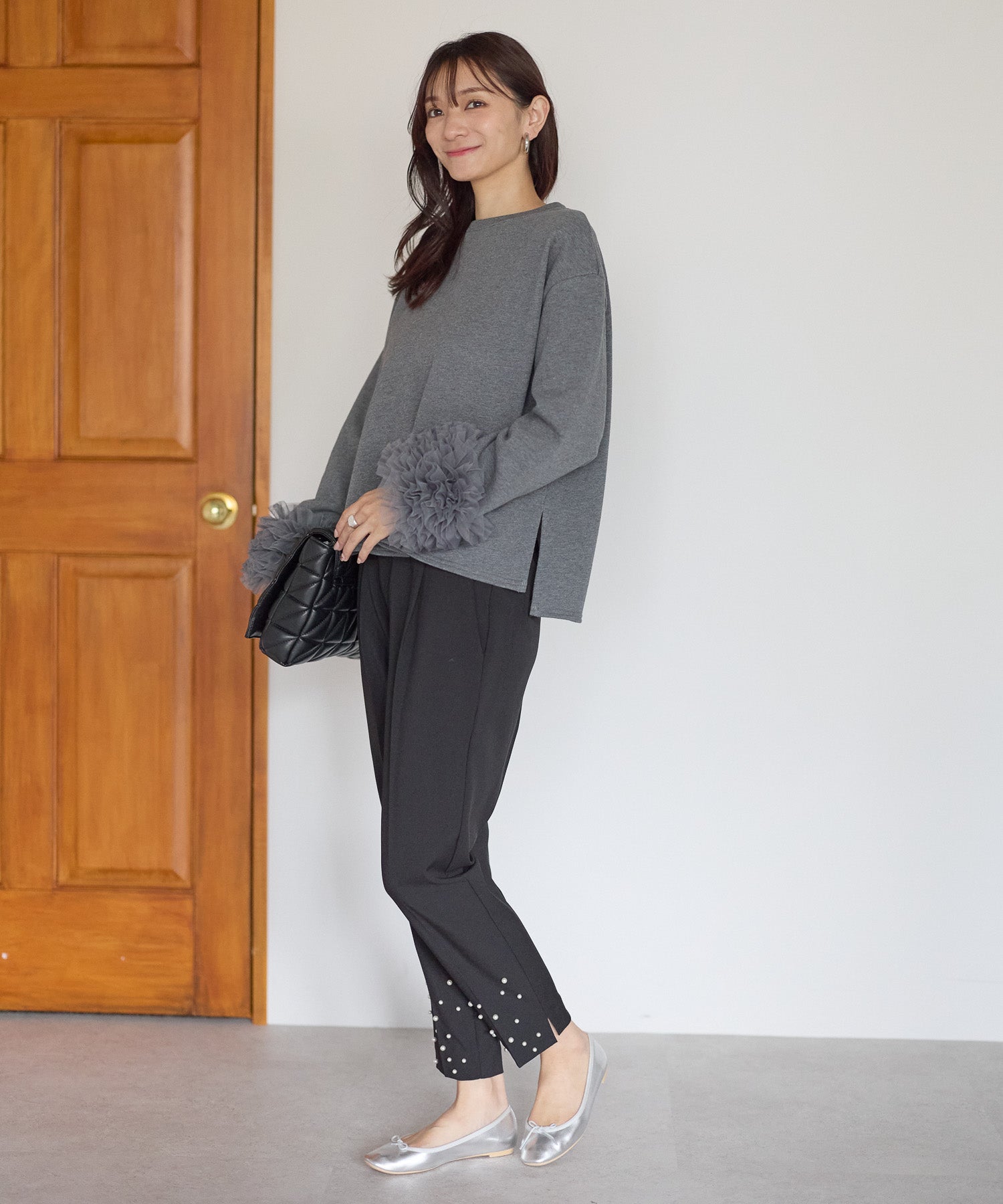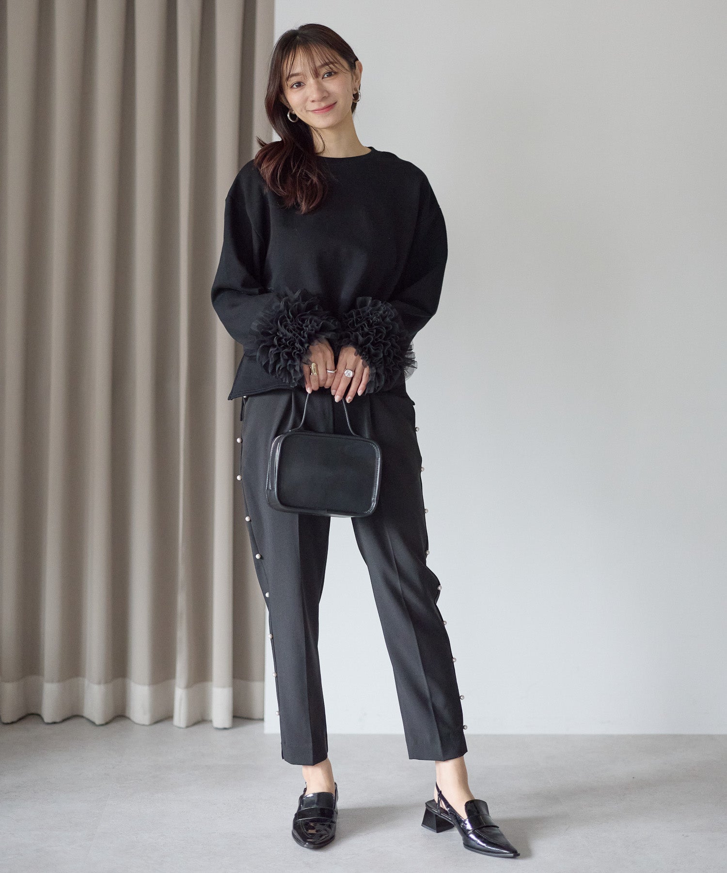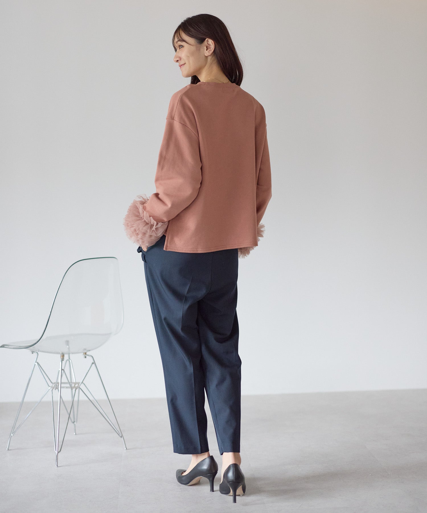 ストンとした程よいリラックス感と、袖口のチュールフリルの存在感をバランスよく掛け合わせたデザイン。